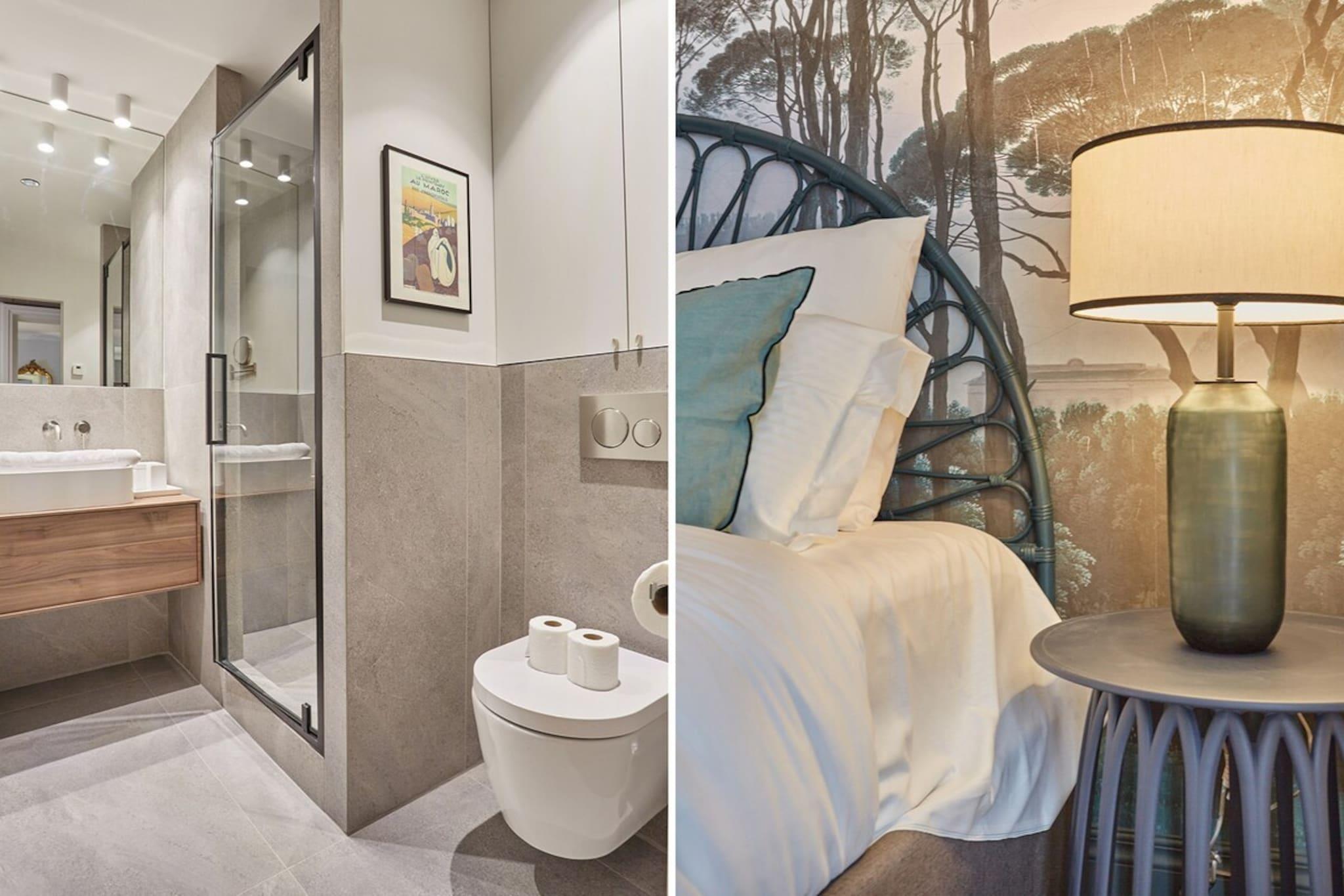 På 1. etage: (Stue(dobbeltsovesofa), Køkken(spisebord, elkedel, brødrister, kaffemaskine, mikrobølgeovn, opvaskemaskine , køleskab, fryser, varme, , , Baking sheet, Wine glasses), soveværelse(Queen Bed), Soveværelse med badeværelse(bruser, toilet, Queen Bed), badeværelse(bruser, toilet), toilet(toilet)) , , , Førstehjælp, Fjernsyn, tørretumbler, vaskemaskine, klimaanlæg, strygejern, føntørrer, , , Carbon monoxide detector, Cleaning products, Coffee, Downtown, Extra pillows and blankets, Room-darkening shades, Shower gel