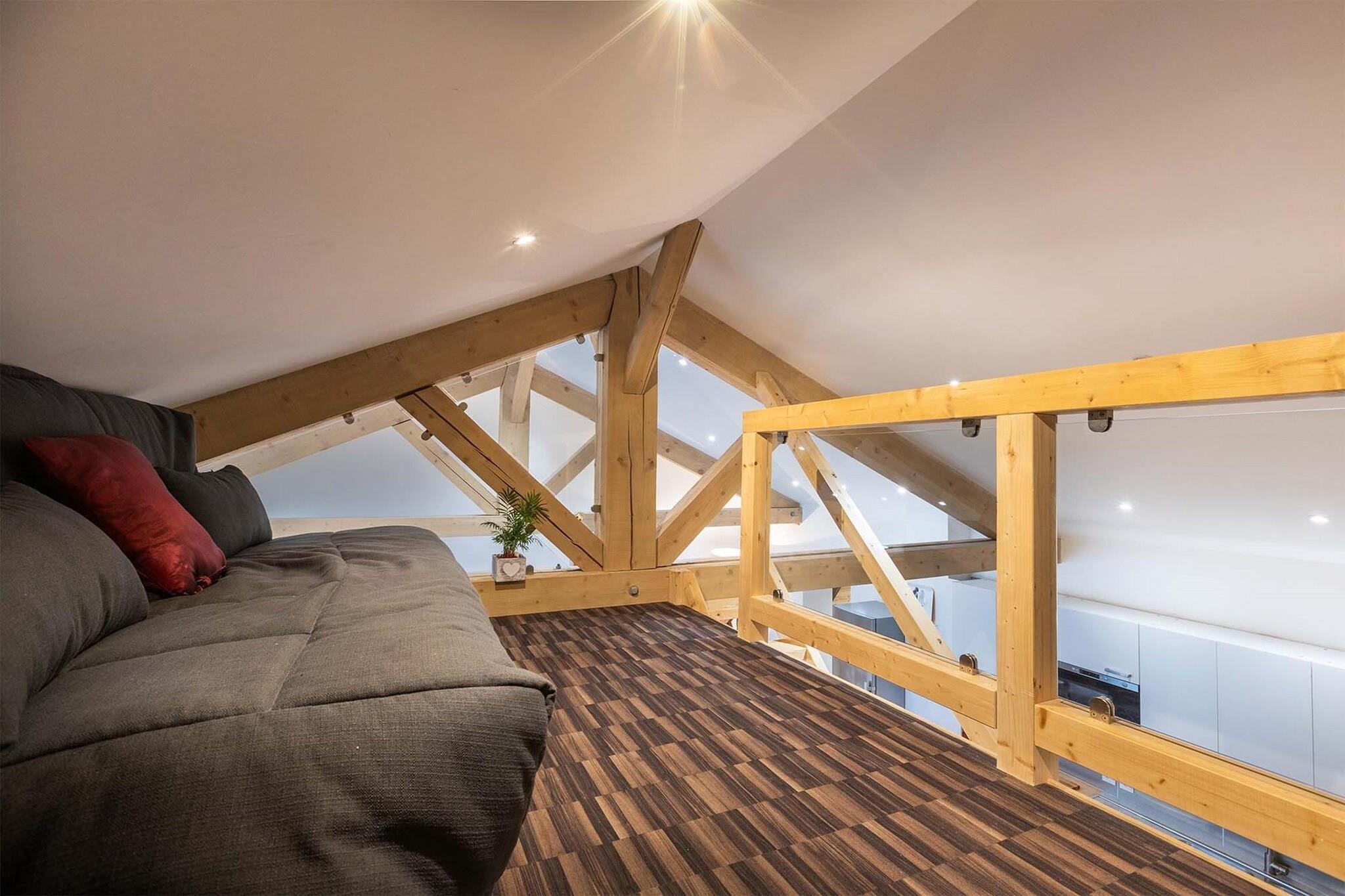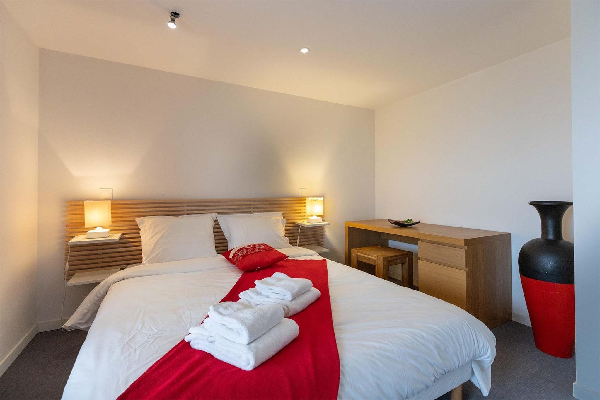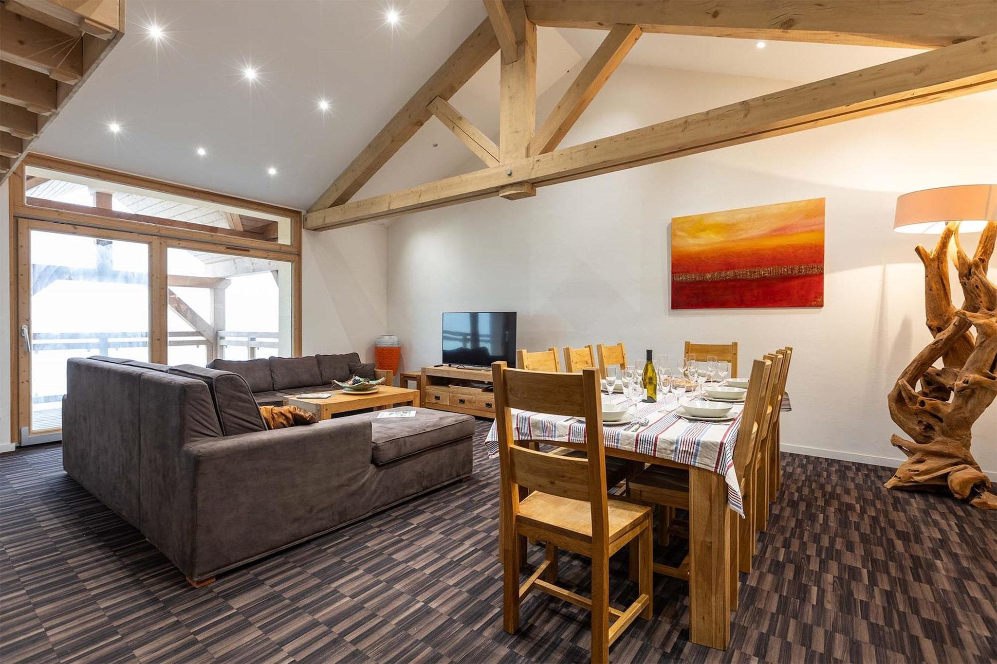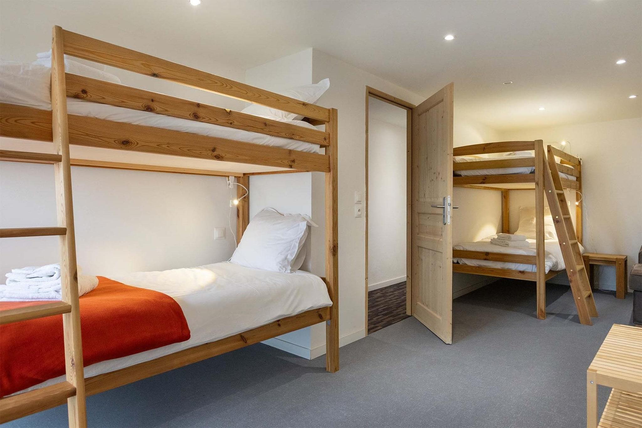 Chalet Les Amis-residensen har en privilegeret beliggenhed mellem Les Arcs og La Plagne, ved porten til den smukke Parc de la Vanoise, beliggende i hjertet af Paradiski-skiområdet. Det har 5 ferielejligheder til 8 til 14 personer og en separat hytte til højst 10 personer, som blev totalrenoveret i 2024. Et fælles spa-område med sauna og spabad tilbyder afslapning efter en lang dag i skiområdet. En gratis shuttlebus tager dig direkte til skiløjperne. Denne lejlighed er beliggende på 3. sal (elevator tilgængelig), selve lejligheden er fordelt på 2 etager og tilbyder enestående udsigt over Nancroix-dalen, bjergene, granskove og Massif de la Vanoise. Fra den store opholdsstue med åbent køkken fører en stejl trappe til sovende galleri med en sovesofa, et soveværelse med eget badeværelse er på stueplan, tre soveværelser, hver med eget badeværelse, er på øverste etage. lejligheden.