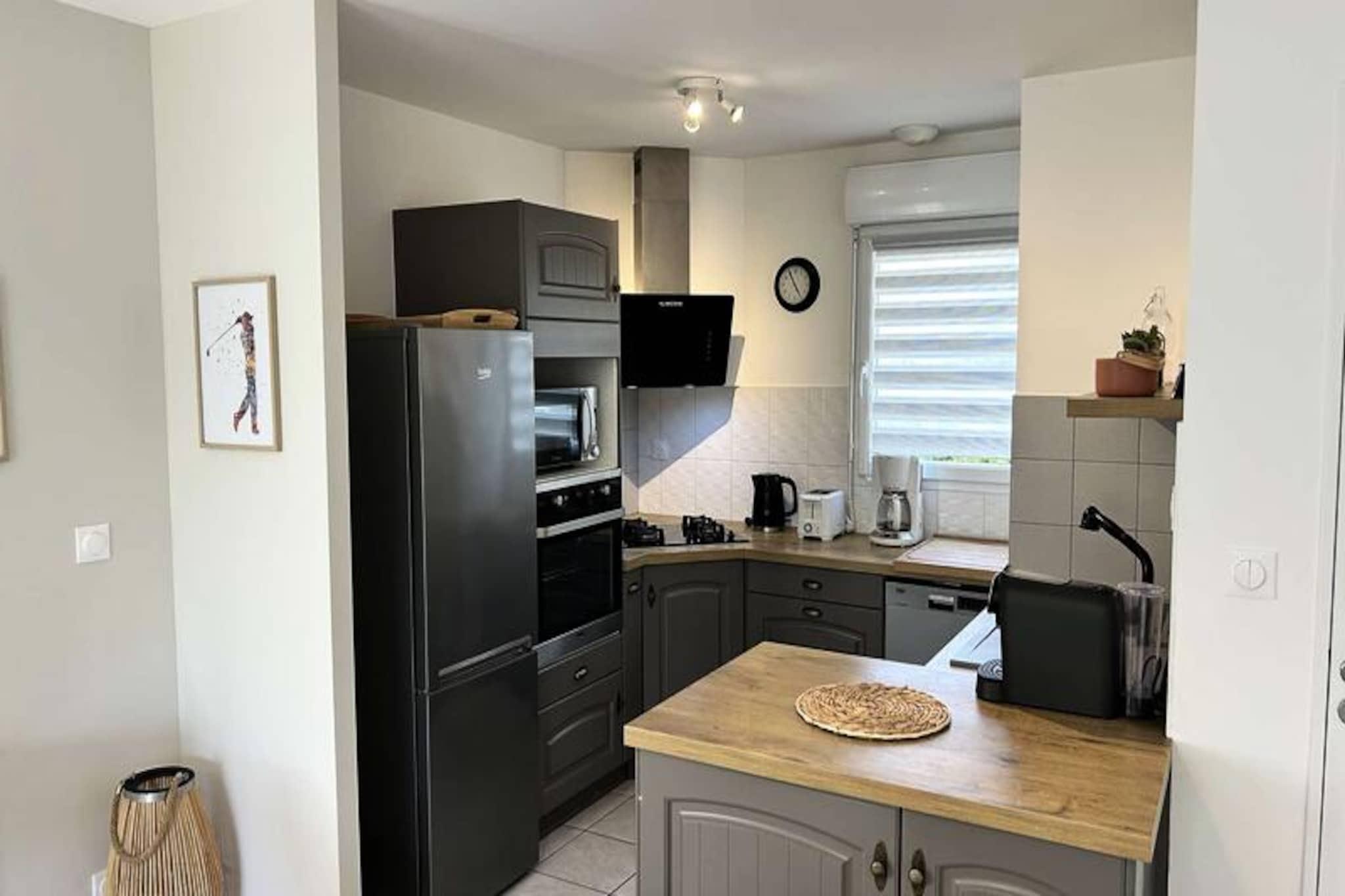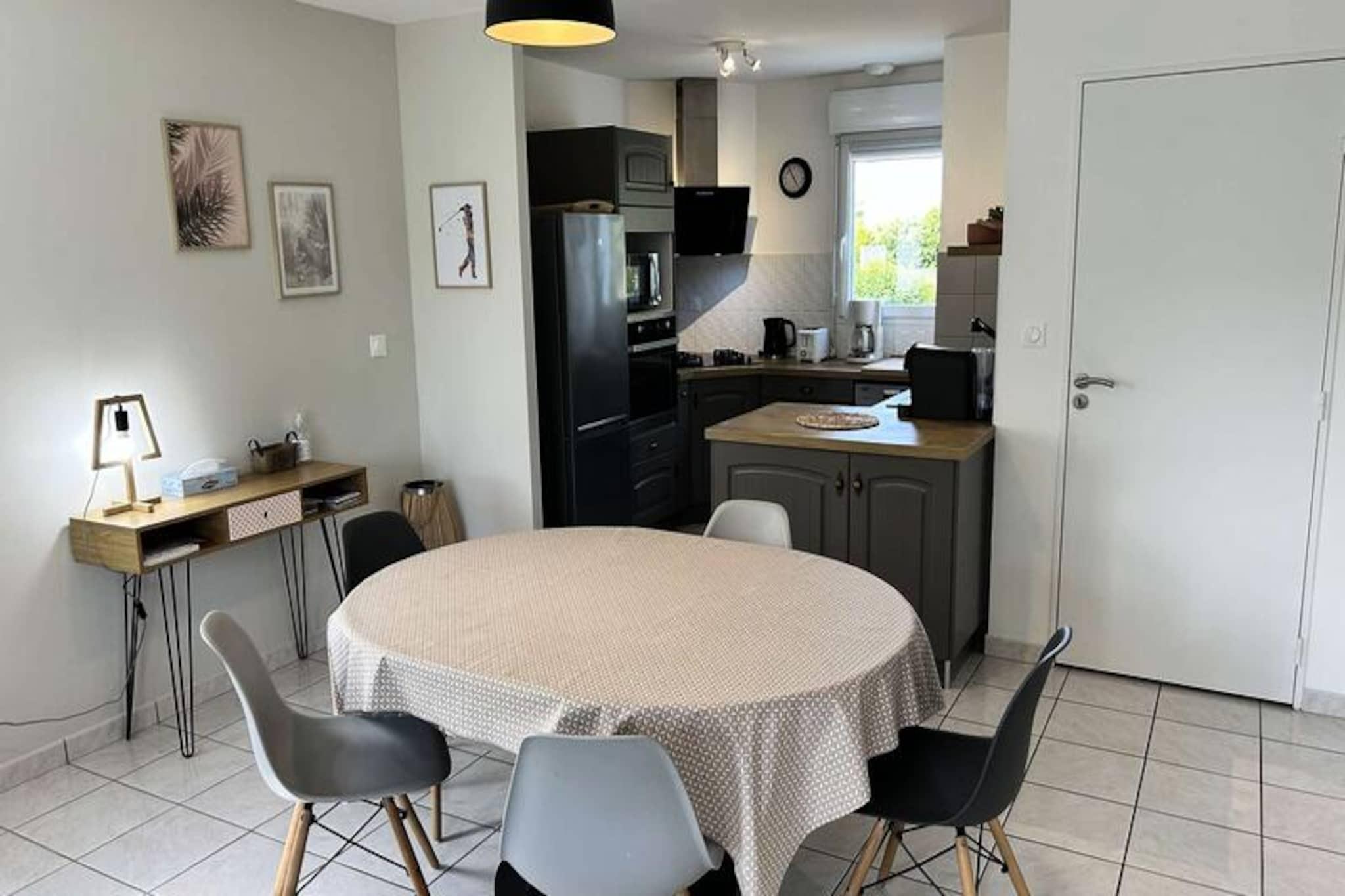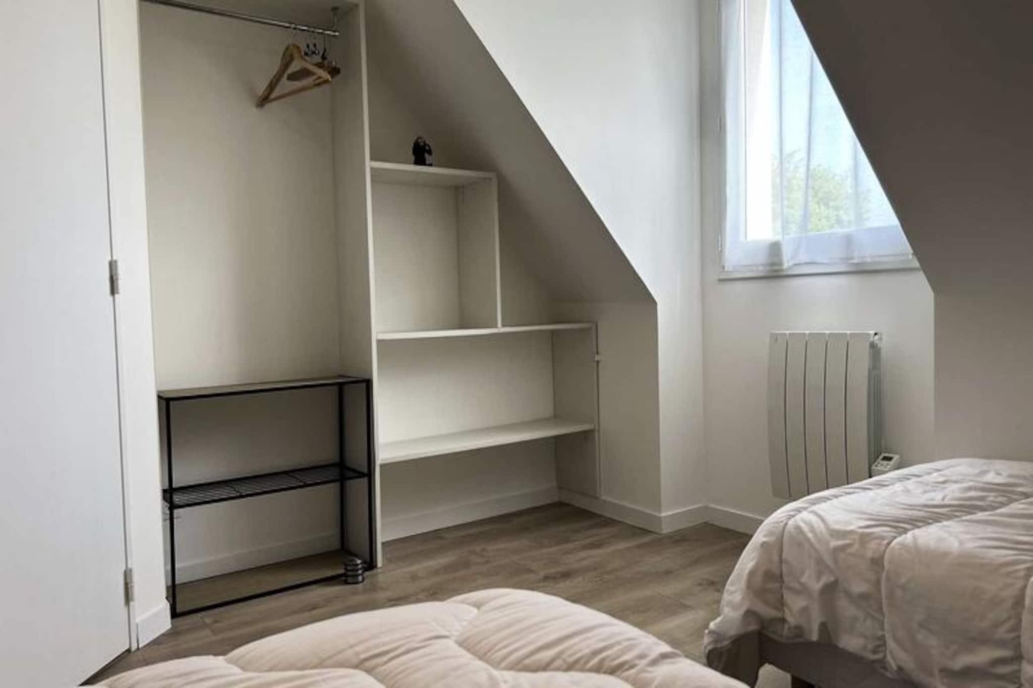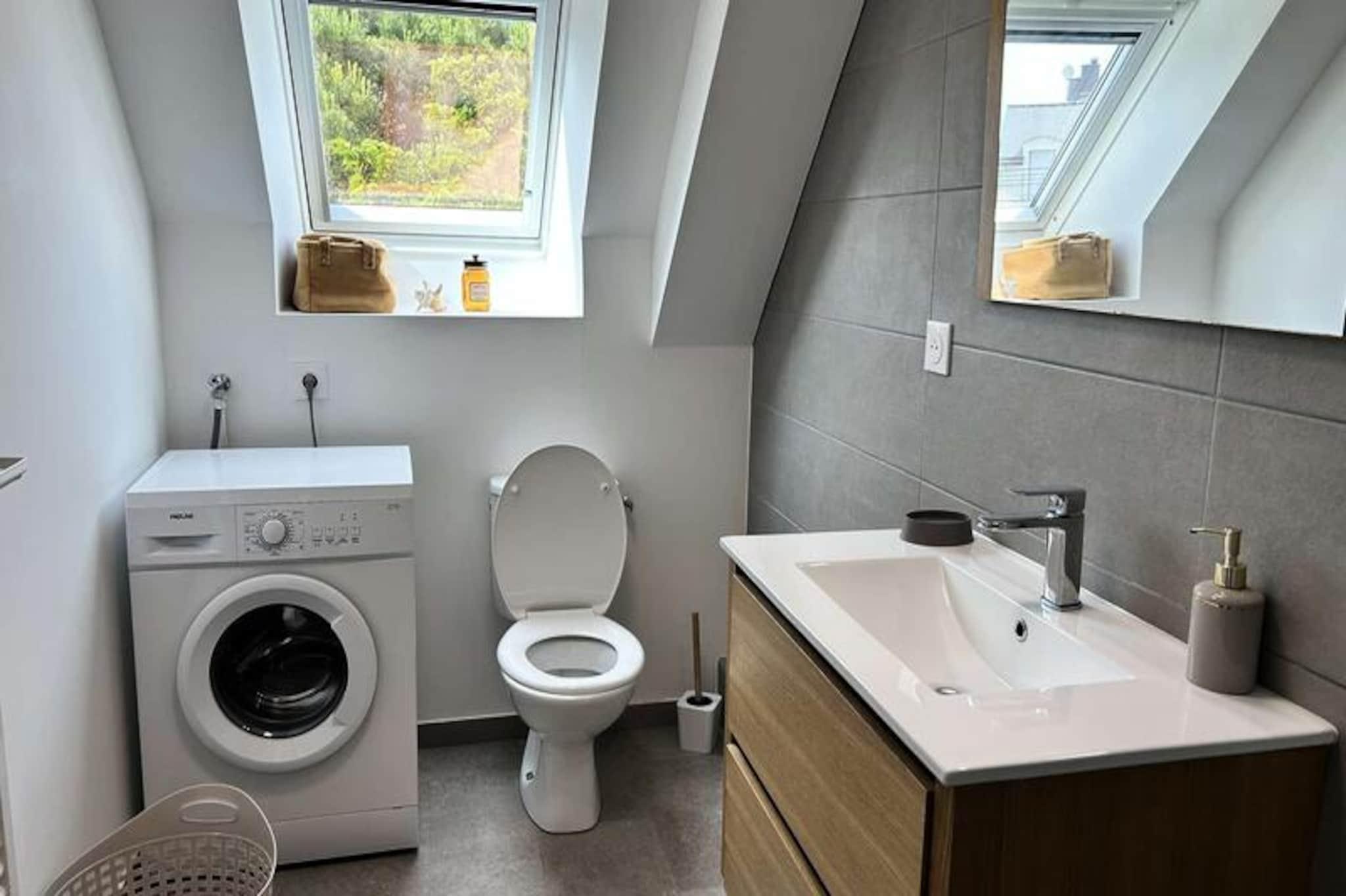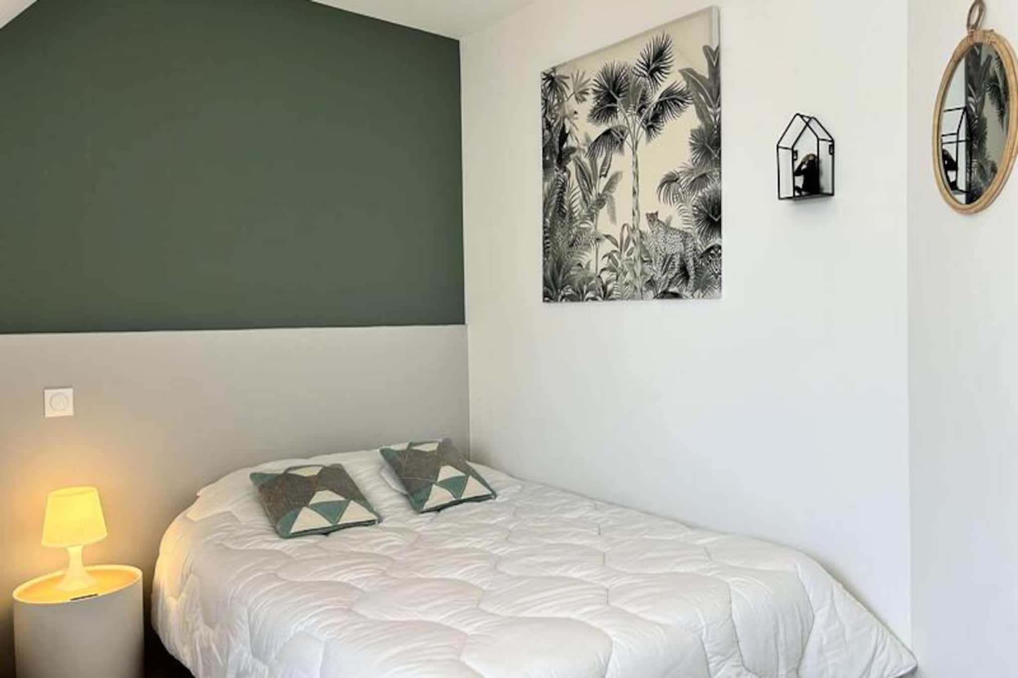 Kun få skridt fra den berømte Pléneuf-Val-André Golfbane tilbyder dette charmerende dobbelthus et roligt tilflugtssted på en privat ejendom med adgang til en fælles indendørs swimmingpool. Denne ejendom er perfekt beliggende til både afslapning og eventyr og inviterer dig til at slappe af midt i Bretagnes kysts skønhed, mens du nyder moderne komfort og nærhed til Vallées-stranden. Uanset om du er golfentusiast eller blot søger en fredelig ferie, tilbyder dette hjem de ideelle rammer for uforglemmelige øjeblikke. \n\nHuset er på 57 m² og er omhyggeligt designet til komfort og praktisk anvendelighed. Stueetagen har en rummelig og solrig stue med et hyggeligt opholdsområde, komplet med sofa, lænestole og tv, samt spiseplads til op til fem gæster. Det åbne køkken er fuldt udstyret med alt hvad du behøver, inklusive gaskomfur, ovn, mikrobølgeovn, køleskab med fryser, opvaskemaskine og kaffemaskiner til din morgenkaffe. Ovenpå finder du to indbydende soveværelser: et med en queensize-seng og det andet med en dobbeltseng og en ekstra enkeltseng, hvilket gør det ideelt for familier eller små grupper. Et moderne badeværelse med bruser og vaskemaskine gør dit ophold endnu mere behageligt. Der er Wi-Fi og gratis parkering foran huset, hvilket sikrer en problemfri oplevelse. \n\nUd over ejendommen er det omkringliggende område fyldt med attraktioner. Spil tee på den nærliggende golfbane, slentre langs sandstranden ved Vallées, eller udforsk de charmerende landsbyer og naturskønne stier i Bretagne. Ejendommens fælles indendørs pool er perfekt til en forfriskende dukkert om sommeren, mens regionens rige kulturarv og kulinariske lækkerier lover uendelige opdagelser. \n\nUanset om du er her på golfferie, en ferie ved havet eller blot for at slappe af i komfort, er dette dejlige hus din port til det bedste af Bretagne. Book dit ophold og skab varige minder i disse idylliske omgivelser.
