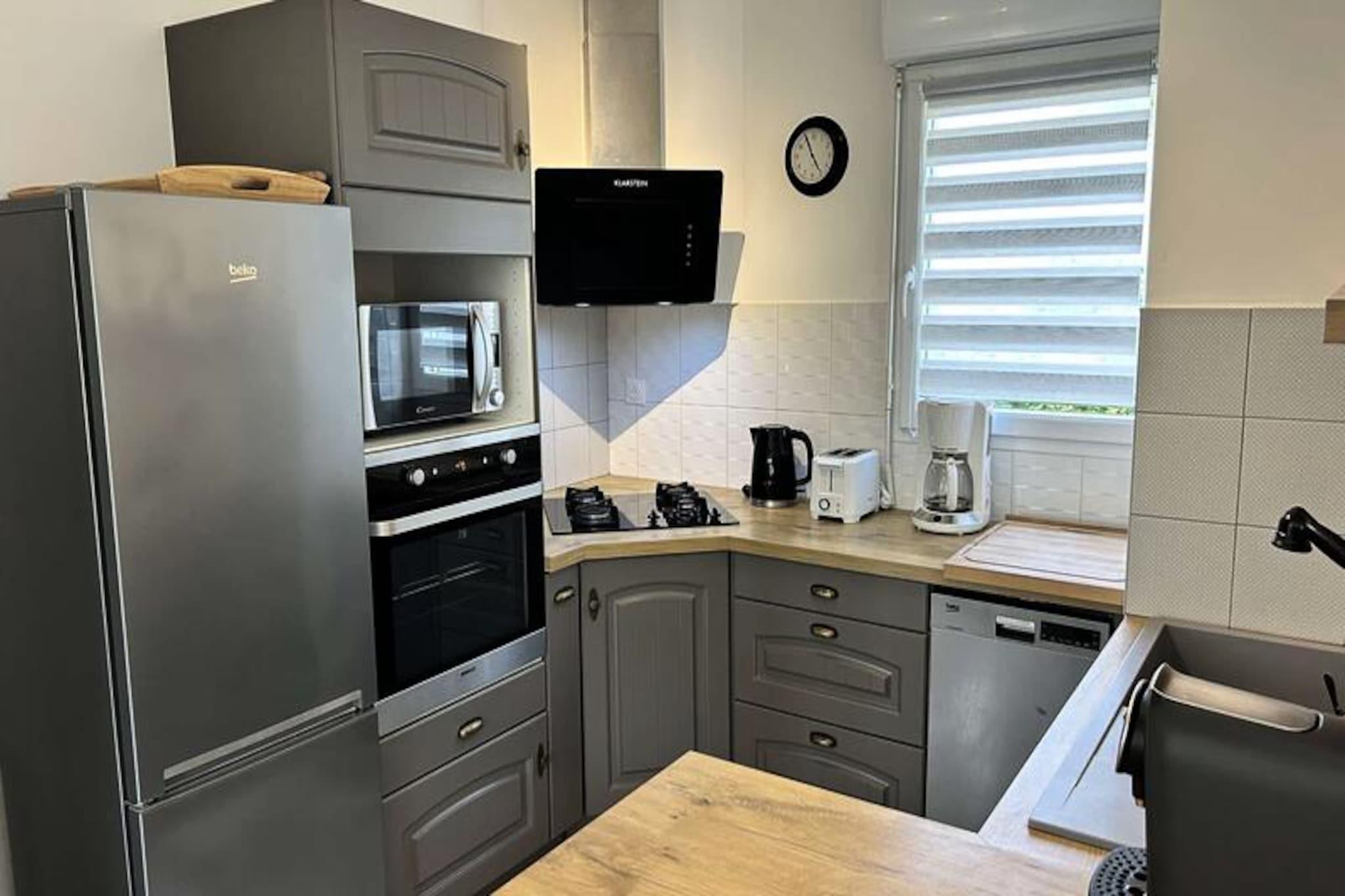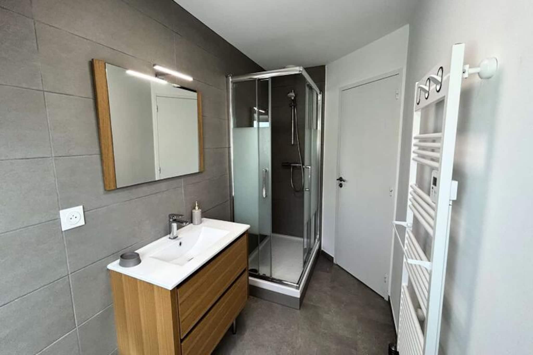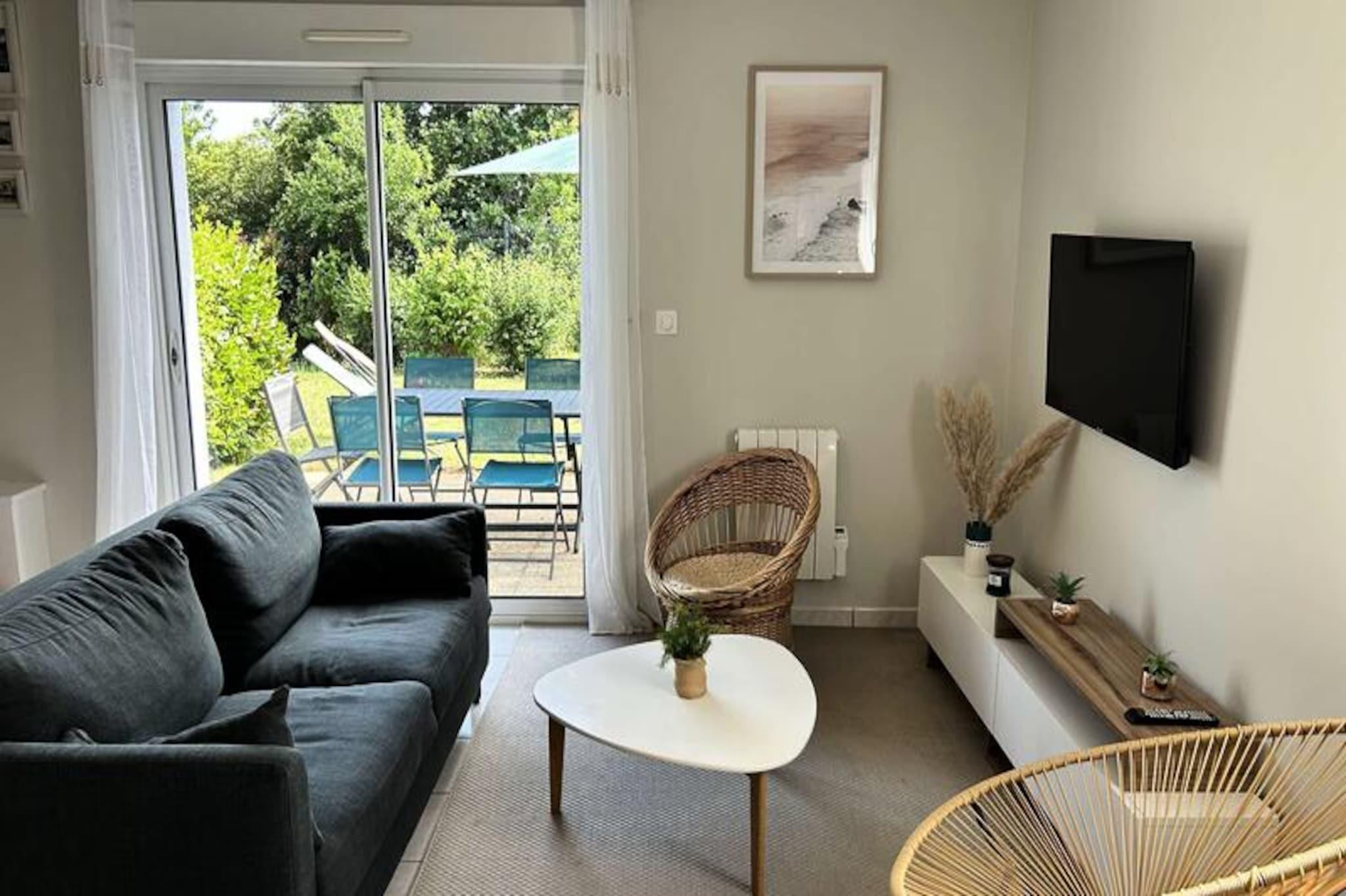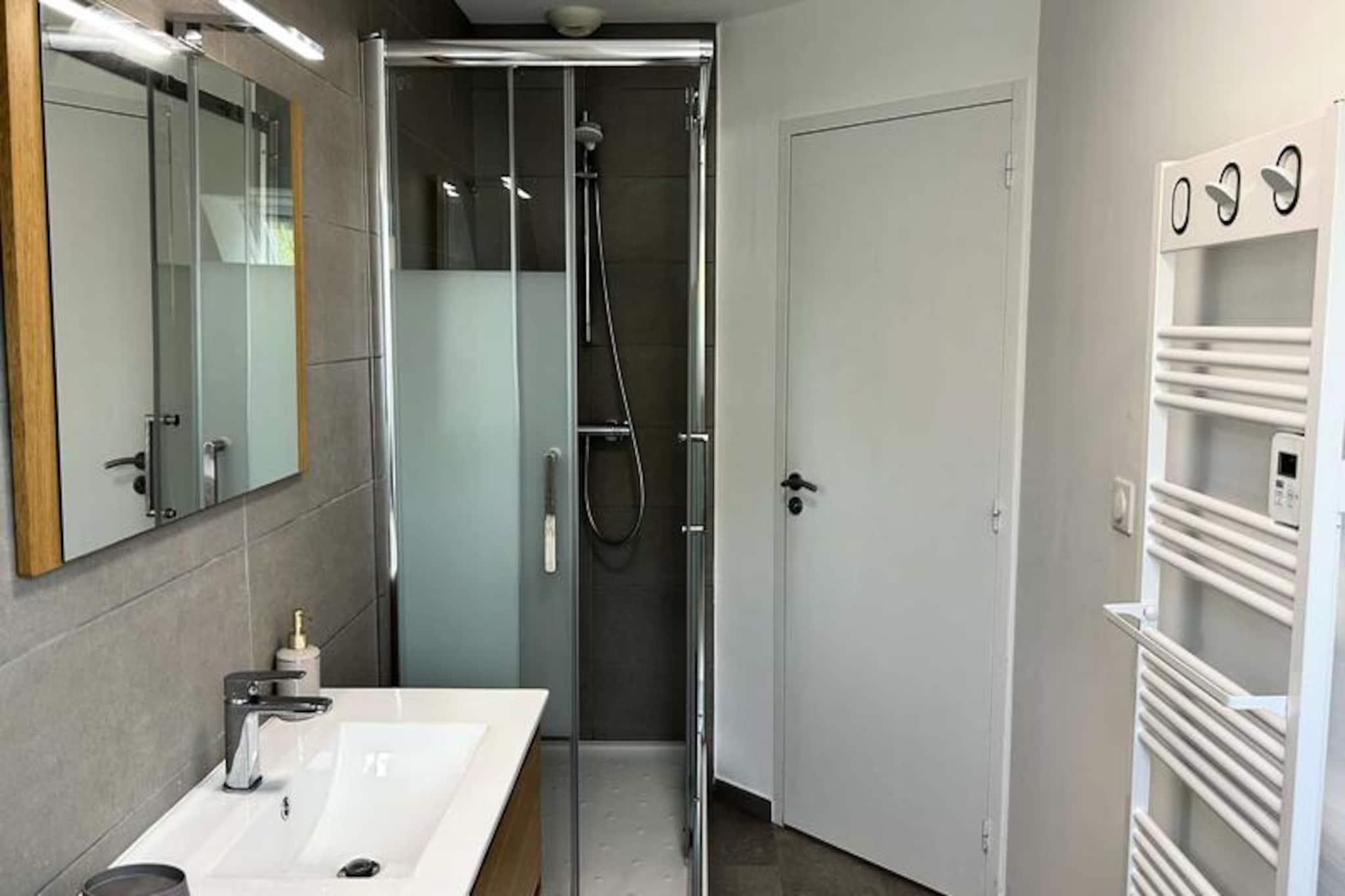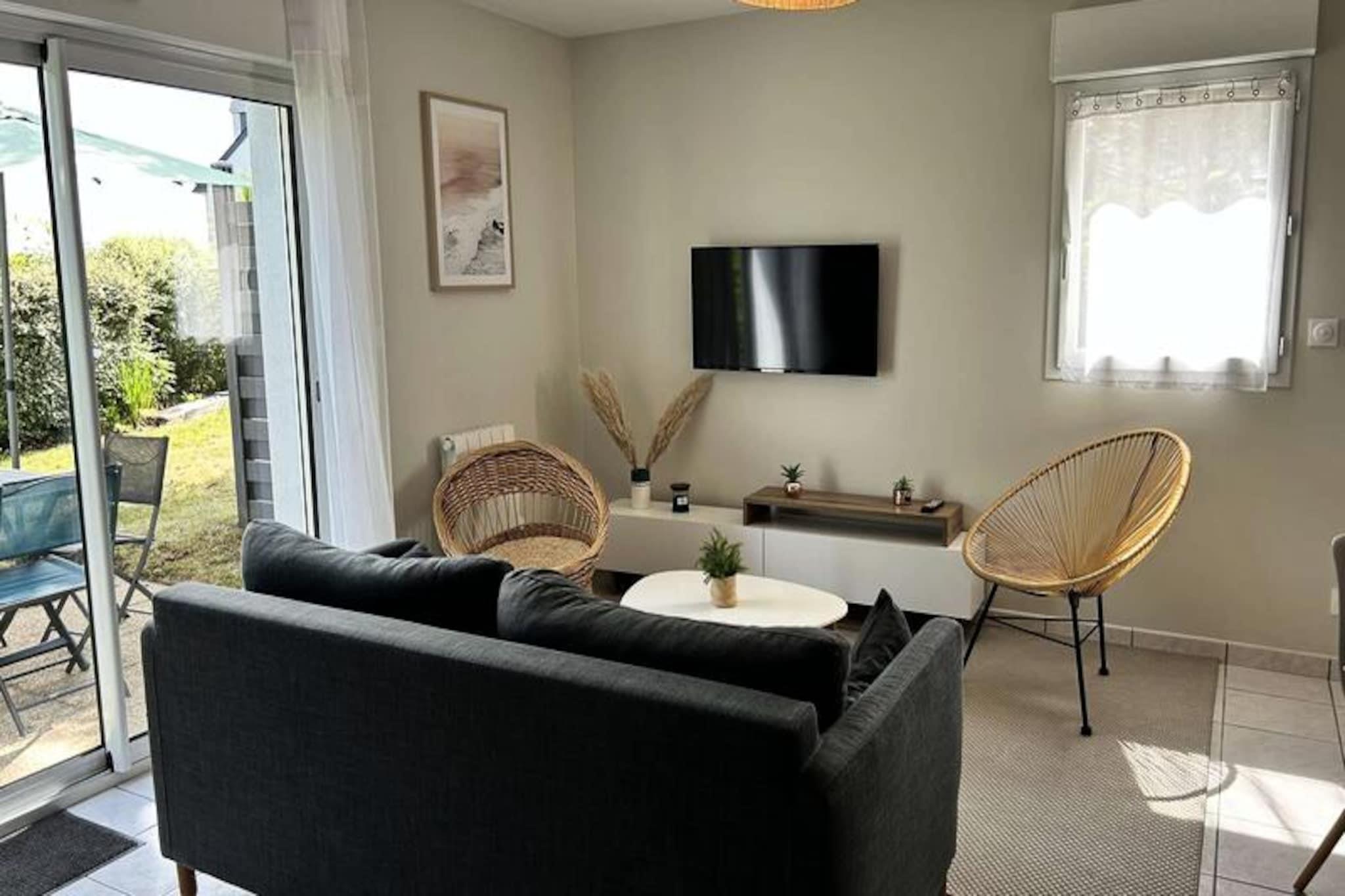 Kun få skridt fra den berømte Pléneuf-Val-André Golfbane tilbyder dette charmerende dobbelthus et roligt tilflugtssted på en privat ejendom med adgang til en fælles indendørs swimmingpool. Denne ejendom er perfekt beliggende til både afslapning og eventyr og inviterer dig til at slappe af midt i Bretagnes kysts skønhed, mens du nyder moderne komfort og nærhed til Vallées-stranden. Uanset om du er golfentusiast eller blot søger en fredelig ferie, tilbyder dette hjem de ideelle rammer for uforglemmelige øjeblikke. \n\nHuset er på 57 m² og er omhyggeligt designet til komfort og praktisk anvendelighed. Stueetagen har en rummelig og solrig stue med et hyggeligt opholdsområde, komplet med sofa, lænestole og tv, samt spiseplads til op til fem gæster. Det åbne køkken er fuldt udstyret med alt hvad du behøver, inklusive gaskomfur, ovn, mikrobølgeovn, køleskab med fryser, opvaskemaskine og kaffemaskiner til din morgenkaffe. Ovenpå finder du to indbydende soveværelser: et med en queensize-seng og det andet med en dobbeltseng og en ekstra enkeltseng, hvilket gør det ideelt for familier eller små grupper. Et moderne badeværelse med bruser og vaskemaskine gør dit ophold endnu mere behageligt. Der er Wi-Fi og gratis parkering foran huset, hvilket sikrer en problemfri oplevelse. \n\nUd over ejendommen er det omkringliggende område fyldt med attraktioner. Spil tee på den nærliggende golfbane, slentre langs sandstranden ved Vallées, eller udforsk de charmerende landsbyer og naturskønne stier i Bretagne. Ejendommens fælles indendørs pool er perfekt til en forfriskende dukkert om sommeren, mens regionens rige kulturarv og kulinariske lækkerier lover uendelige opdagelser. \n\nUanset om du er her på golfferie, en ferie ved havet eller blot for at slappe af i komfort, er dette dejlige hus din port til det bedste af Bretagne. Book dit ophold og skab varige minder i disse idylliske omgivelser.