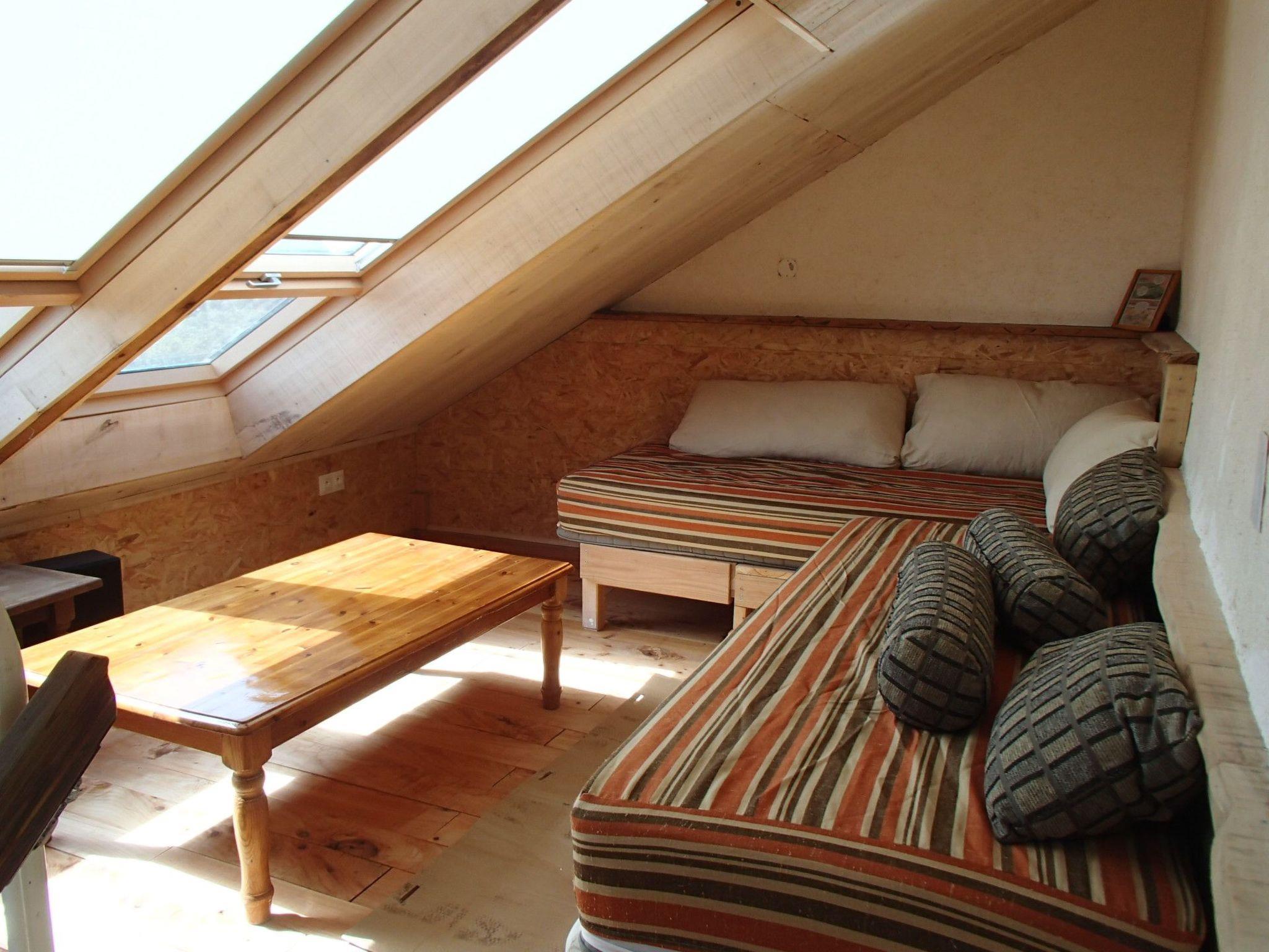 The master bedroom has a double bed and there are 3 beds on the 2nd level, under the eaves, including a pull-out bed and a bunk bed. The 2 benches in the living room provide comfortable extra sleeping space if required.