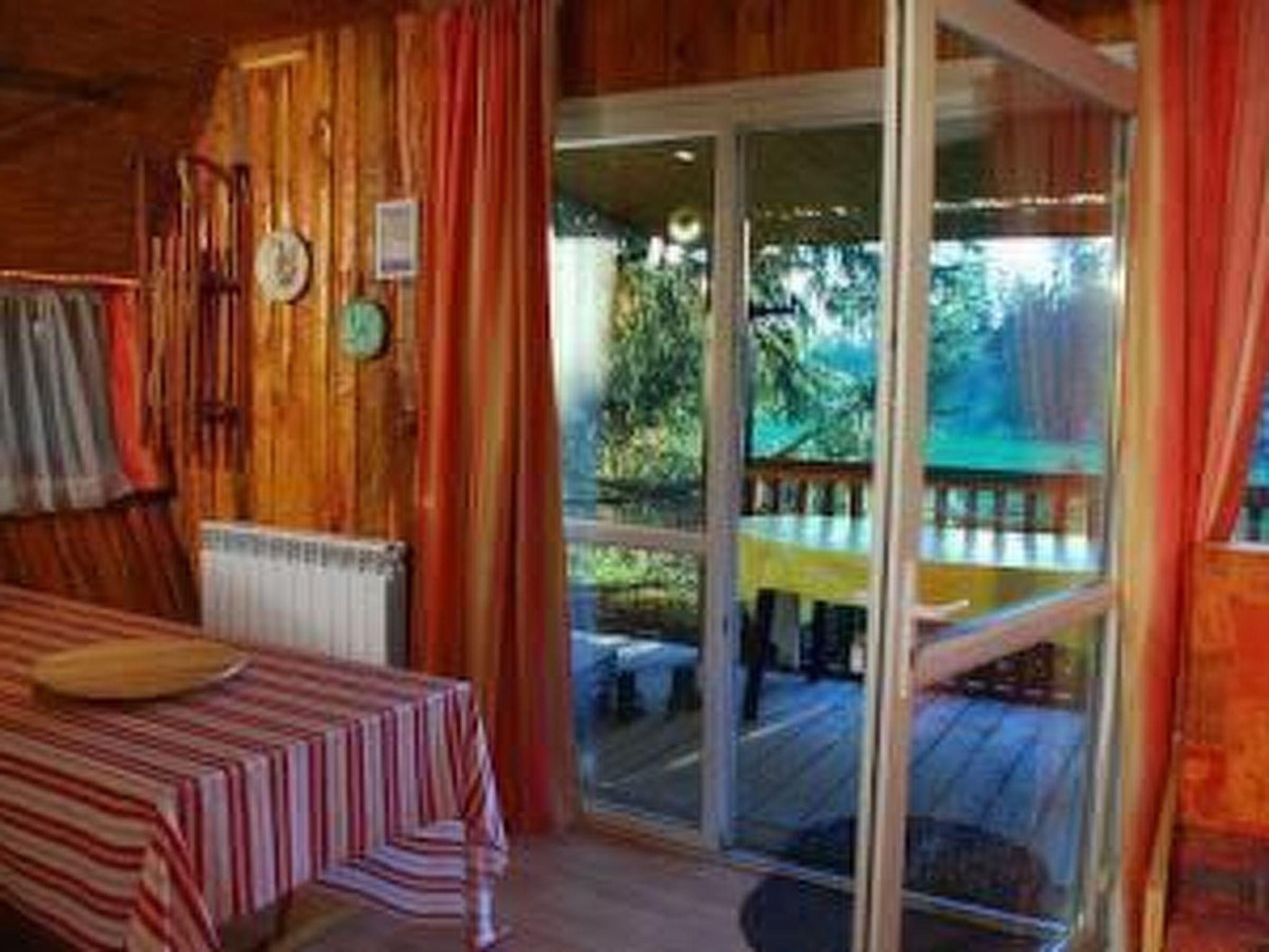 The dining space has a window front with a sliding door, opening onto the roofed, wooden terrace facing south-west, with garden furniture, a deckchair and a hammock. You can share use of a garden, a grill and big dining tables for meals together. Children will enjoy the shared playground, volleyball court, table tennis table and basketball basket. You can park your car conveniently in front of the chalet.