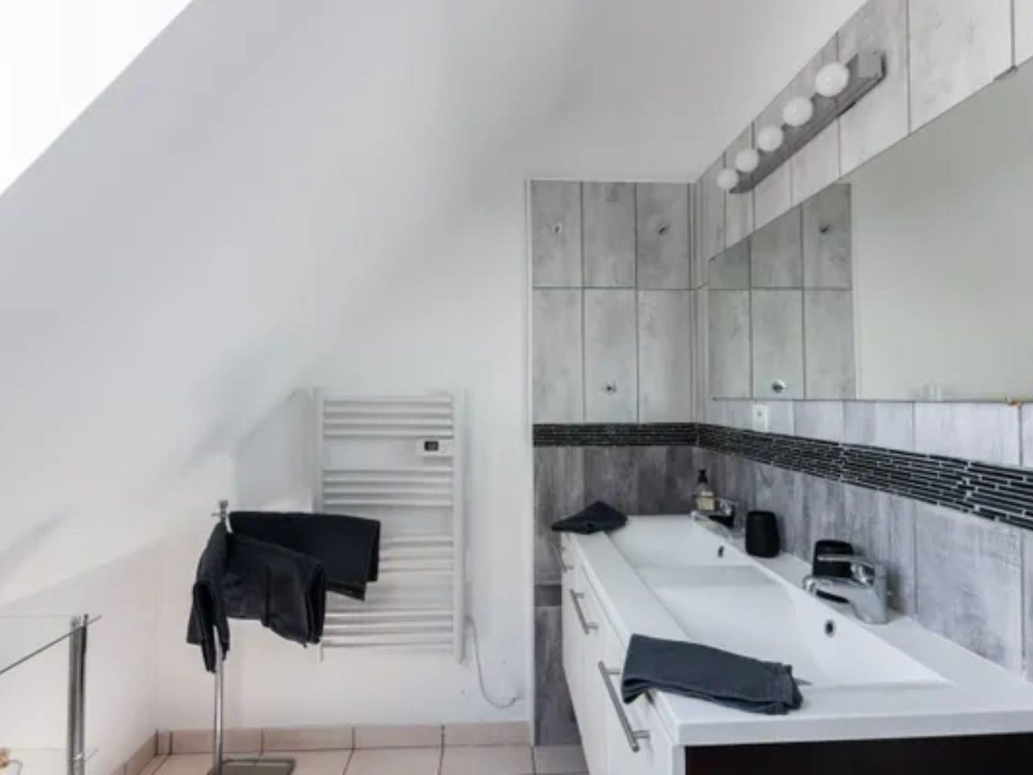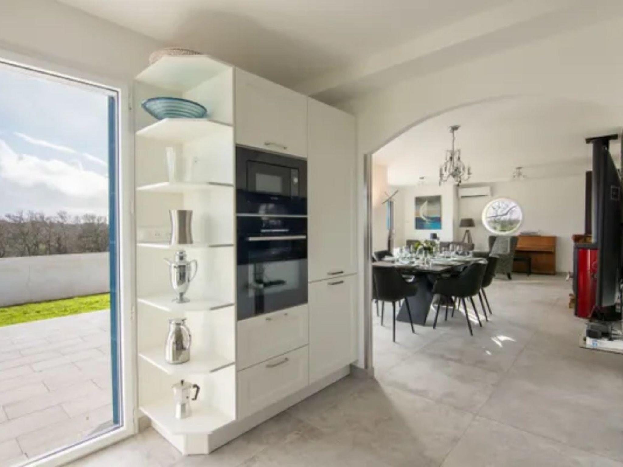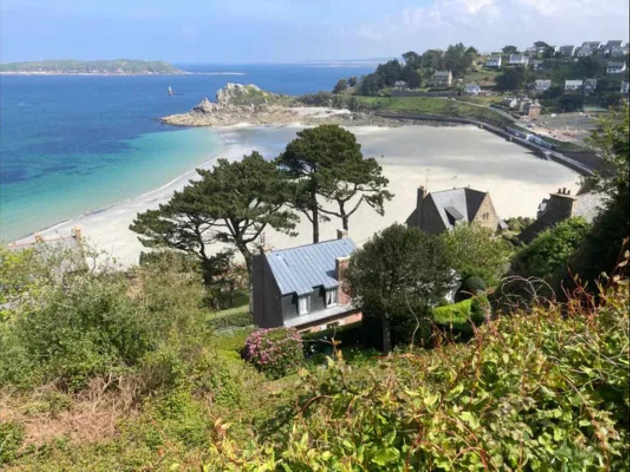 The villa, which is a good ten years old, is very comfortably furnished and offers a generous 220 square metres of space. The architect-designed villa has a large open-plan living/dining area with a semi-open-plan kitchen and several access points to various terraces. In the centre of the living area is the large fireplace, which, in addition to the electric heaters typical of France, provides additional cosiness and warmth. On the ground floor there is also a beautiful bedroom with an en-suite shower room and a small office. The villa is therefore also perfect for a barrier-free holiday on one floor. On the upper floor there are a further three bedrooms, another living and reading room as well as an office with desk, printer and screen, a bathroom and the largest bedroom in the house has its own shower and washbasin directly in the room. The entire plot of approx. 1,000 square metres is surrounded by high hedges and a solid wall with an electric roller shutter, which guarantees maximum privacy, but also allows children or even a dog to move around freely. You can enjoy sunshine from the terraces in several directions (from east to south to west) almost all day long and from the terraces or the balcony you can enjoy a kilometre-wide view over the fjord landscape, a nature reserve and all the way to Lannilis.