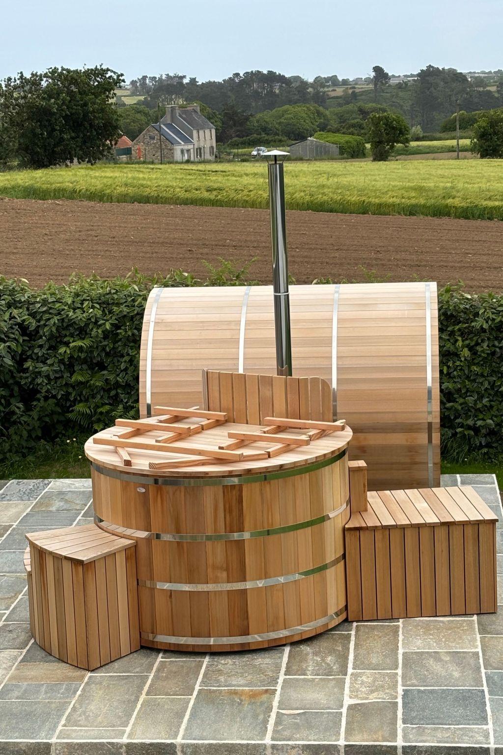 Spacious lawns are also ideal for a game of badminton. The 60 square metre outdoor wellness area is sheltered from the wind. There you will find a Nordic bath, heatable with electricity or firewood, a large barrel sauna, outdoor shower, granite bench and outdoor lighting. Wellness can be enjoyed here 365 days a year.
