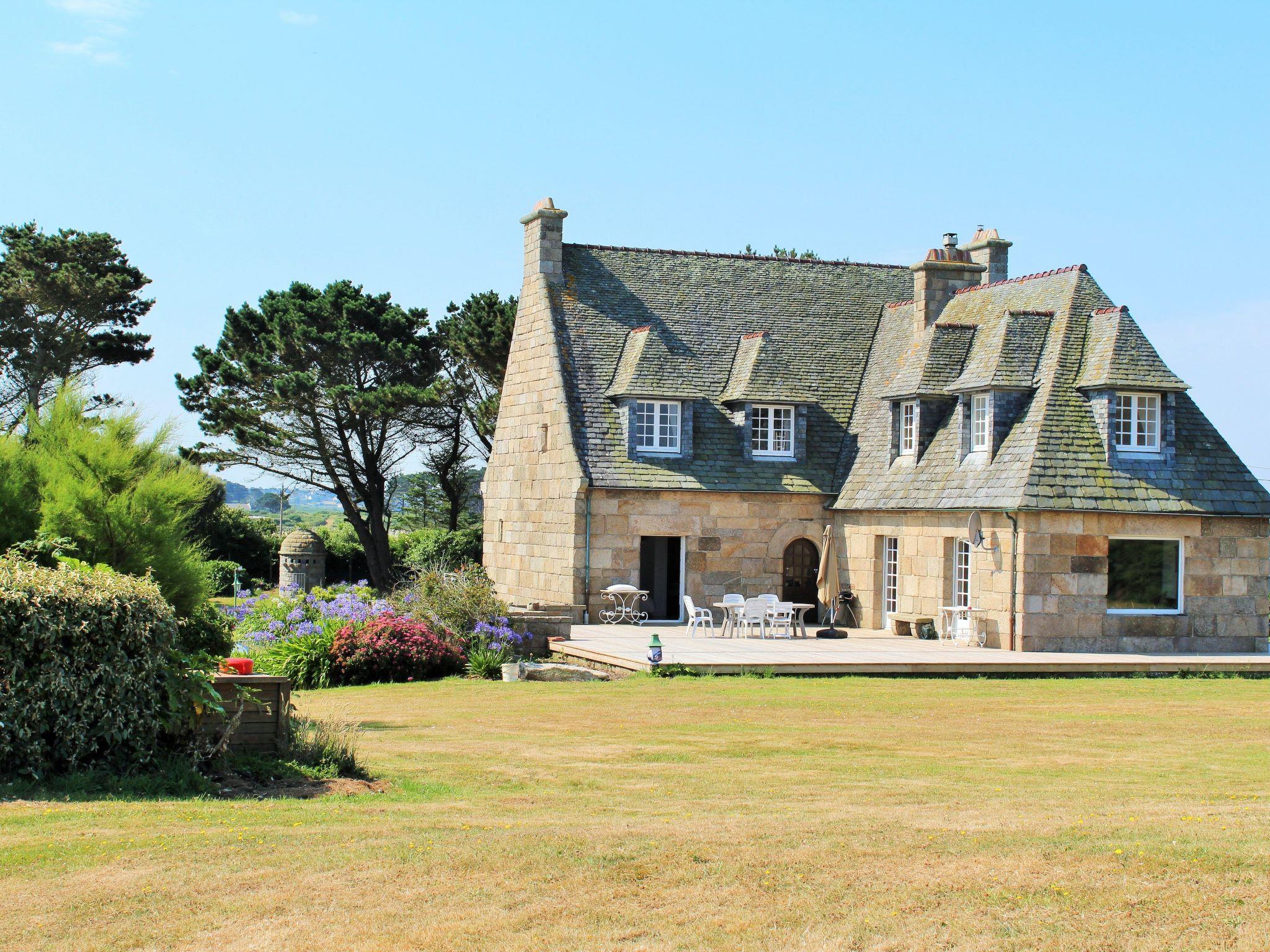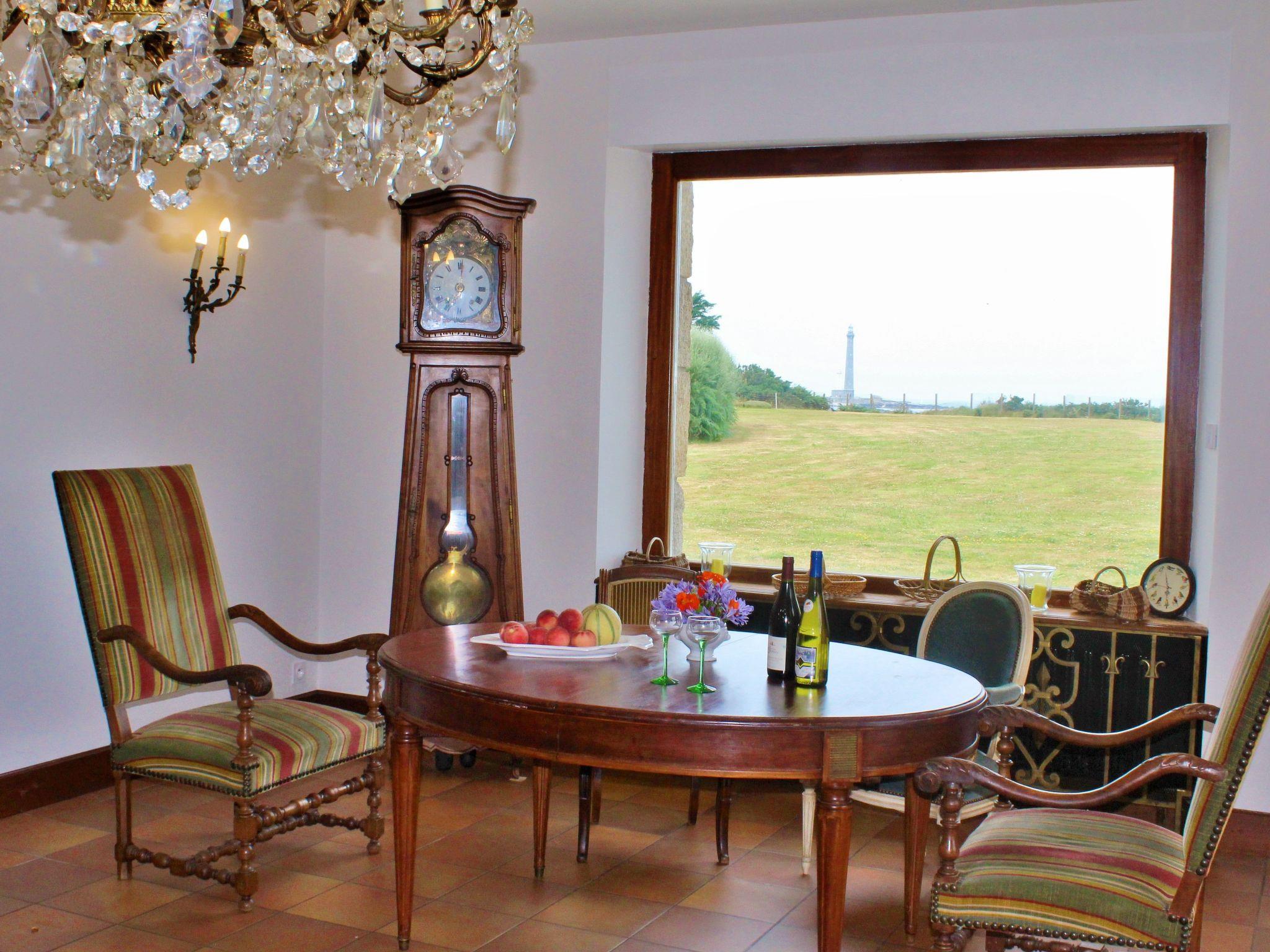 A large villa, classic, Breton, stately - a great property built from old granite stones. The terraces are large and promise a unique view of the largest granite lighthouse in the whole of Europe. In addition to the villa's superb construction, the beautiful, huge garden in front of the Phare de Ile de Vierge is certainly unforgettable. The property has a large entrance gate, a dovecote and a fountain, and a granite terrace to the south. Towards the lighthouse is the larger wooden deck. The villa offers plenty of space for twelve people in six bedrooms, three bathrooms, a fireplace and a large kitchen with direct access to the living room. You can also see the lighthouse directly from the living room through large windows. A man-sized fireplace, from an old manoir, is also located in the living area. You enter the villa through the large and open entrance area.