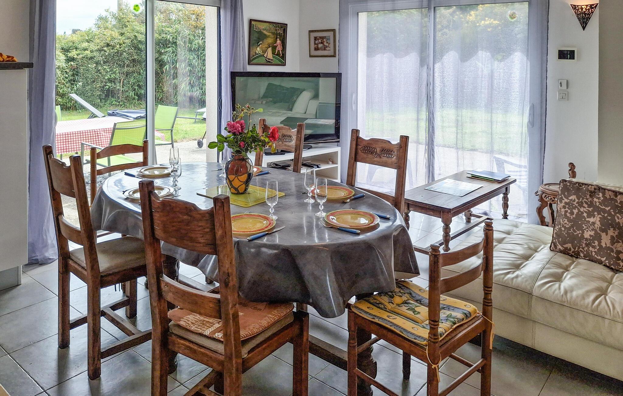 Nyd jeres ophold i dette velholdte feriehus. Her finder I de ideelle rammer for at tilbringe tid med familie eller venner nær den bretonske kyst. Føl jer hjemme i den attraktivt designede opholdsstue. Slap af i den store hjørnesofa, der lægger op til at blive hængende. Nyd jeres måltider ved spisebordet med massive træstole og benyt det lyse, moderne køkken med en praktisk arbejdsflade. Drag fordel af den åbne planløsning, der hyggelig kombinerer køkken, spiseplads og stue.
