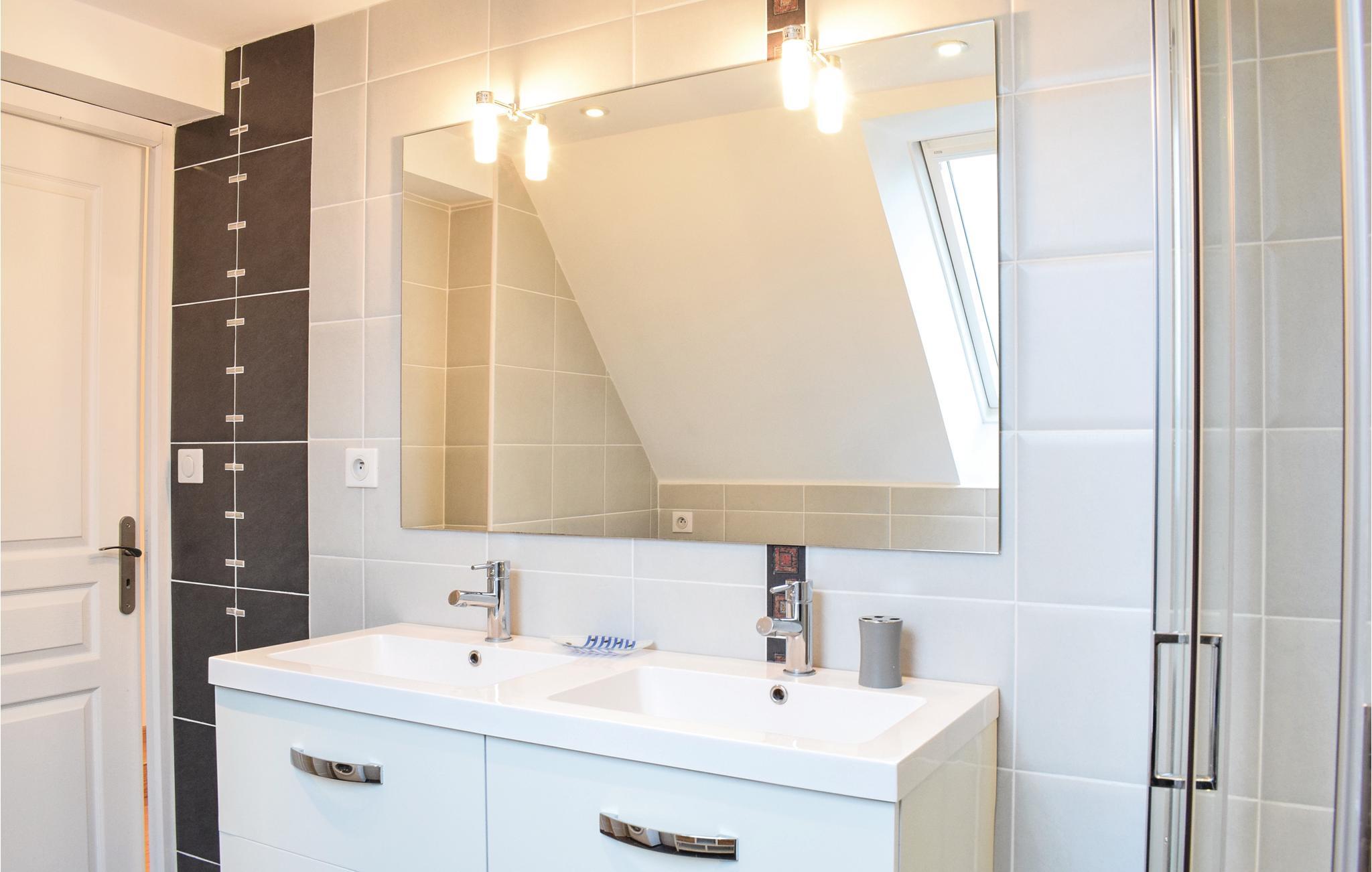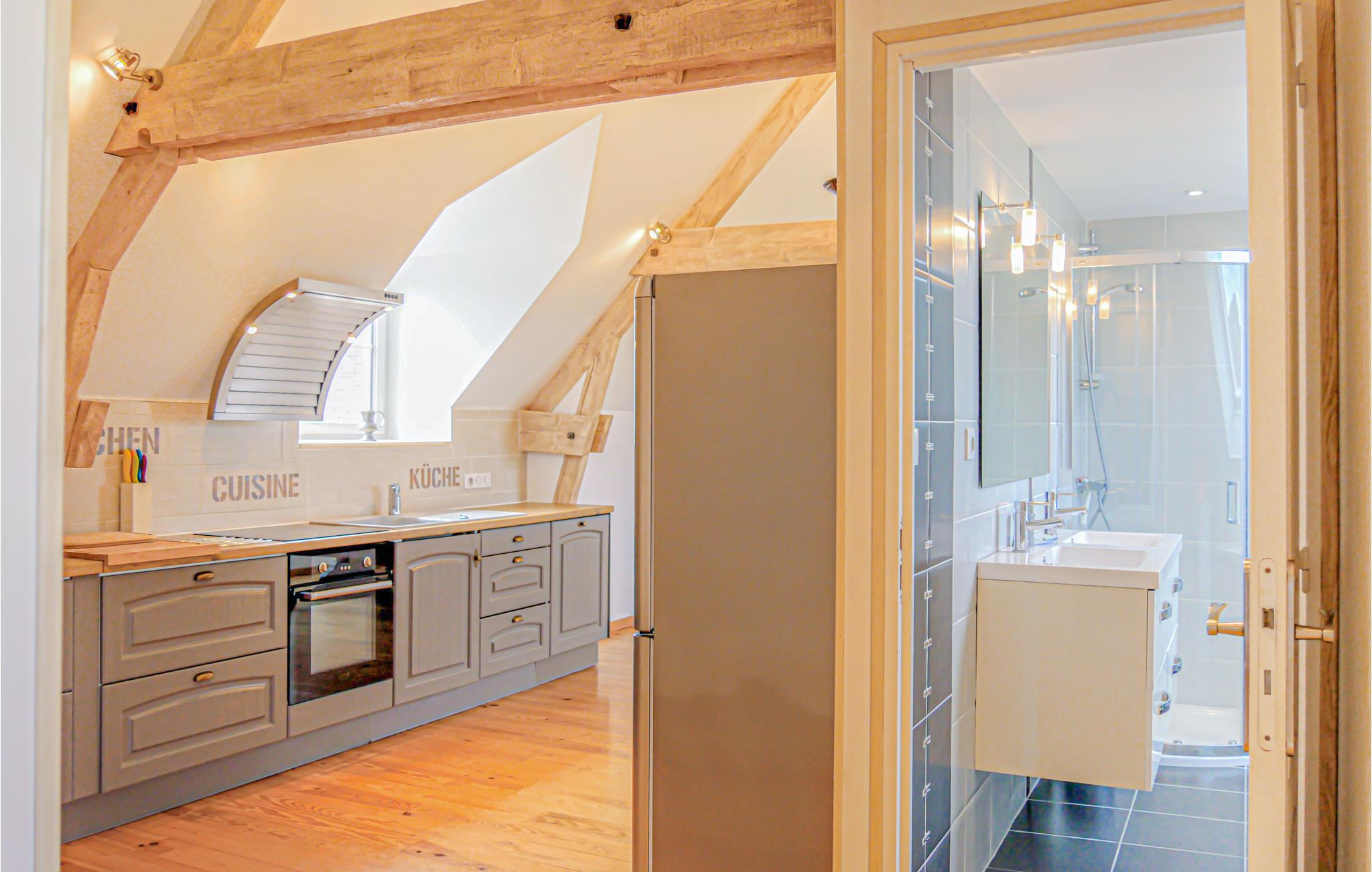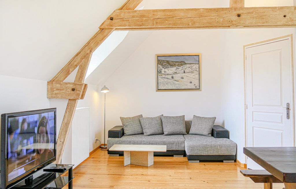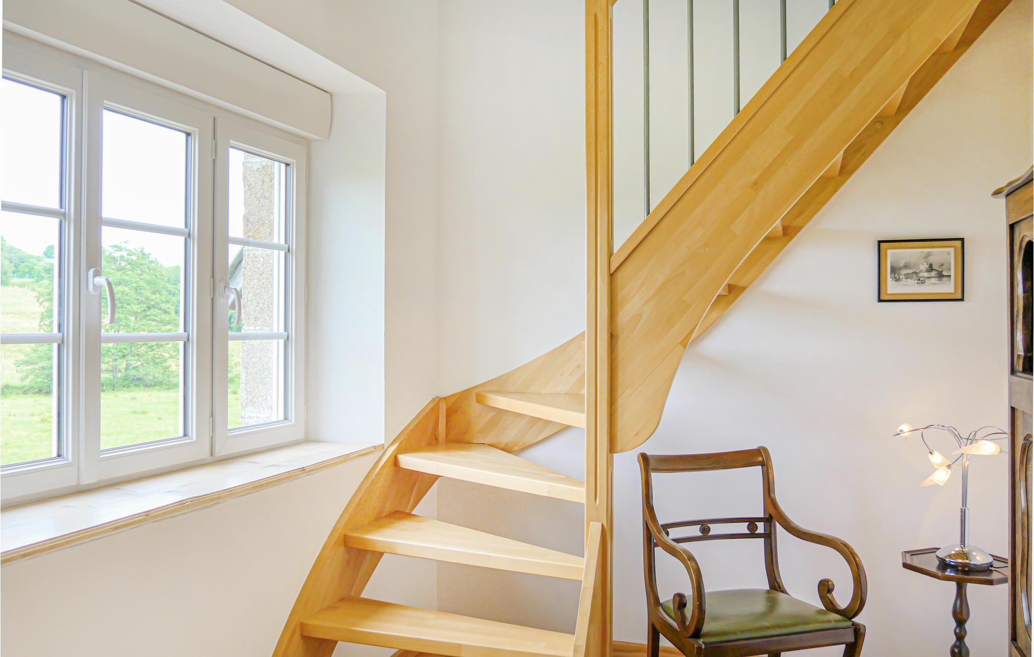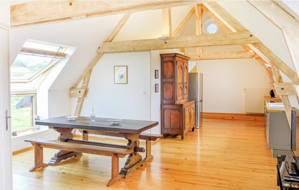 Denne særdeles indbydende lejlighed, der strækker sig over de øverste etager i en mølle i Cavigny, forener moderne komfort med bindingsværk og sten. Nyd den skønne udsigt over de landlige omgivelser med græssende køer og heste samt over kanalen, hvis strømmende vand stadig kan få møllens vandhjul til at dreje. I byen Avranches, 3 km væk, kan I se Mont Saint-Michel og bugten samt besøge den botaniske have med sit helt unikke udsigtspunkt.
