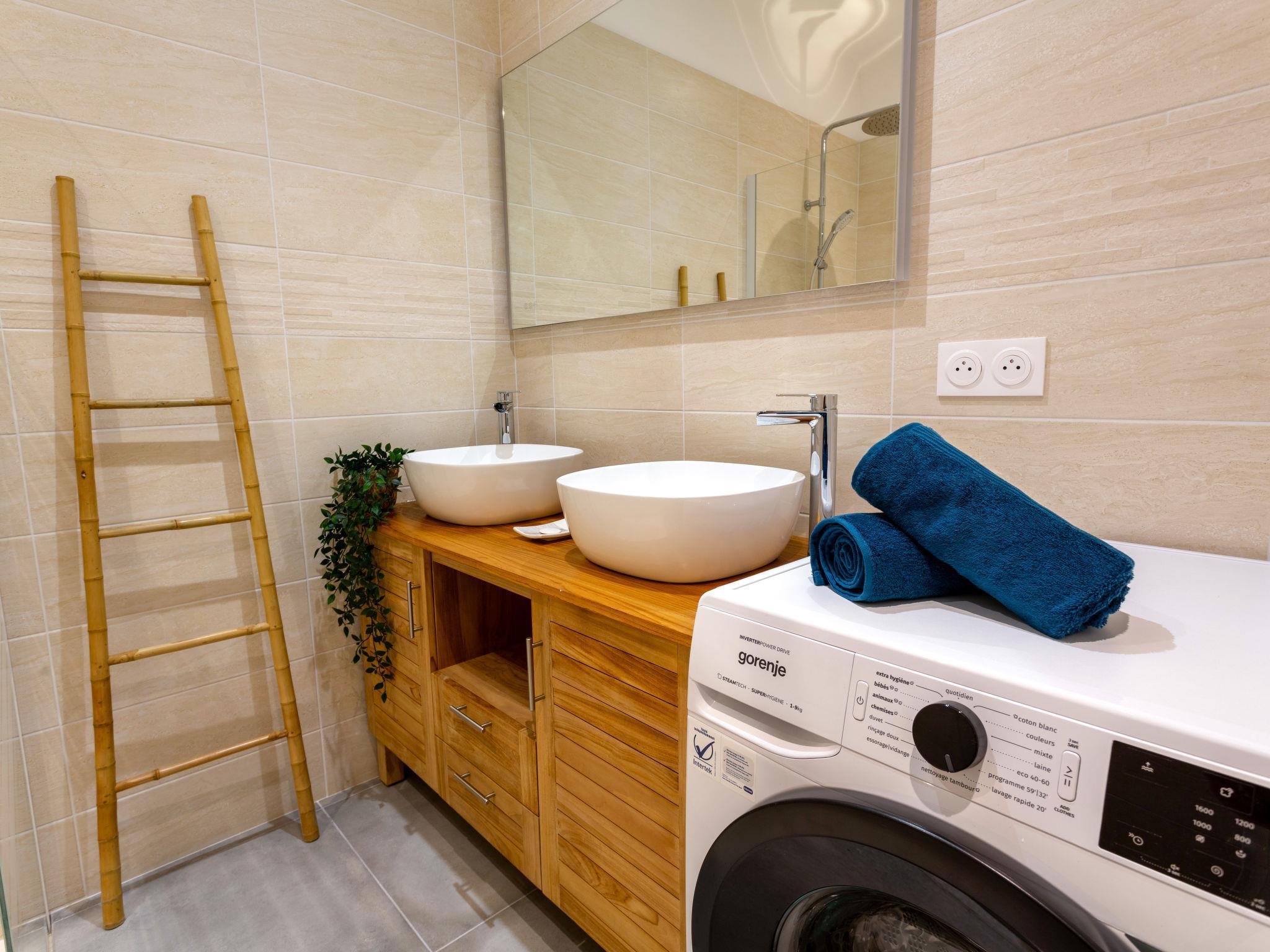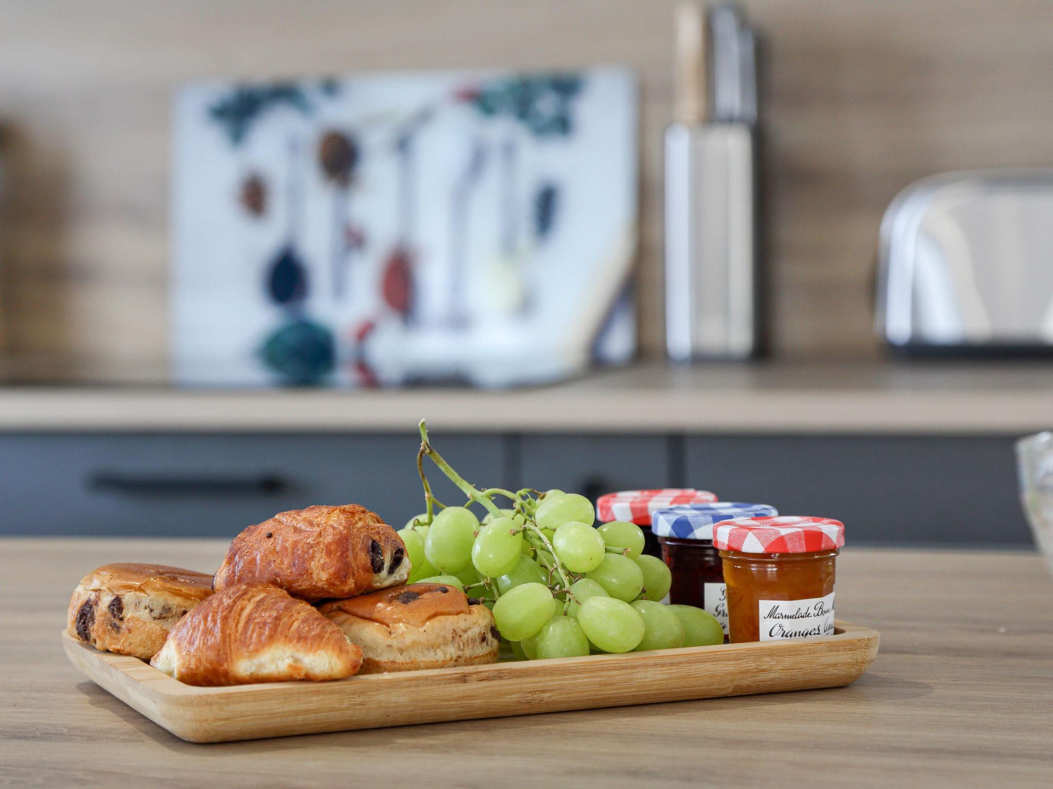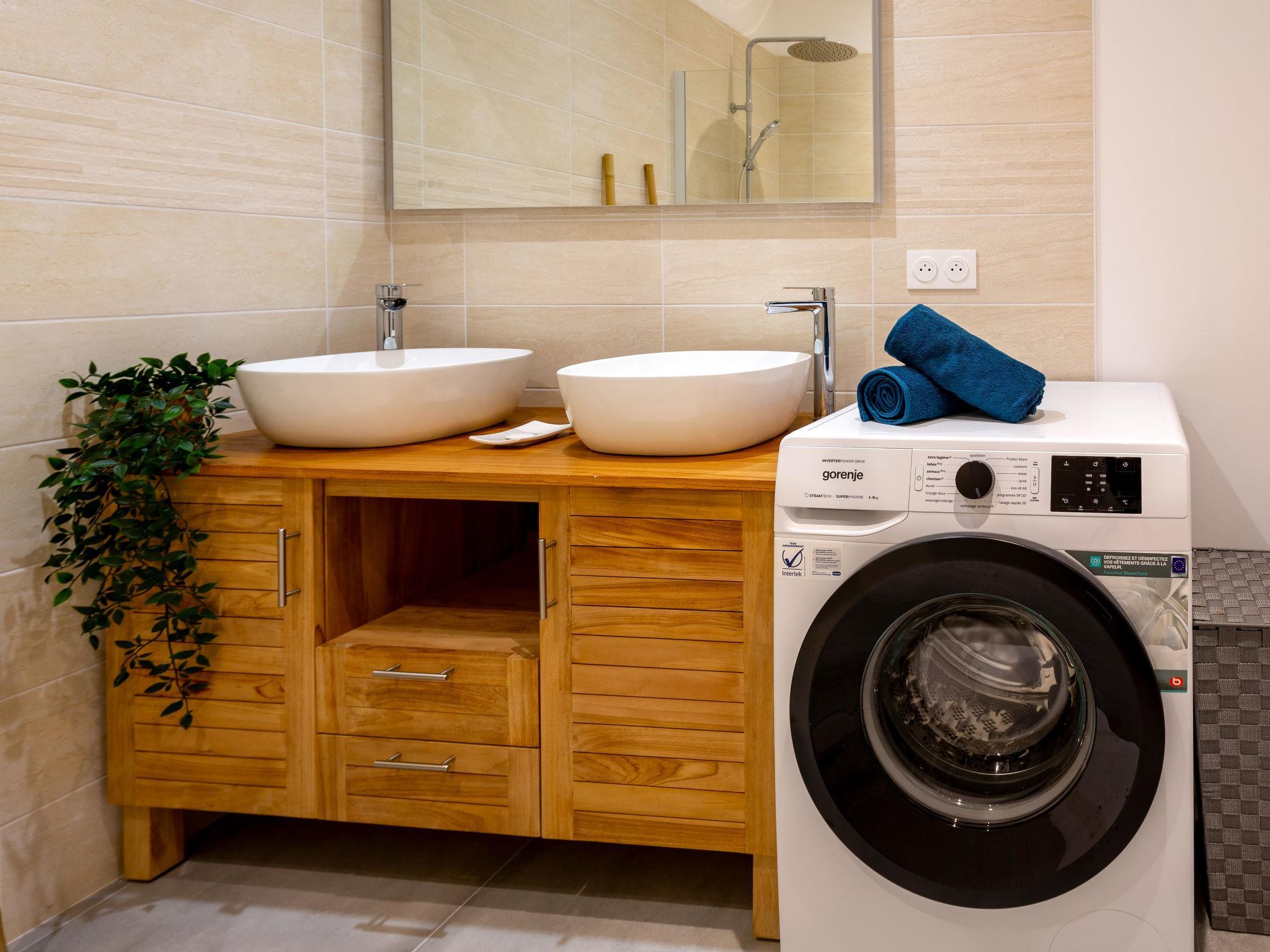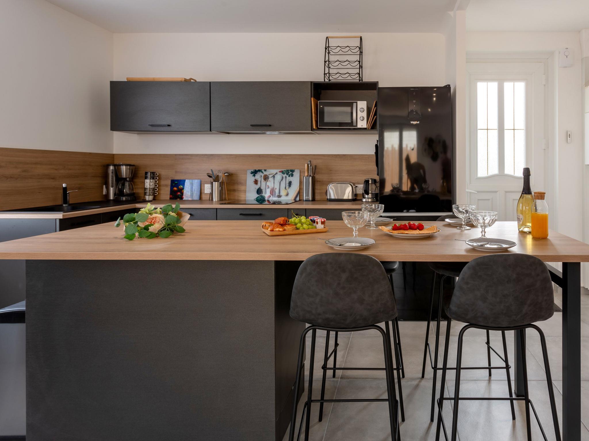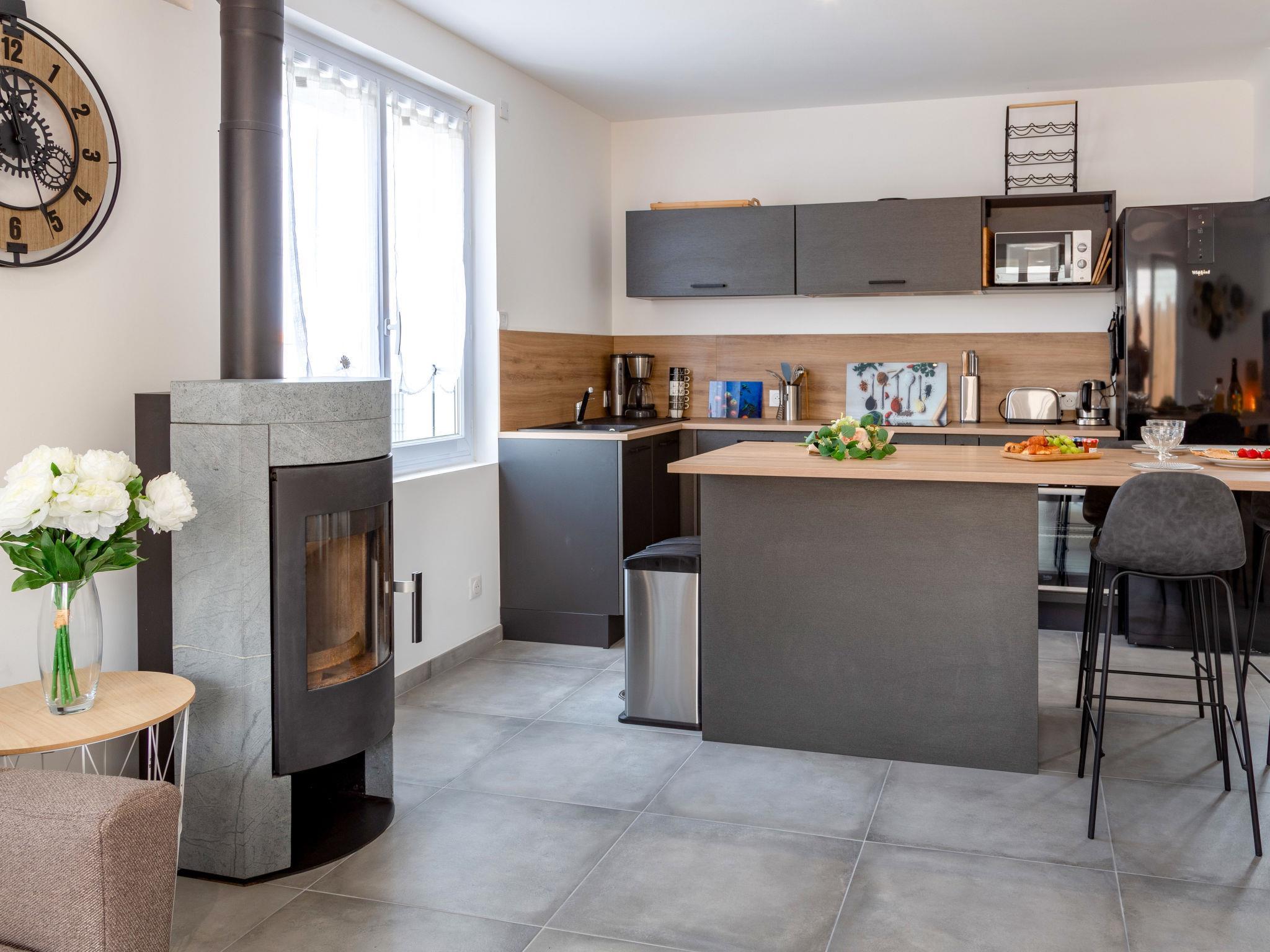 "La Villa Dorée", 4-room house 100 m2. Modern and cosy furnishings: living/dining room with TV (flat screen), wood-burning stove. Exit to the terrace. 2 rooms, each room with 1 french bed (1 x 160 cm, length 200 cm). 1 room with 2 beds (80 cm, length 190 cm). Open kitchen (oven, dishwasher, 3 induction hot plates, toaster, kettle, microwave, freezer, electric coffee machine). Shower, sep. WC, double hand-basin. Electric heating. Large terrace 60 m2, south facing position and west facing position, garden 330 m2, south facing position and west facing position. Terrace furniture, barbecue, deck chairs (4). Facilities: washing machine, iron, hair dryer. Internet (WiFi, free). Parking (3 cars). Please note: non-smoking house. Smoke alarm. Offer by a commercial proprietor according to Art. 155, IV, CGI 44131000168NJ