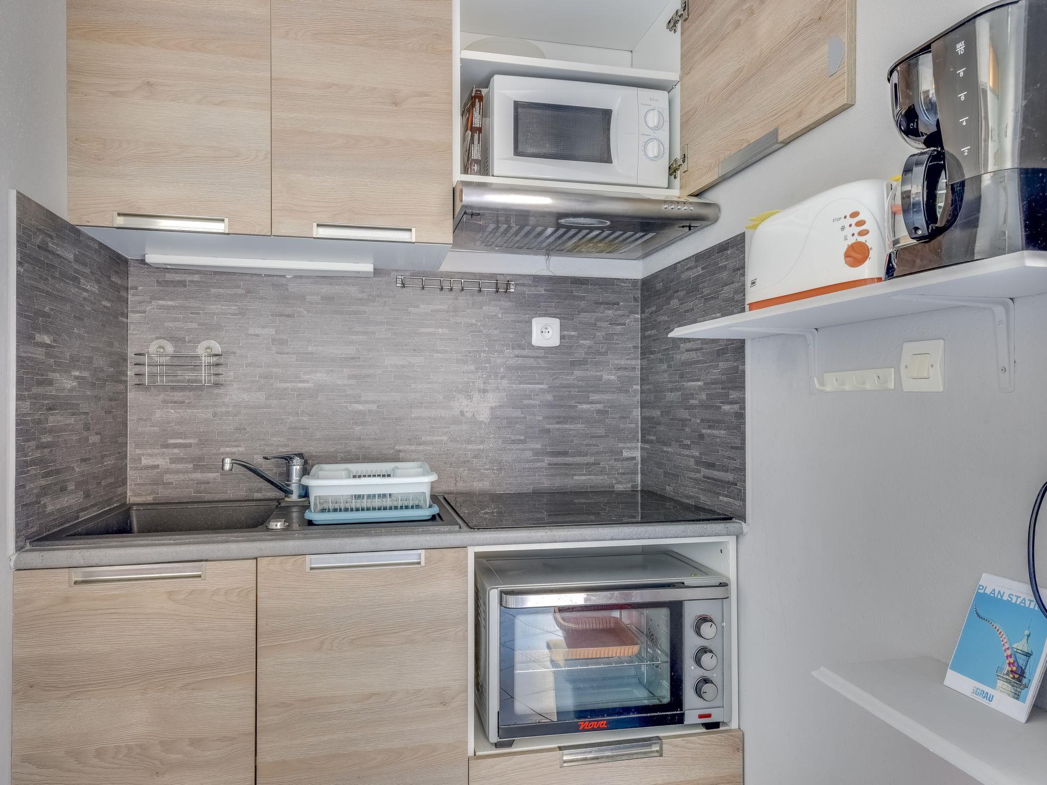 2-room apartment 27 m2 on 1st floor. Living/dining room with TV (flat screen). Exit to the terrace. 1 room with 1 french bed (1 x 140 cm, length 190 cm). Sleeping alcove with 1 x 2 bunk beds (90 cm, length 190 cm). Kitchenette (4 hot plates, oven, microwave, freezer, electric coffee machine). Shower, sep. WC. Electric heating. Terrace. Terrace furniture. Parking space n 105. Please note: non-smoking house. Maximum 1 pet/ dog allowed. Smoke alarm. Instead of an enclosed bedroom, some sleeping areas are located in an open-plan area (gallery, alcove, etc.).