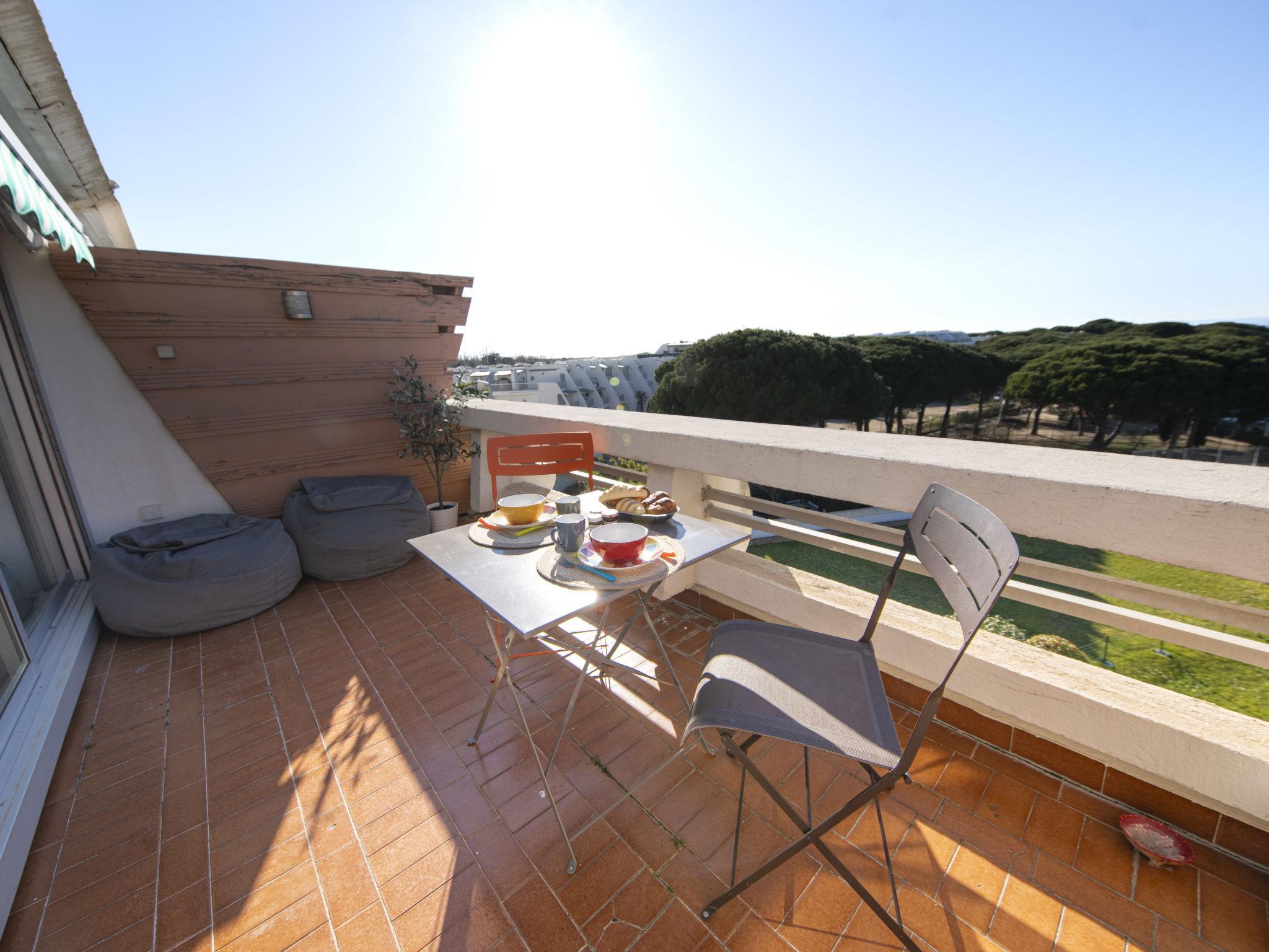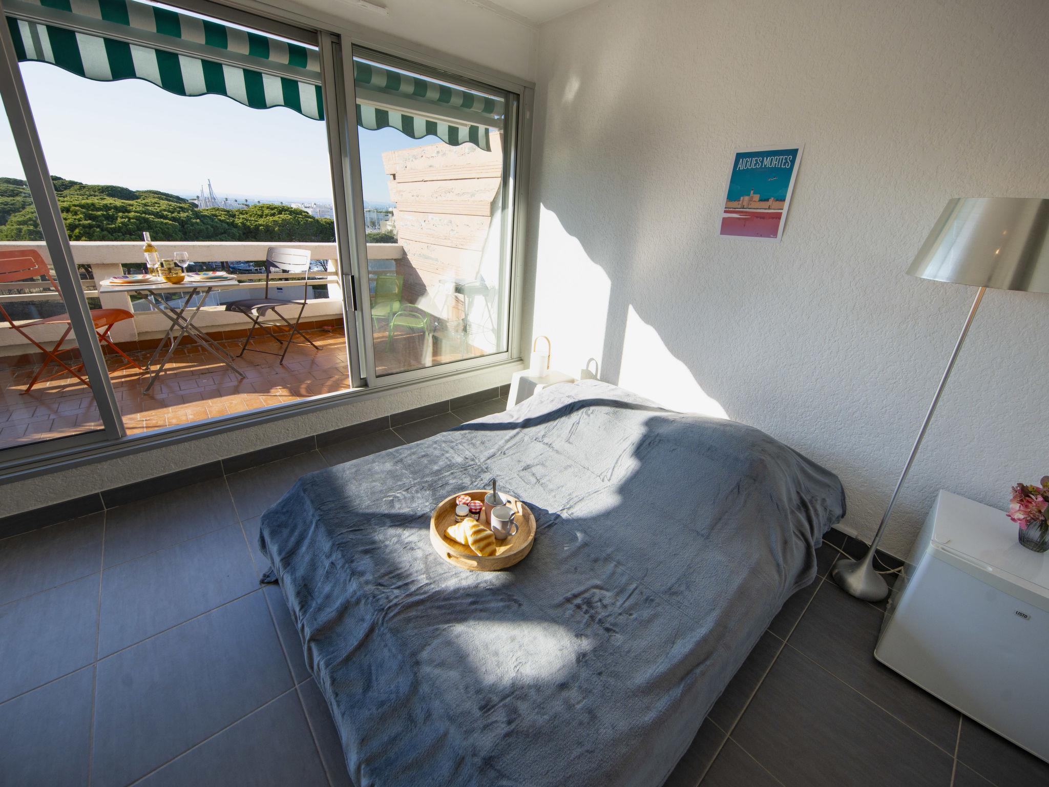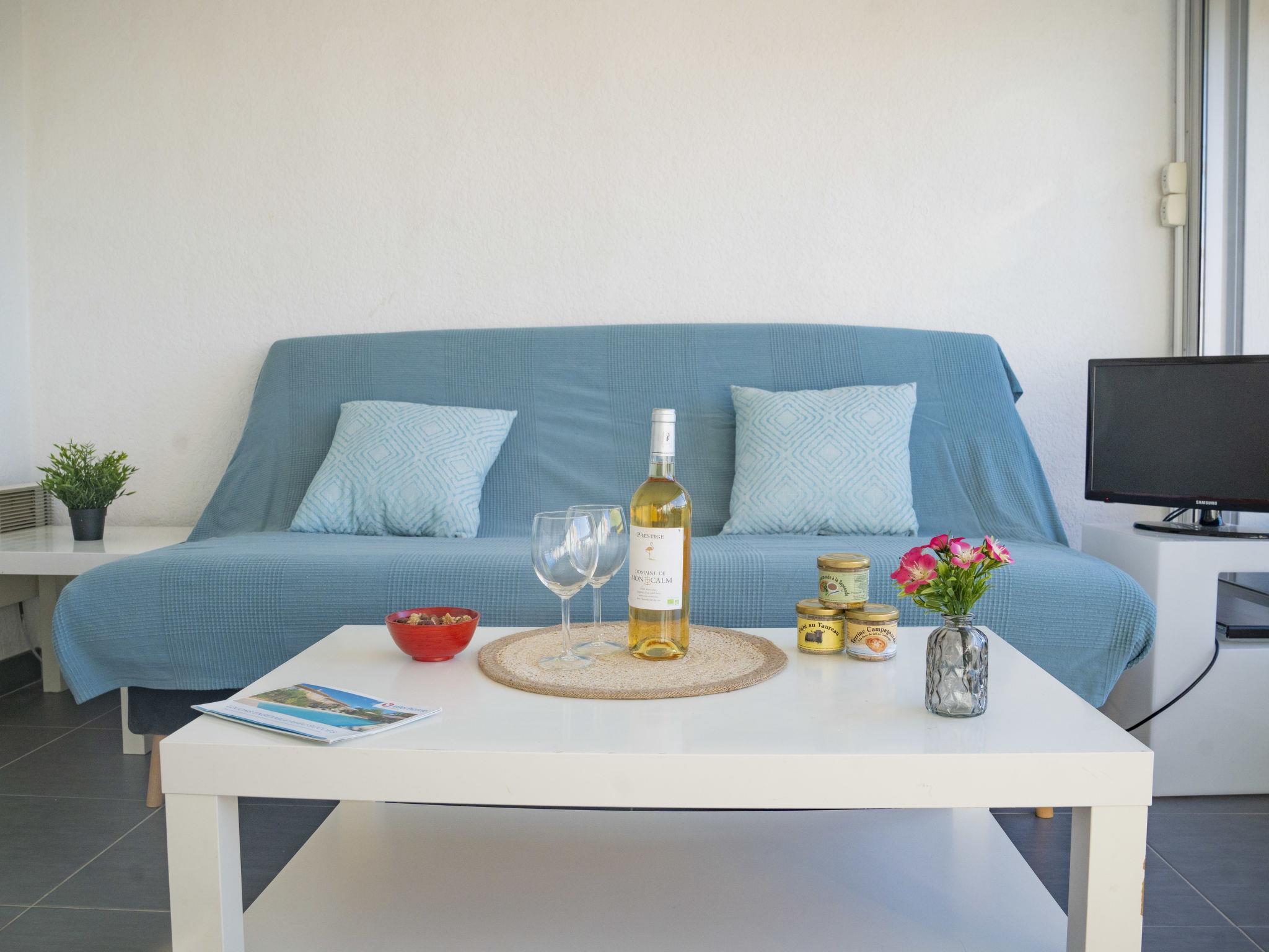 1-room studio 25 m2 on 3rd floor. Living/sleeping room with 1 double sofabed (1 x 140 cm, length 190 cm), dining table and TV (flat screen). Exit to the terrace. Small kitchen in the entrance (2 hot plates, toaster, kettle, microwave, freezer, electric coffee machine). Bath/WC. Electric heating. Terrace 12 m2, north facing position and west facing position. Terrace furniture, electric barbecue. Panoramic view of the swimming pool, the canal and the port. Facilities: washing machine. Internet (WiFi, free). Parking (1 car). Please note: non-smokers only. Maximum 1 pet/ dog allowed. Smoke alarm, no lift. Offer by a private individual according to Art. 155, IV of CGI. 30133000975QZ
