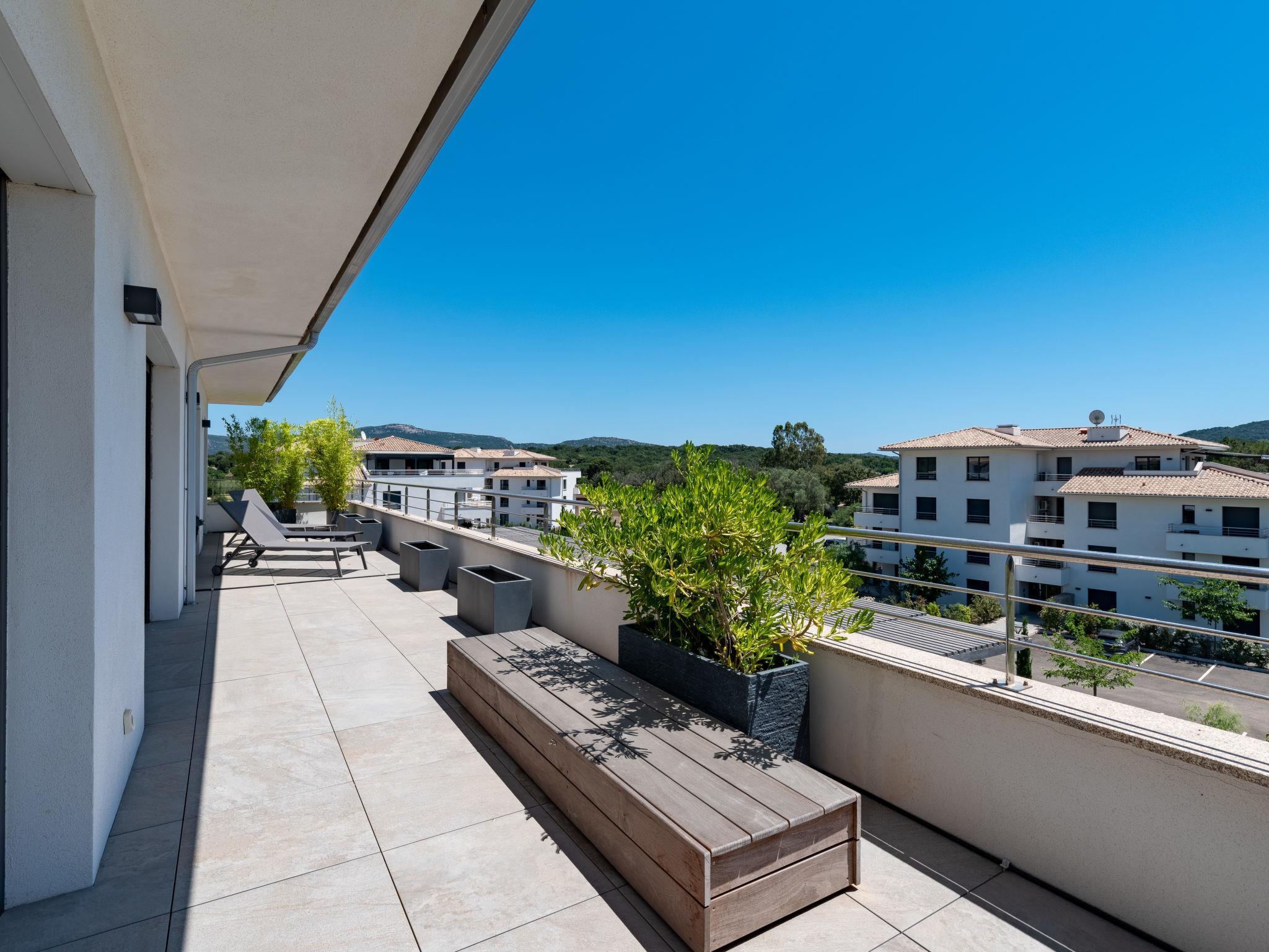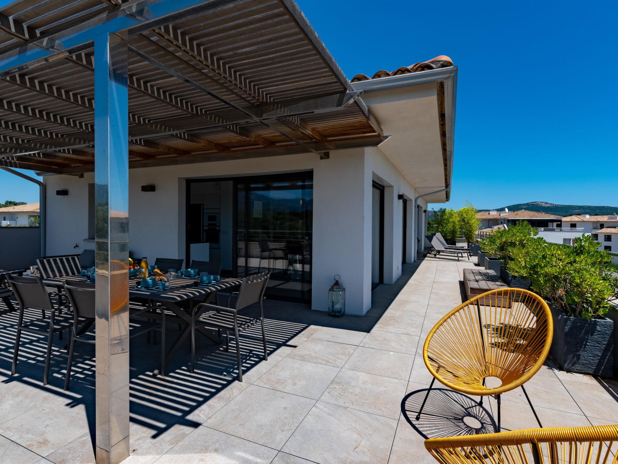 5-room apartment 137 m2 on 3rd floor. Very beautiful and modern furnishings: living/dining room with TV (flat screen). Exit to the terrace. 1 room with 1 french bed (160 cm, length 200 cm), shower. Exit to the terrace. 1 room with 1 french bed (160 cm, length 200 cm), shower/WC. Exit to the terrace. 1 room with 2 beds (90 cm, length 190 cm). 1 room with 2 beds (90 cm, length 200 cm). Open kitchen (oven, dishwasher, 3 induction hot plates, toaster, kettle, microwave, freezer, electric coffee machine, Capsules for coffee machine (Tassimo)). Exit to the terrace. Shower, sep. WC. Electric heating, air-conditioning. Large terrace 120 m2. Deck chairs (2). Beautiful view of the mountains. Facilities: washing machine, dryer, iron. Internet (WiFi, free). Parking space n 731 at the house. Please note: non-smokers only. Smoke alarm. Plancha. 2A2470013588E