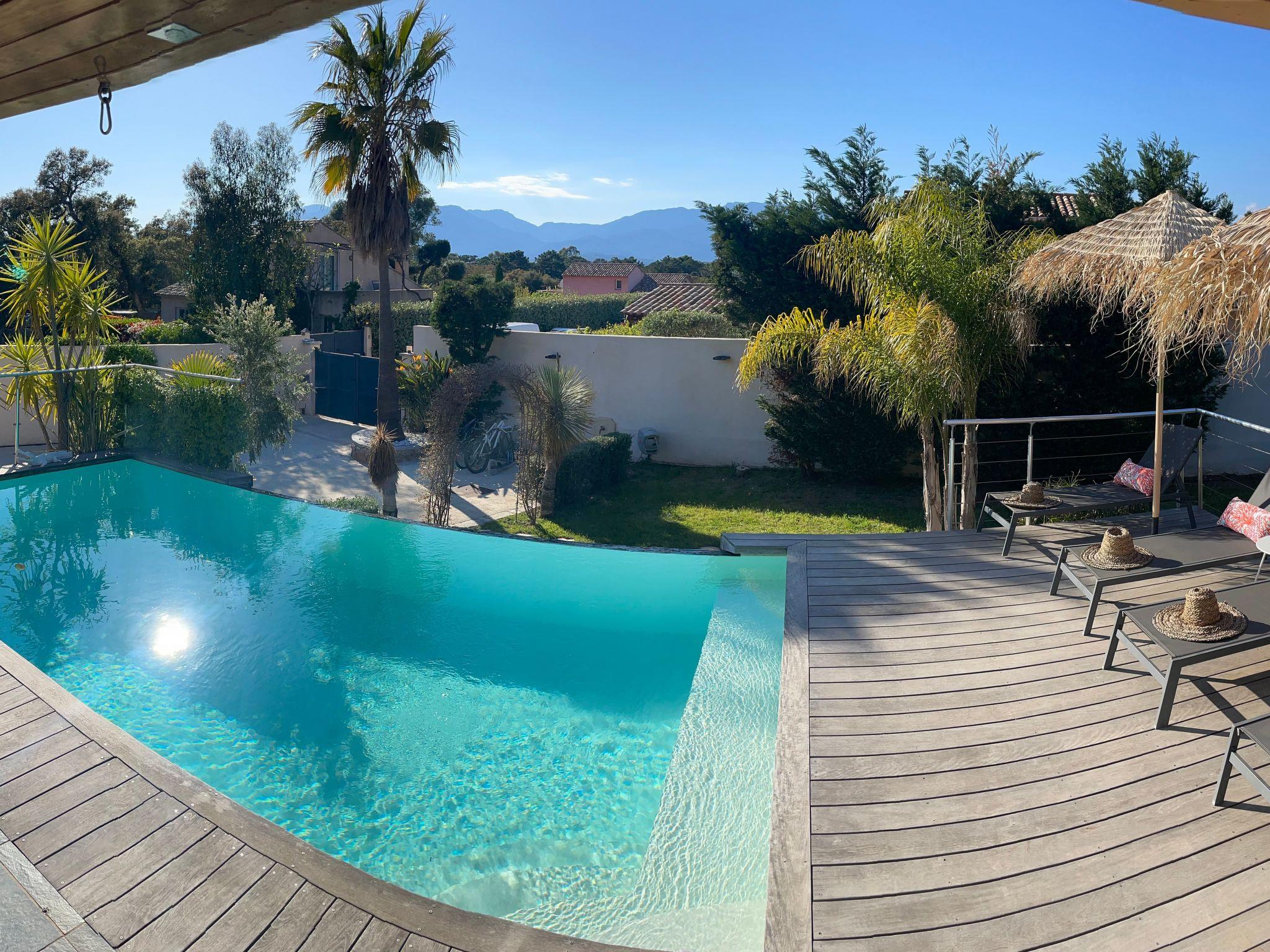 Private grounds and terrace fully equipped with furniture: deckchairs, tables, chairs, outdoor lounge and pergola, as well as a fully equipped pool house with TV and outdoor kitchen.