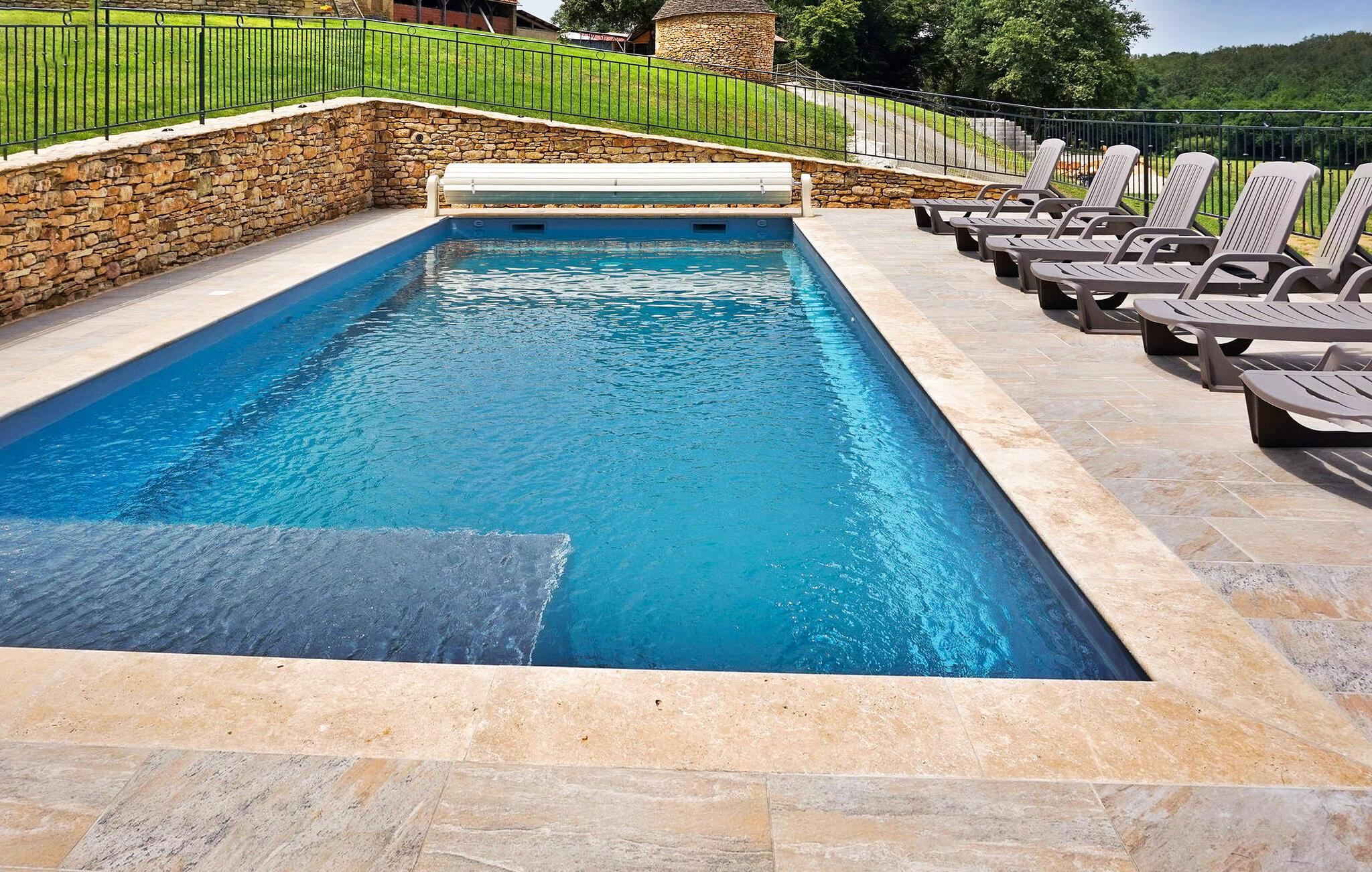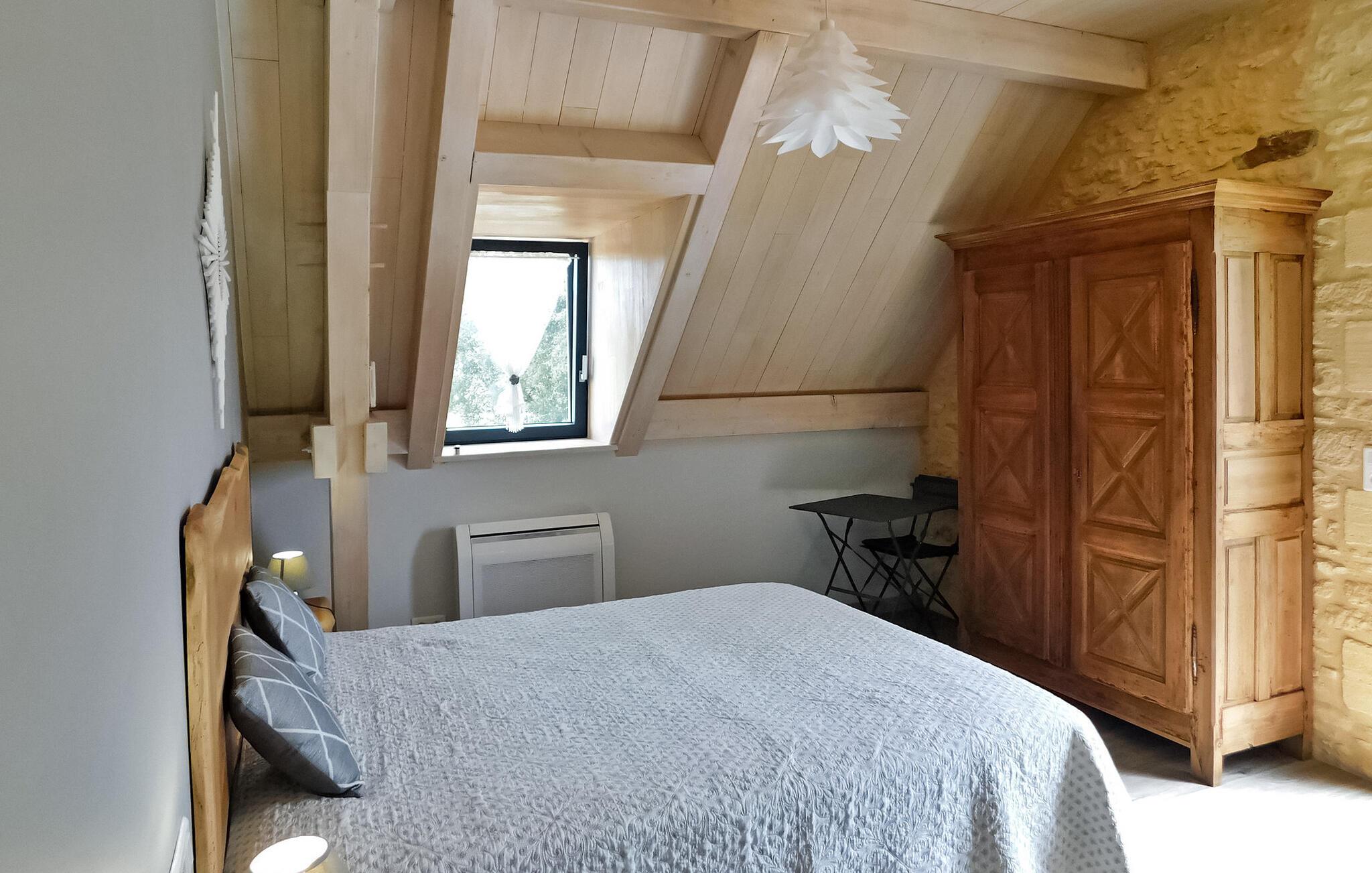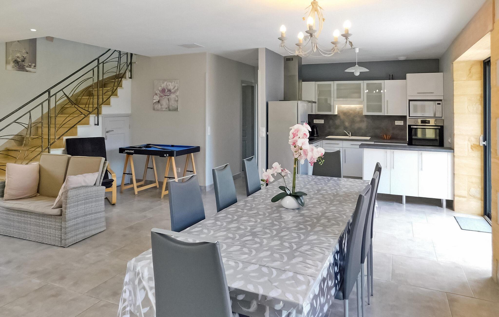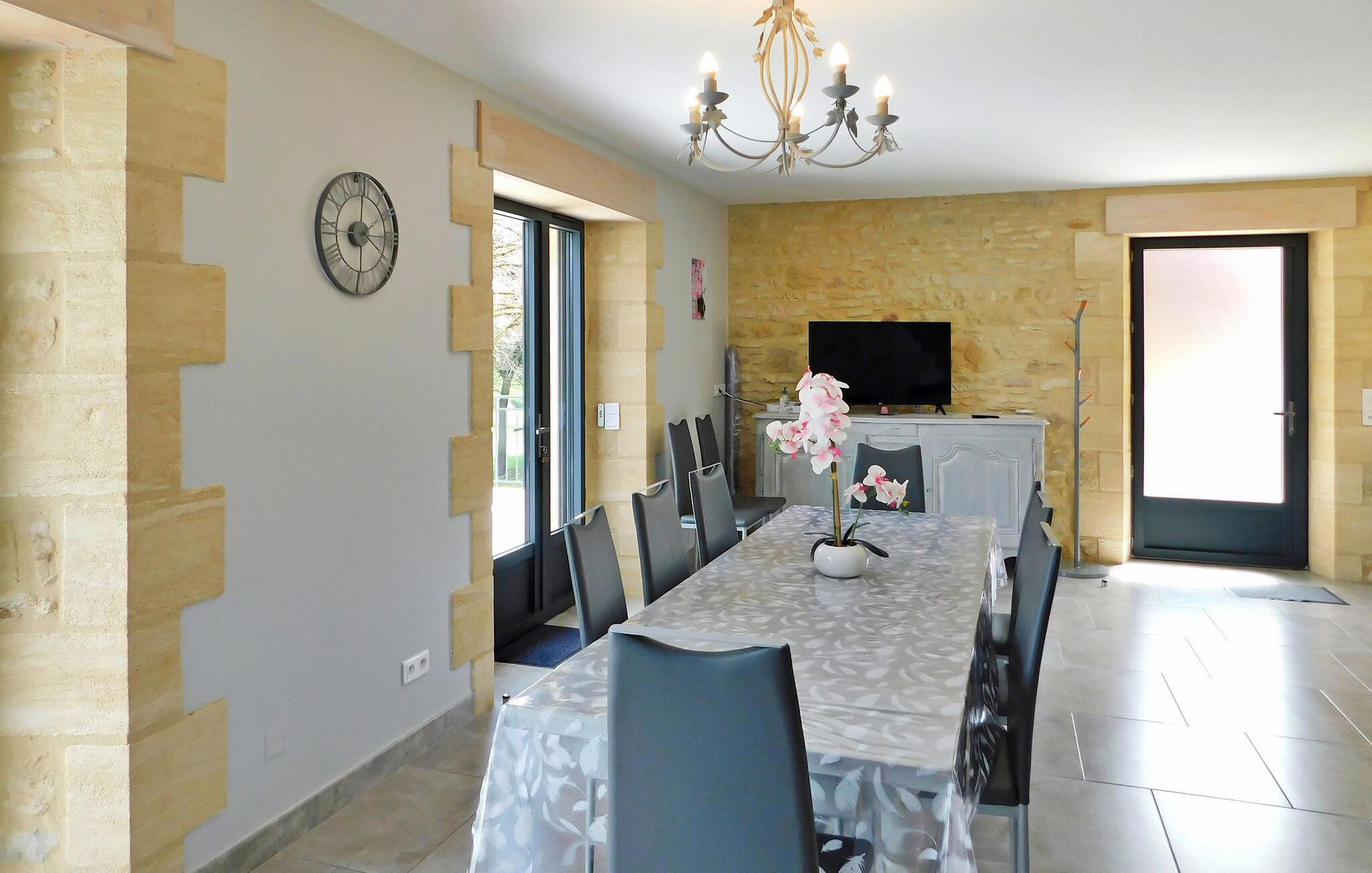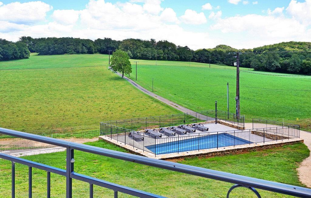 Flygt til et rummeligt landligt hjem i Dordogne, der kan prale af en privat opvarmet swimmingpool. Dette ekspansive hjem byder dig velkommen i et generøst opholdsområde med komfortable siddepladser, en spiseplads og et åbent køkken med essentielle apparater. Et vaskerum tilføjer til bekvemmeligheden sammen med et soveværelse i stueetagen designet til personer med nedsat mobilitet og et privat brusebad. Ovenpå kan du opdage tre smukt indrettede soveværelser, et specielt designet til børn, der hver tilbyder unikke bekvemmeligheder. Nyd den ekspansive fliseterrasse, der støder op til køkkenet, møbleret med udendørs faciliteter og tilbyder panoramaudsigt. Den private opvarmede swimmingpool, indhegnet og sikret i henhold til standarder, bidrager til afslapning og nydelse af dit ophold. Bemærk venligst, at ejerne bor i nærheden, og at haverne ikke er lukkede. Aircondition er tilgængeligt i soveværelserne ovenpå, og babyudstyr er til rådighed for ekstra bekvemmelighed. Oplev landskabets ro og komforten i dette rummelige feriehus, hvilket sikrer et uforglemmeligt tilflugtssted i Dordogne. Ferieboligen er omgivet af smukt grønt landskab og skove. Landsbyer er i nærheden (landmandsmarkeder) og adskillige gå- og vandrestier.