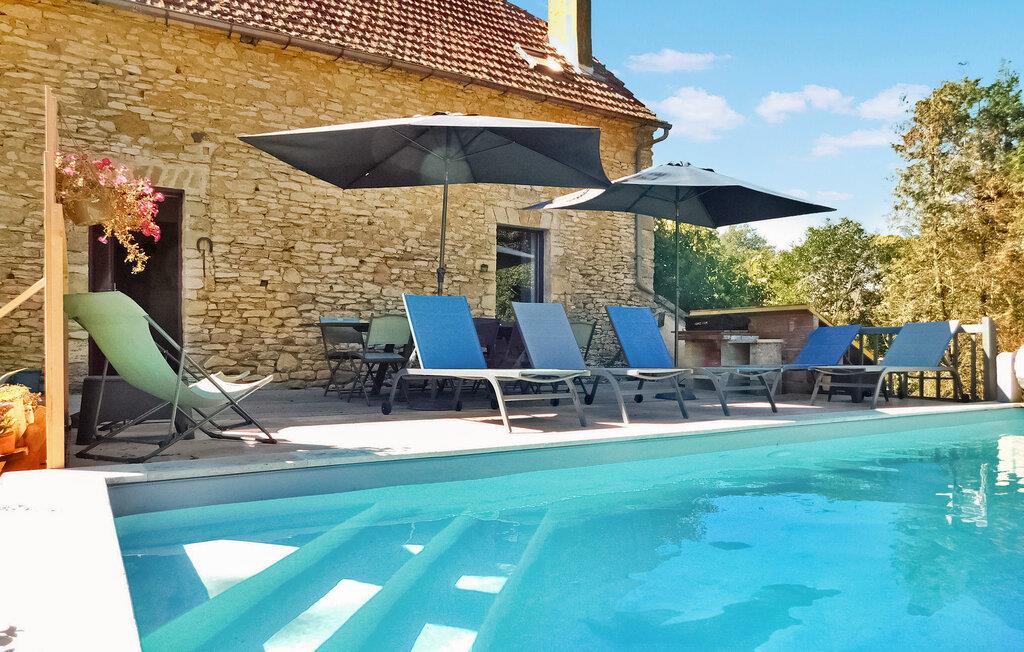 Dette landlige feriehus er en del af en ejendom med separate enheder. Det har et indendørs wellness-område (hammam, sauna, jacuzzi), fitnessrum/legerum til fælles brug. Huset byder på en stueetage med stue, køkken, spiseplads og et soveværelse med eget bad. Ovenpå har en mezzanin og de resterende soveværelser. Udendørs er en stor eng, træterrasse og en privat opvarmet 8m x 3m pool med liggestole til rådighed. Fælles faciliteter omfatter wellness-faciliteter, fitnesscenter og spillelokale. Huset ligger i en lille landsby på en ejendom på landet omkring 0,5 km fra Prats-de-Carlux og 4 km fra Carlux.