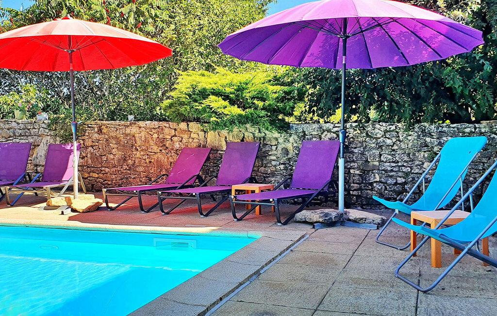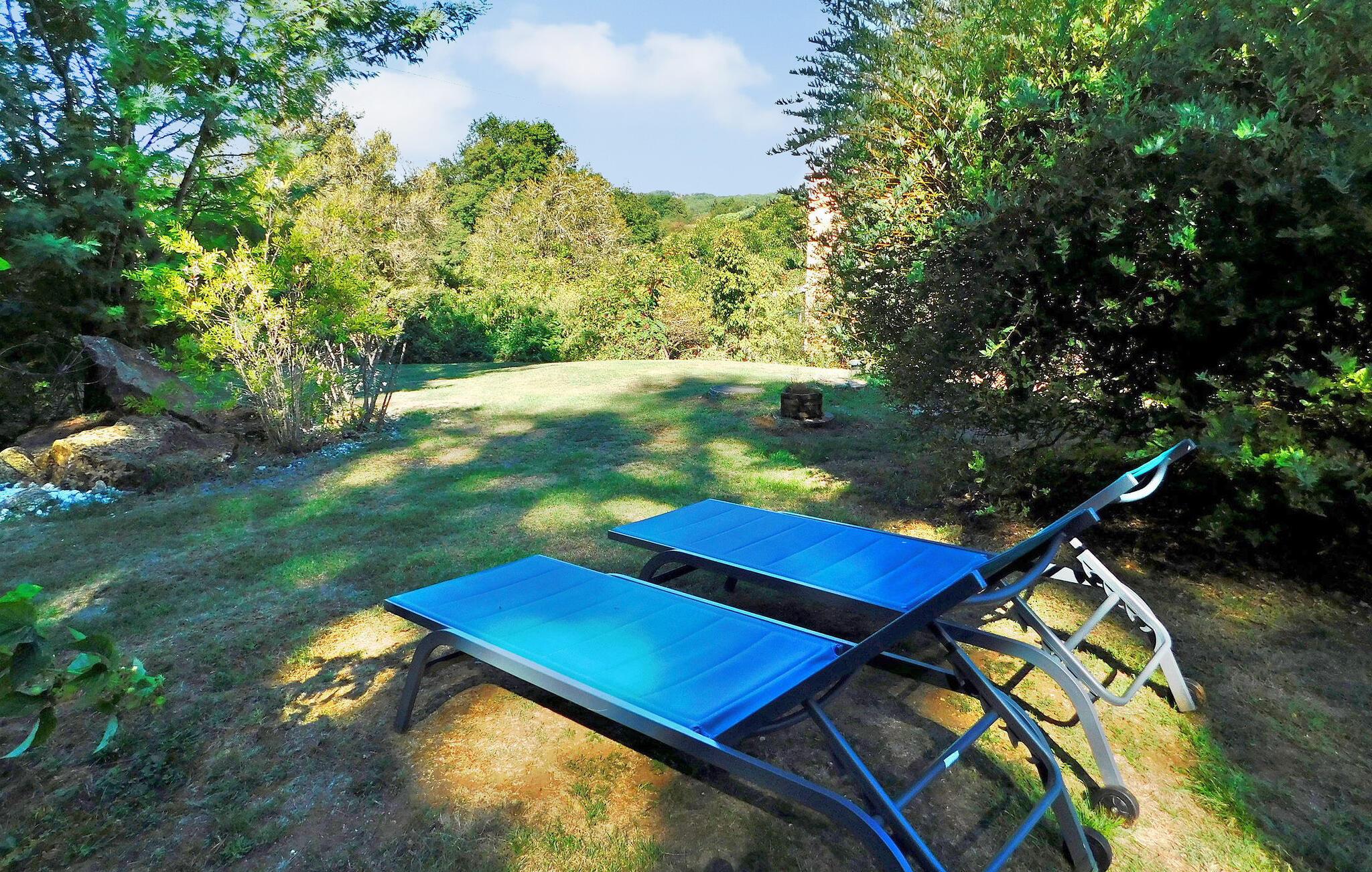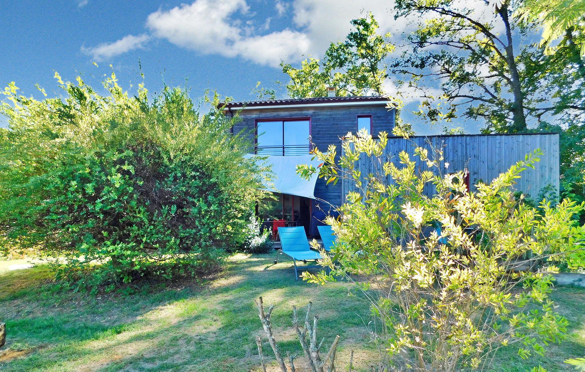 Dette charmerende træferiehus byder på plads på en ejendom sammen med to andre lejemål. Hver lejes privatliv er sikret med adskilte ydre. Ejendommen omfatter et indendørs afslapningsområde med hammam, sauna og jacuzzi samt et fælles fitnessrum/legelokale. Stueetagen består af en åben stue med spise- og køkkenpladser, en kælder, opholdsstue, toilet, et soveværelse med brusebad og et tilstødende soveværelse. Første sal indeholder de resterende soveværelser med tilhørende bruserum. Udendørs faciliteter omfatter en træterrasse med siddepladser og plancha samt en opvarmet swimmingpool (6m x 3,5m) med liggestole og parasol. Fælles faciliteter omfatter wellness-området, fitnessrum, spillelokale og petanquebane. Huset ligger i en lille landsby på en 3,5 hektar stor ejendom på landet omkring 0,5 km fra Prats-de-Carlux og 4 km fra Carlux.