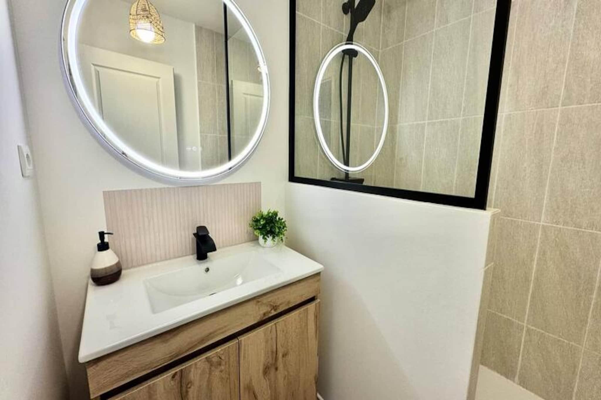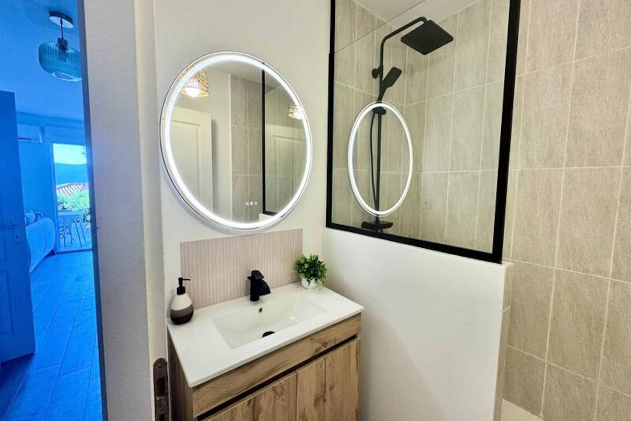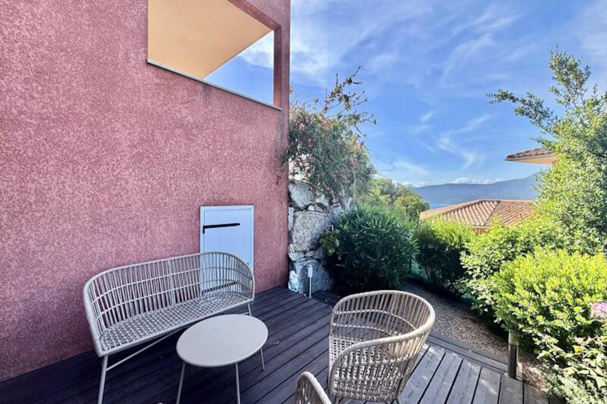 Højt over Proprianos glitrende kystlinje tilbyder denne stilfulde lejlighed et roligt tilflugtssted kun få minutter fra sandstrande og livlige lokale butikker. Her sætter den blide middelhavsbrise og glimt af havet fra din private terrasse tonen for en afslappende ferie i hjertet af Korsikas charme. Uanset om du søger ro eller eventyr, er dette moderne paradis perfekt placeret til at levere begge dele. \n\nTræd indenfor og oplev et gennemtænkt designet rum, hvor komfort møder elegance. Det åbne køkken, fuldt udstyret med moderne apparater, flyder problemfrit over i en hyggelig opholdsstue med en sovesofa og en spiseplads. Soveværelset, der er udsmykket med en blød 160 cm dobbeltseng, lover afslappende nætter, mens det elegante badeværelse tilføjer et strejf af luksus til dit ophold. Udenfor inviterer den møblerede terrasse dig til at nyde måltider tilberedt under åben himmel på stegepladen eller i sommerkøkkenet, alt imens du nyder de bløde farver fra middelhavssolnedgangen. \n\nBekvemmelighed er nøglen, med faciliteter som aircondition, fiberoptisk Wi-Fi og et tv udstyret med Netflix og større kanaler, der sikrer en problemfri oplevelse. En dedikeret parkeringsplads bidrager til at gøre dit ophold endnu nemmere, mens sengelinned og rengøring efter afrejse sikrer ultimativ komfort. \n\nDenne lejlighed ligger kun en kort køretur fra Proprianos travle marina, naturskønne vandrestier og kulturelle vartegn og er din indgang til at opdage Korsikas naturlige skønhed og rige kulturarv. Uanset om du udforsker øens barske klipper eller forkæler dig selv med dens kulinariske lækkerier, tilbyder denne ejendom den perfekte base for uforglemmelige minder.