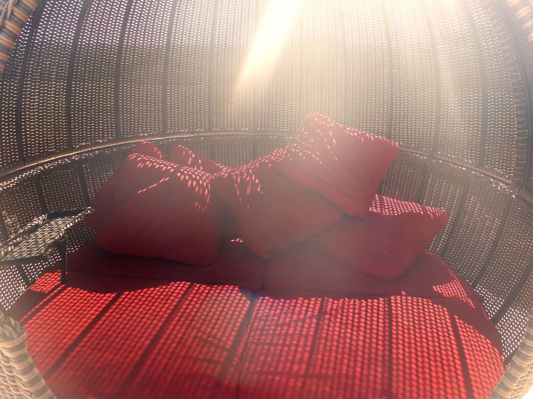 The air-conditioned master bedroom in the main house has a Super-king size bed and a luxury ensuite with a huge freestanding bath, a walk in rain shower, his ‘n’ hers washbasins and a WC. There is also a Loaf chaise longue and footstool for some quiet time.