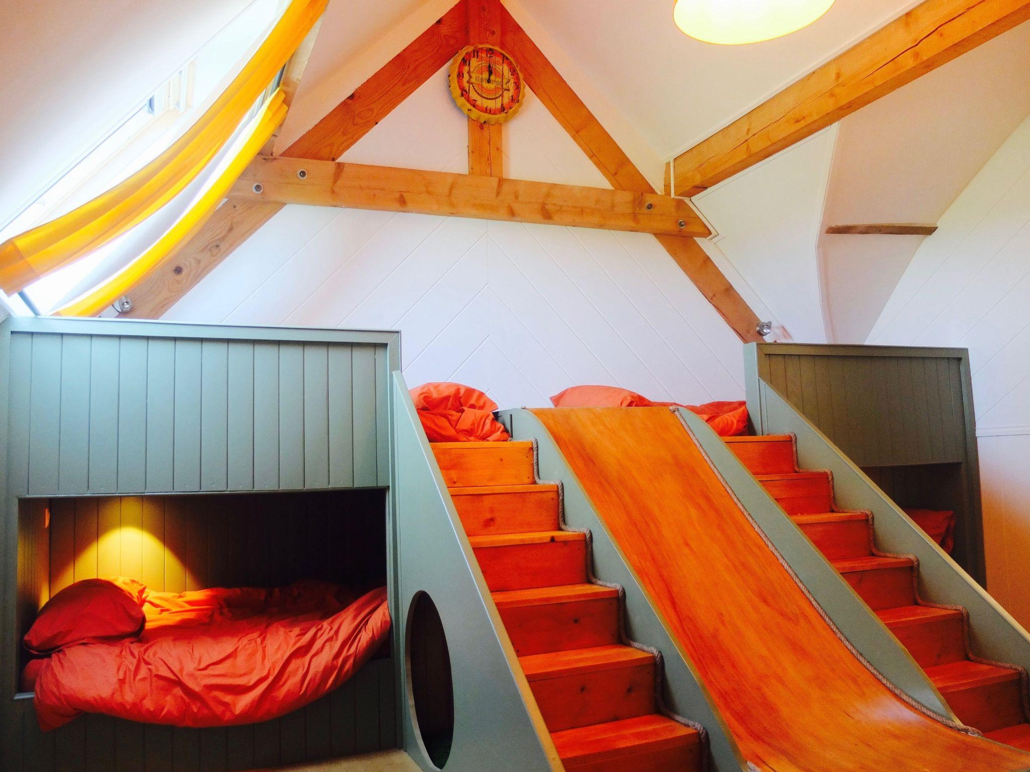 At the other end of the minstrel’s gallery is the fab children’s bedroom, also air-conditioned, with four, bespoke built-in bunk beds each with their own reading light that have a porthole den beneath the steps and a wooden slide to slip down onto a cushion. With a curved hobbit hole style WC with basin.