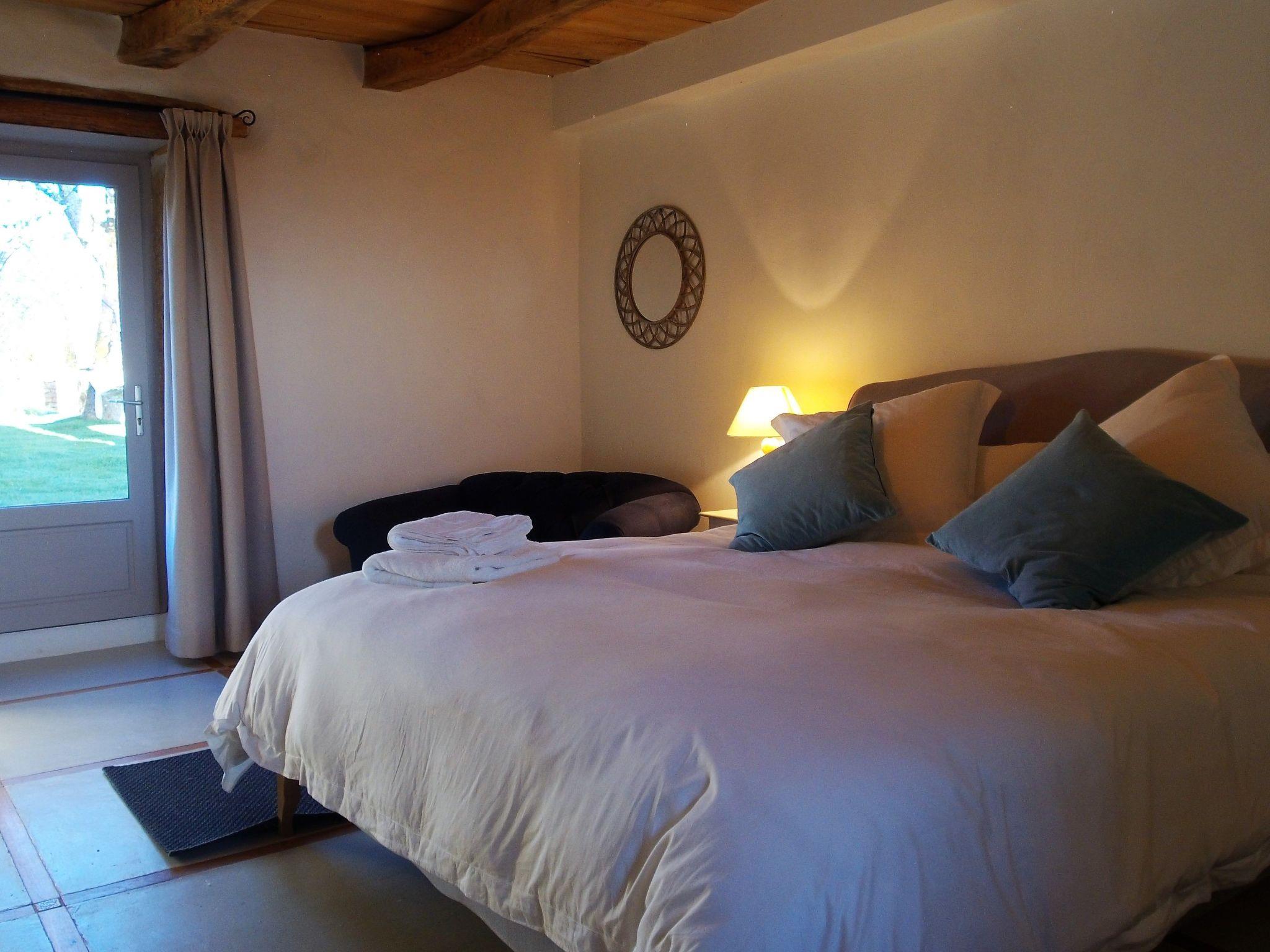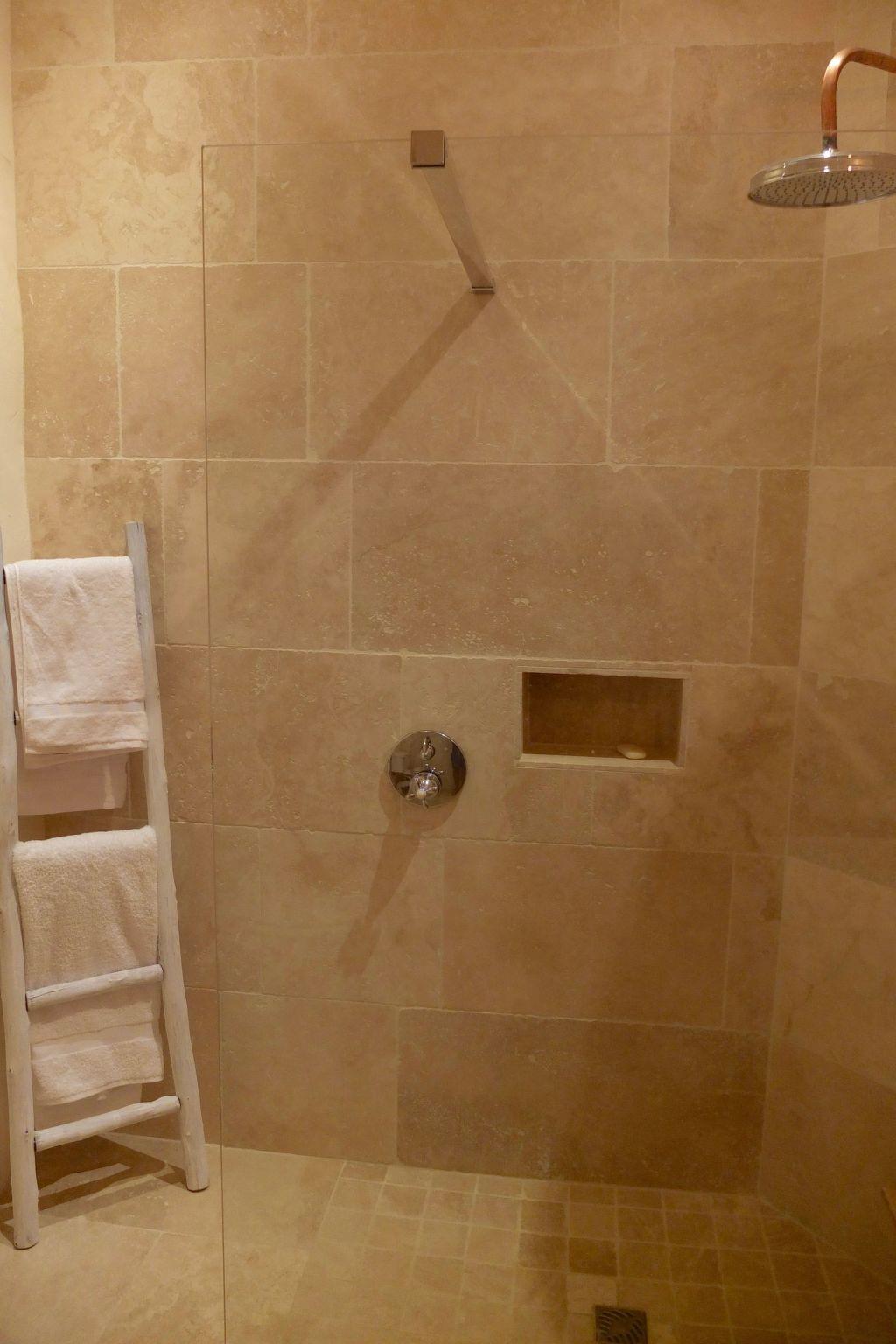 In another wing of the farmhouse, there is a second bedroom with a super-king size bed, French doors out to the courtyard and a window overlooking the West facing terrasse. A shower room with double Belfast basin and walk in rain shower with a separate WC, shared with the bedroom 2 are just along the corridor.
