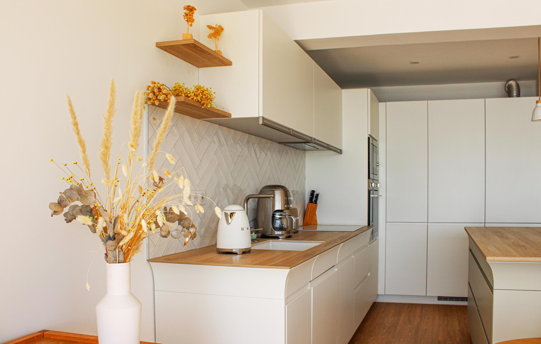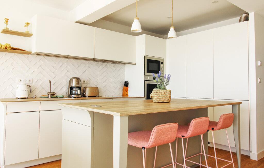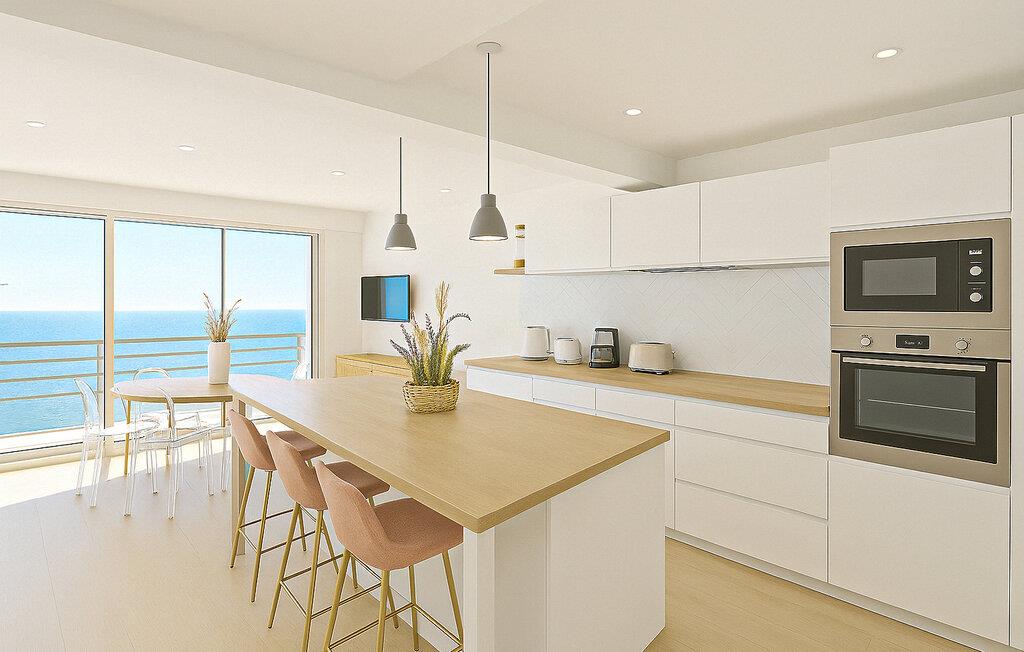 Nyd den lyse opholdsstue med store vinduer, der tilbyder uhindret udsigt over havet. De moderne møbler er rene og harmoniske og skaber en rolig og indbydende atmosfære. Sæt jer godt til rette i sofaen og nyd udsigten over vandet. Tilbered jeres måltider i det åbne køkken og brug den rummelige køkkenø som et centralt samlingssted.