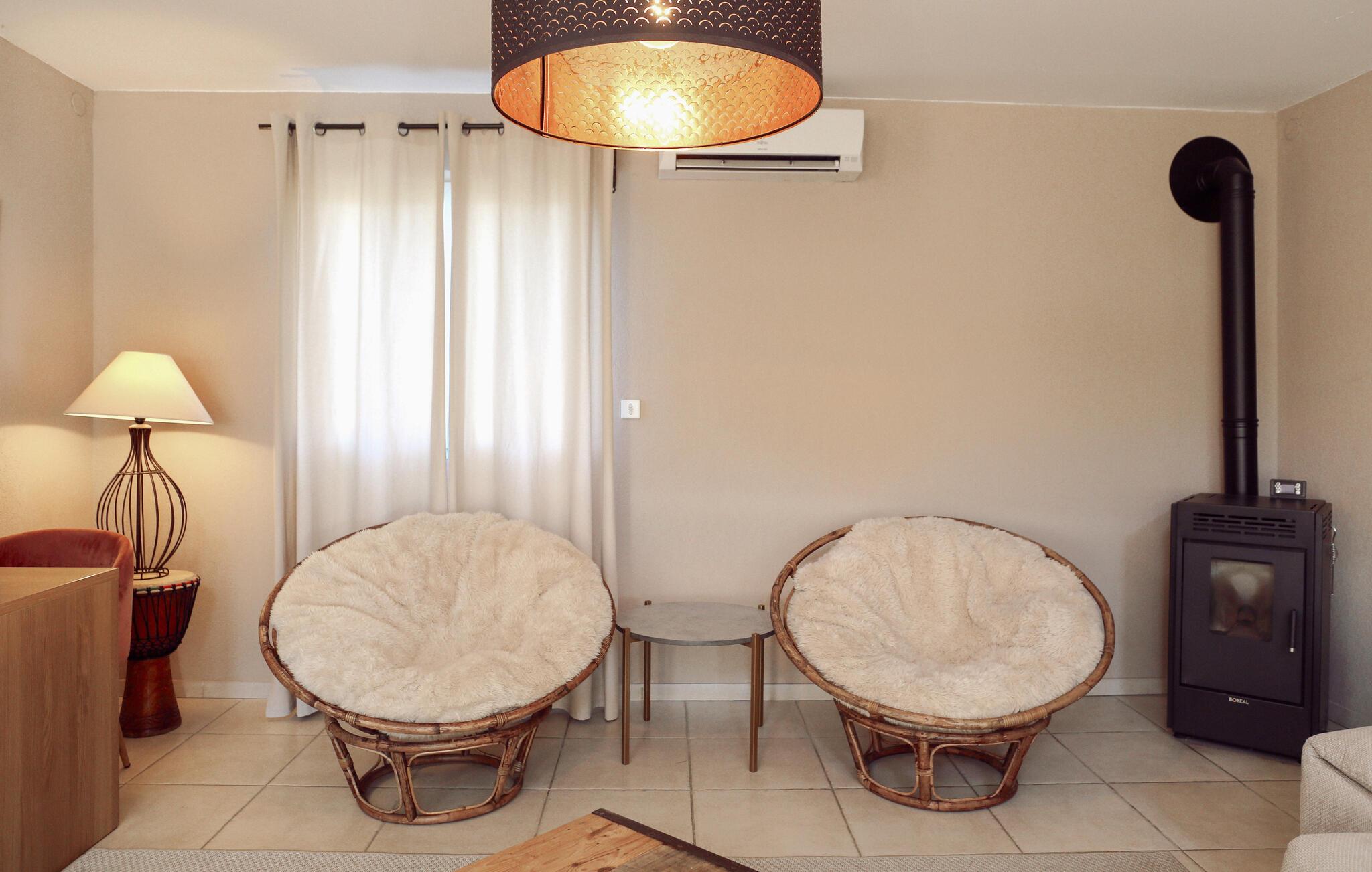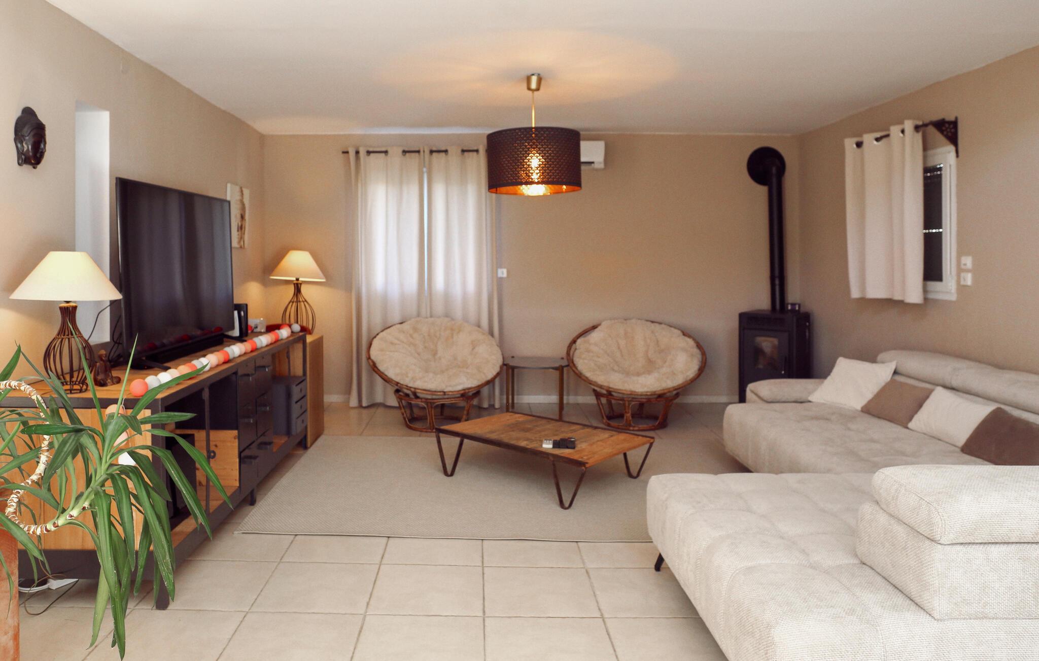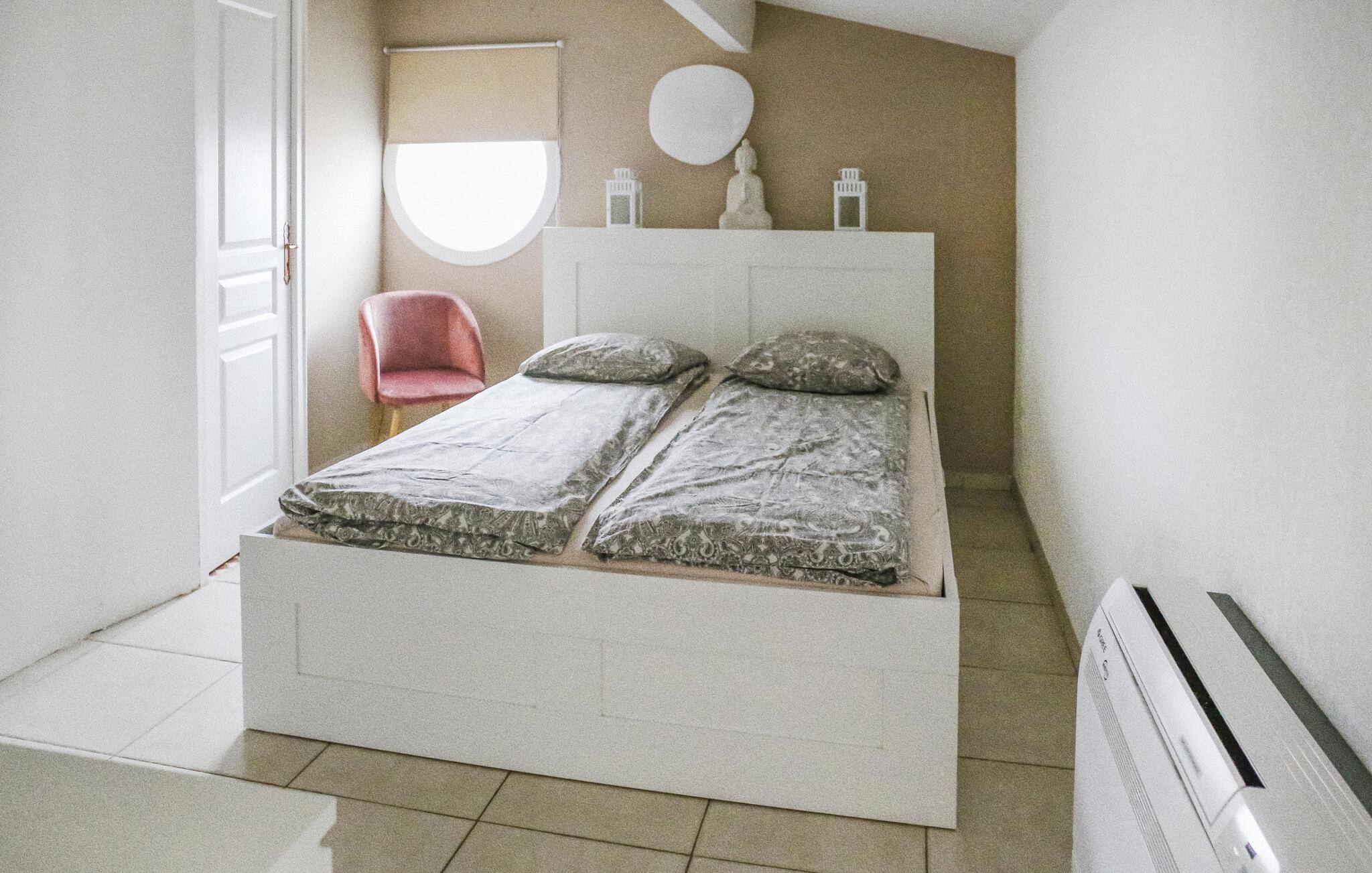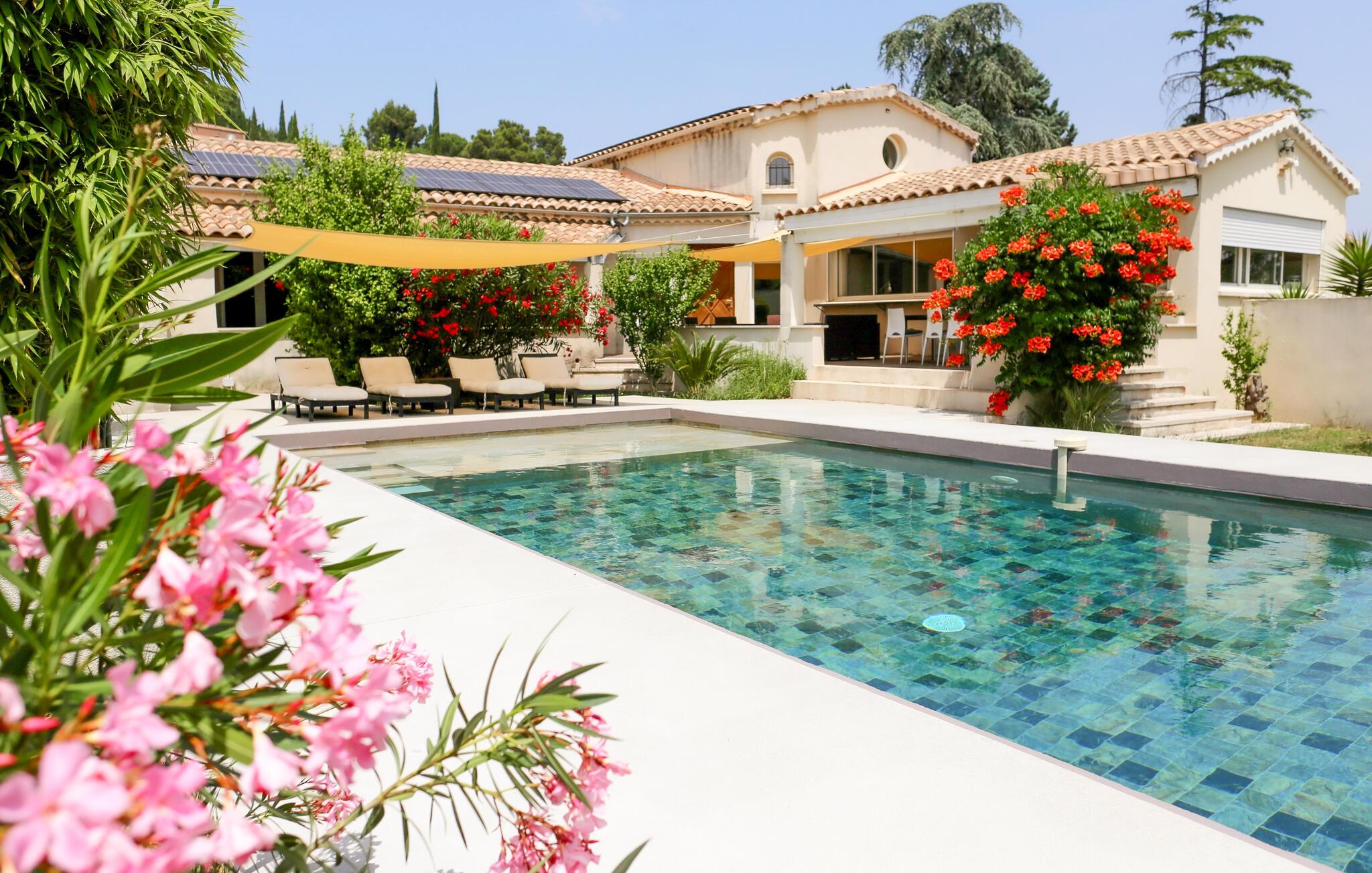Dette tidssvarende feriehus i Rochefort-du-Gard er omgivet af en 1.600 m² stor have med blomster og oliventræer. Glæd jer til jeres egen pool med generøs terrasse. Den landlige beliggenhed lover ro og afslapning, for eksempel på de dels solrige, dels overskyggede terrasser. I stueetagen venter et meget generøst udmålt dagligområde med amerikansk køkken, behageligt badeværelse samt to soveværelser og en stor entre. Det tredje soveværelse ligger ovenpå og har eget badeværelse. Den arkitektoniske arv af Rochefort-du-Gard er ganske dejlig. Oplev kirken Le Castelas eller klosteret Sanctuaire Notre-Dame-de-Grâce. Lige i nærheden ligger den historiske by Avignon for jeres fødder. Der kan I opleve det forhenværende pavepalads samt ruinen af broen, der ender pludseligt over Rhône, og deltag også i den internationale teaterfestival, hvis I har lyst. Også Villeneuve-lès-Avignon med sin charmerende gamle by og kapellet Pénitents Gris er en udflugt værd, og i Uzès med hyggelige Place aux Herbes, arkader og markeder kan I dykke ned i middelalderatmosfære. Naturentusiaster kan finde lykken i Camargue med sin enestående natur med tyre, heste og flamingoer. En storslået feriebolig til en vellykket ferie i Gard og Vaucluse.