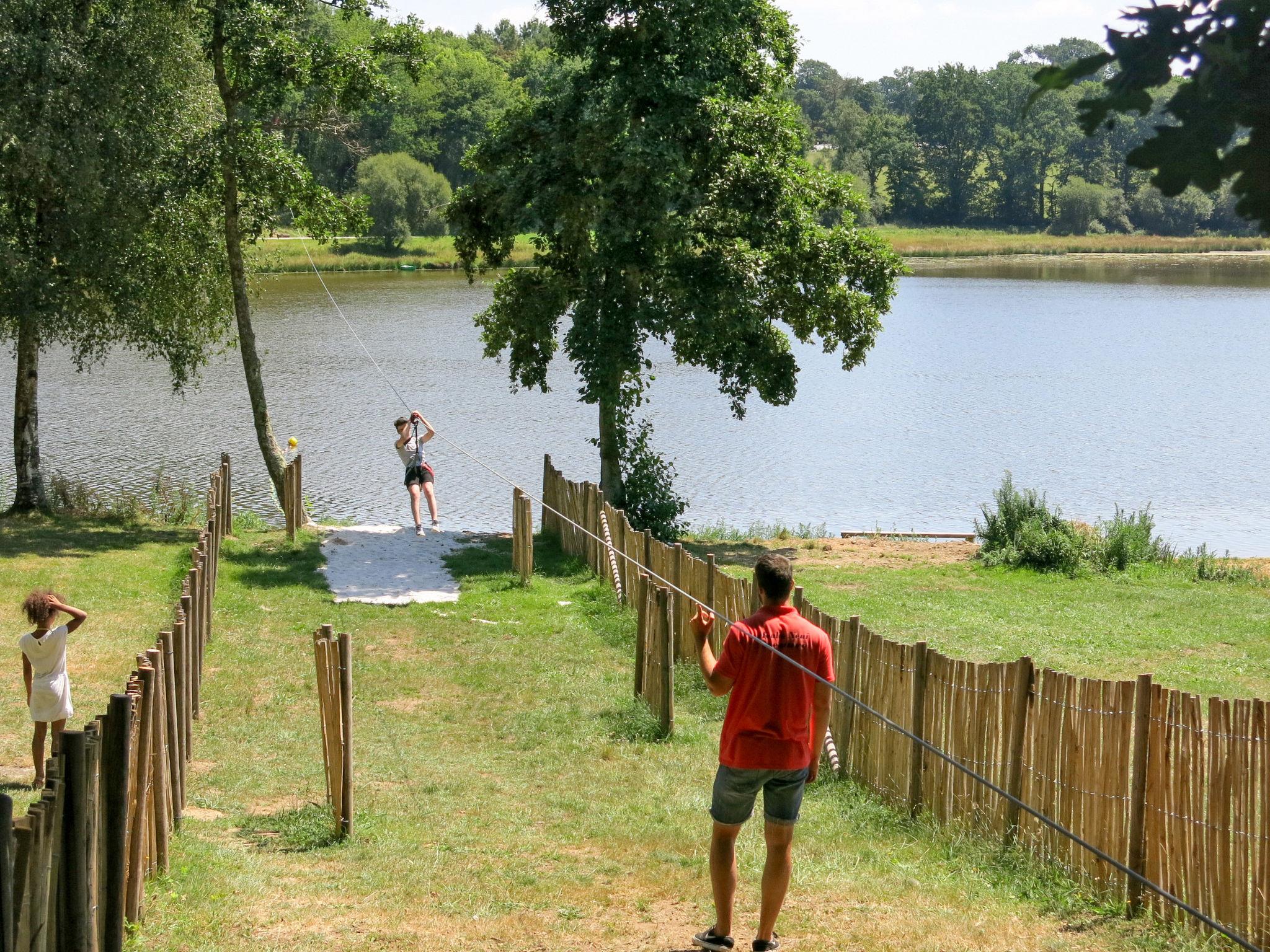 Child friendly resort "Le Moulin Neuf", built in 2017. 50 houses in the resort. 1.5 km from the centre of Rochefort-en-Terre, on the outskirts, 10 m from the lake. For shared use: property, park with lawn and trees, swimming pool heated, fenced (15 x 8 m, seasonal availability: 15.May. - 15.Sep.). Children's pool, tennis (extra), boccia, barbecue house, children's playground. In the complex: reception, washing machine, tumble dryer (for shared use, extra), bicycle rental. Parking. E-charging station. Supermarket 2 km, bus stop 1.5 km, sandy beach "Plage de l'Étang du Moulin Neuf" 500 m, park "de loisirs du Moulin neuf" 500 m. Sports centre 500 m. Nearby attractions: Tyrolienne, mur d’escalade. 500 m, Activités nautiques (paddle, canoé.) 500 m, Malansac (Parc de la Préhistoire) 5 km, La Gacilly 21 km, Damgan (plage Océan) 32 km, Vannes et Golfe du Morbihan 35 km. Hiking paths: GR34. Please note: car-free holiday complex. The photograph shows a typical example.