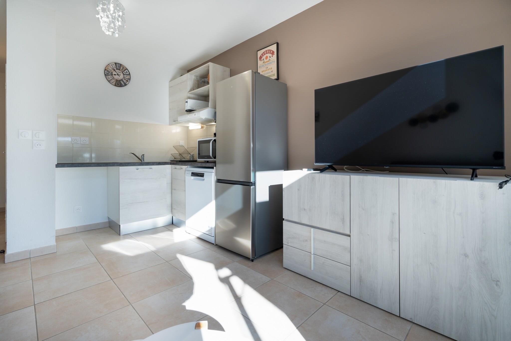 Denne charmerende villa på 45 m² i Sérignan har 1 soveværelse og rummer komfortabelt op til 4 gæster. Beliggende kun 450 meter fra sandstranden og inden for 1 km fra både et supermarked og en restaurant, tilbyder det en fredfyldt kystflugt i et roligt, familievenligt kvarter. Villaen har en privat have med udendørsmøbler, en indhegnet grund og en terrasse - perfekt til at slappe af i den friske havbrise. Gæsterne nyder moderne bekvemmeligheder, herunder aircondition, elvarme, tv og adgang til en fælles opvarmet swimmingpool. Udendørs parkering er tilgængelig på stedet for ekstra bekvemmelighed. Indvendigt er det elektriske køkken i åbent plan fuldt udstyret med køleskab, mikroovn, opvaskemaskine, kaffemaskine, brødrister, kedel og alle nødvendige redskaber. Uanset om du forbereder en morgenmad ved stranden eller en hyggelig middag, er alt hvad du behøver lige ved hånden.