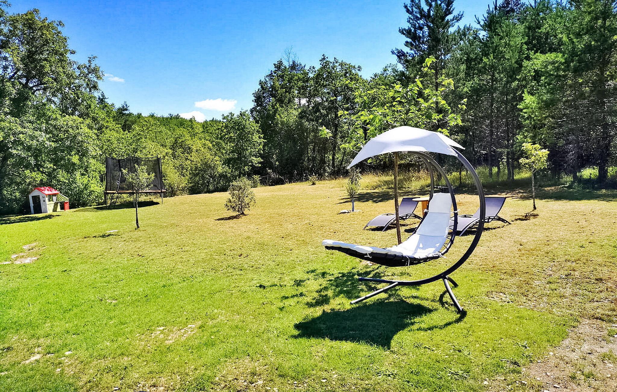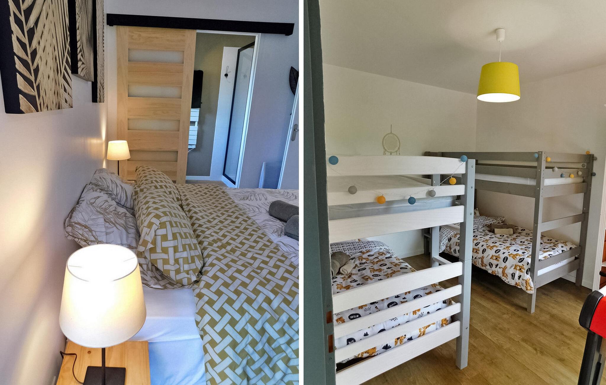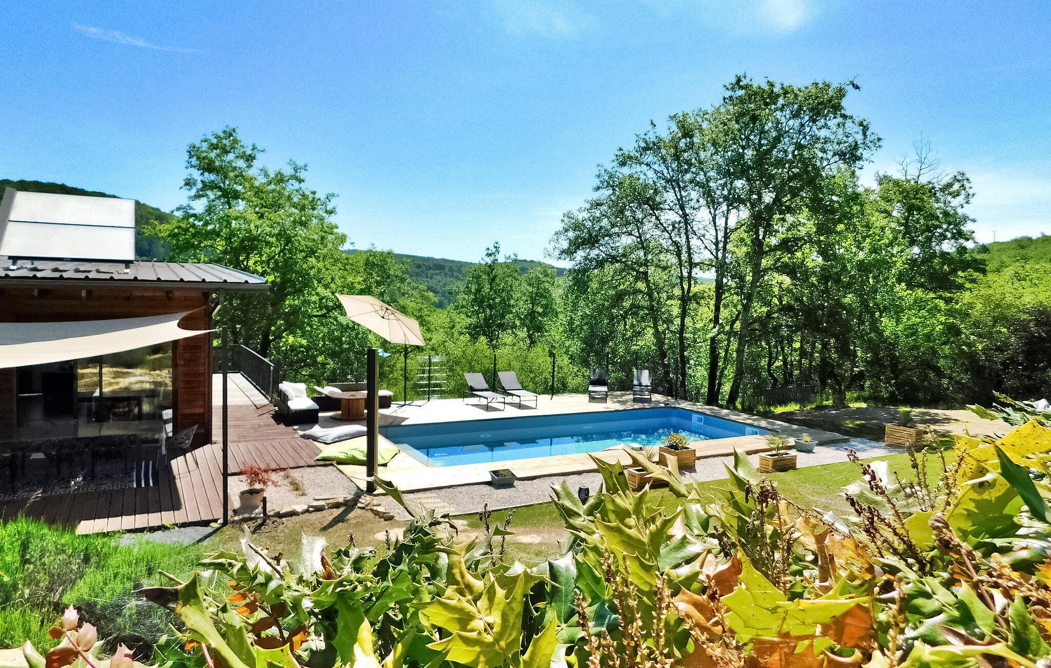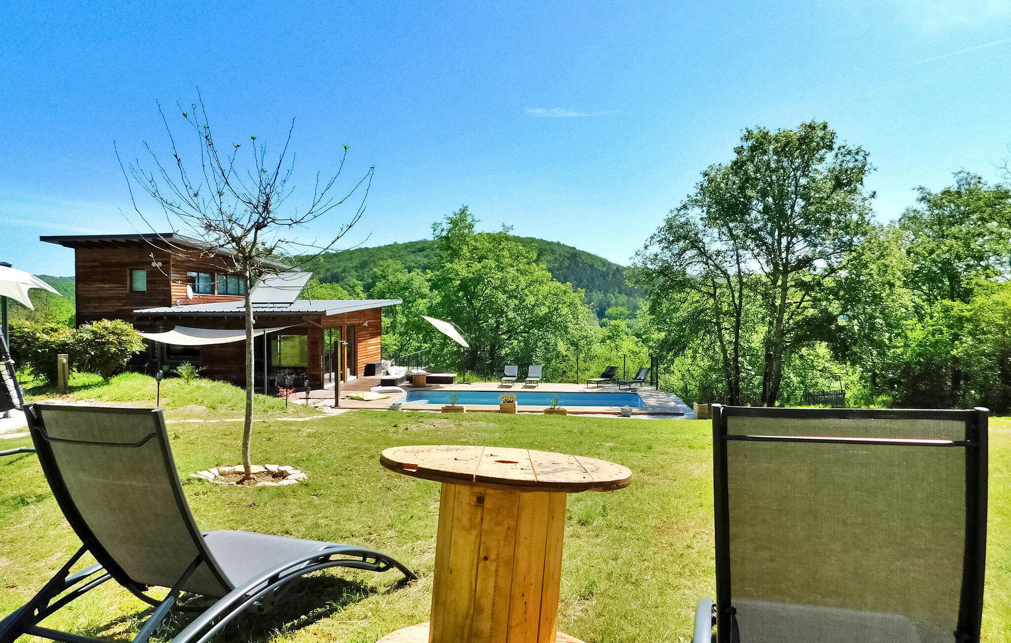 Dette moderne træferiehus i Dordogne ligger i rolige landlige omgivelser nær Saint Amand de Coly. Huset har et airconditioneret og lysende stueetage med en hyggelig opholdsstue, spiseplads og et åbent køkken udstyret med essentielle apparater. Stueetagen rummer desuden to soveværelser, hvoraf det ene er indrettet med køjesenge og et fodboldbord til børn. Ovenpå er der to soveværelser med aircondition og et fælles brusebad. Udenfor byder ejendommen på en privat opvarmet swimmingpool, legeplads med trampolin og legehus, flere terrasser med udendørsmøbler og plancha. Bemærk venligst, at hovedadgangen er gennem en trætrappe med gelændere og en adgangslåge. Om vinteren er opvarmning leveret af en pilleovn. Huset ligger på landet uden for landsbyen Saint-Amand-de-Coly (lokal købmand, restaurant og brøddepot).