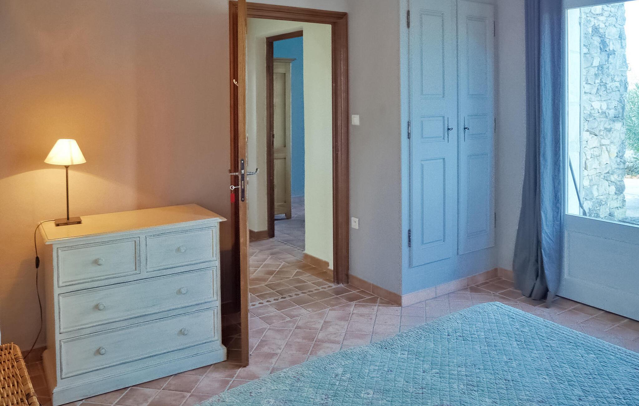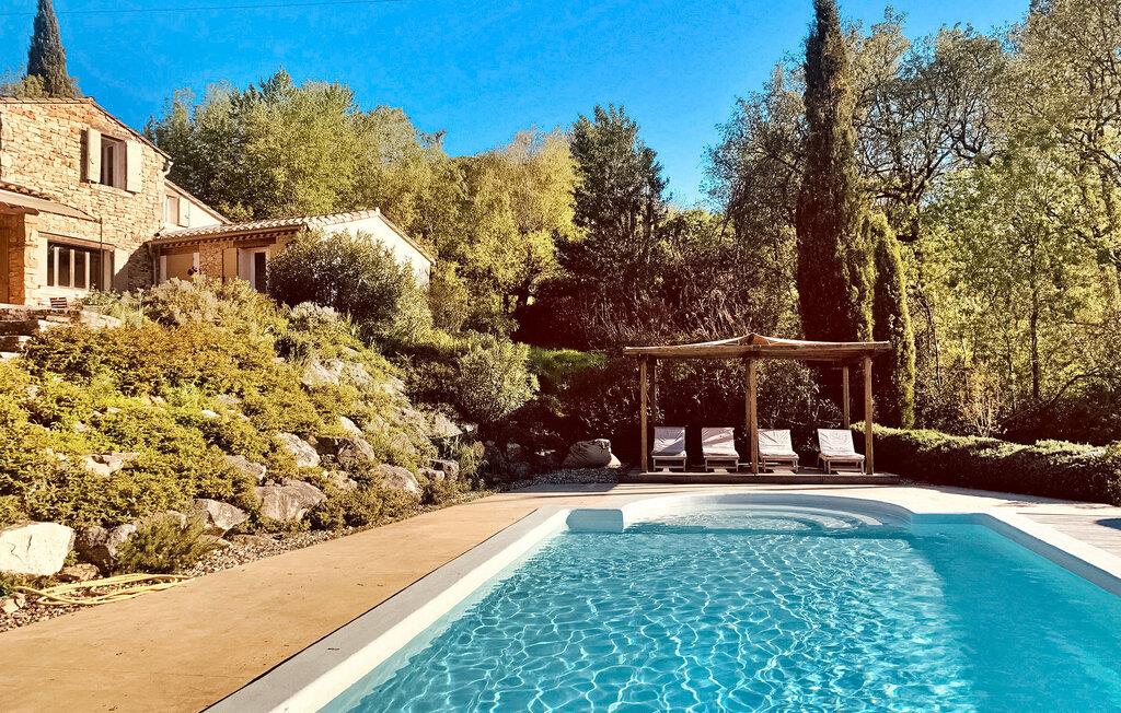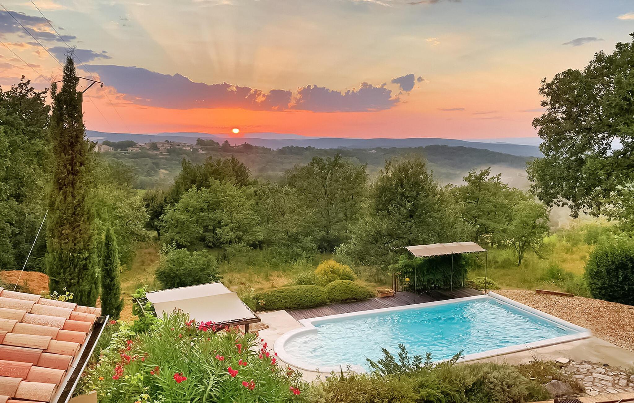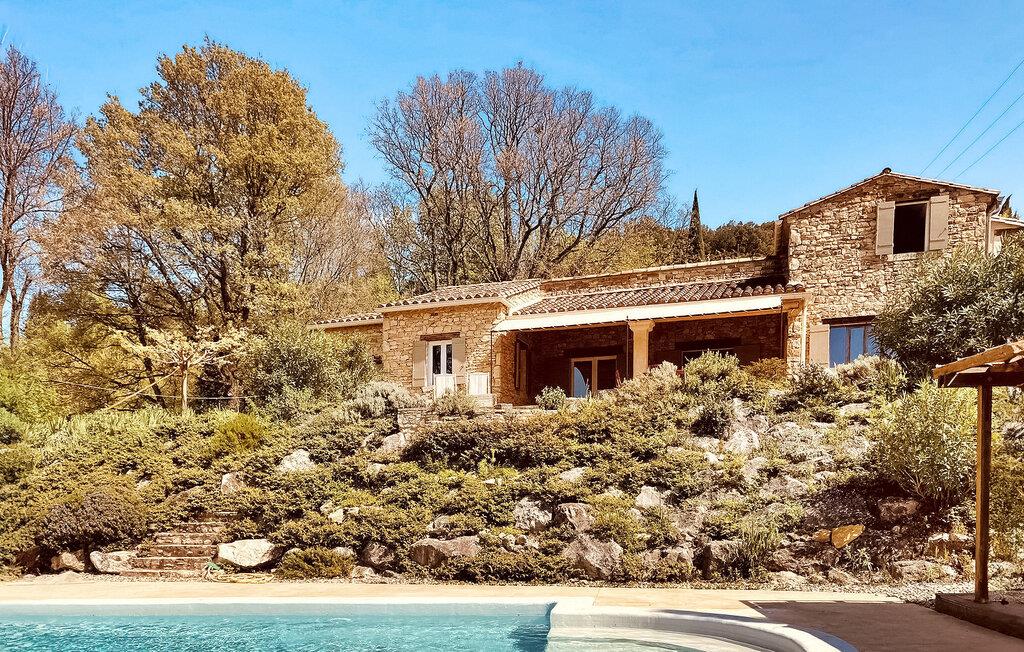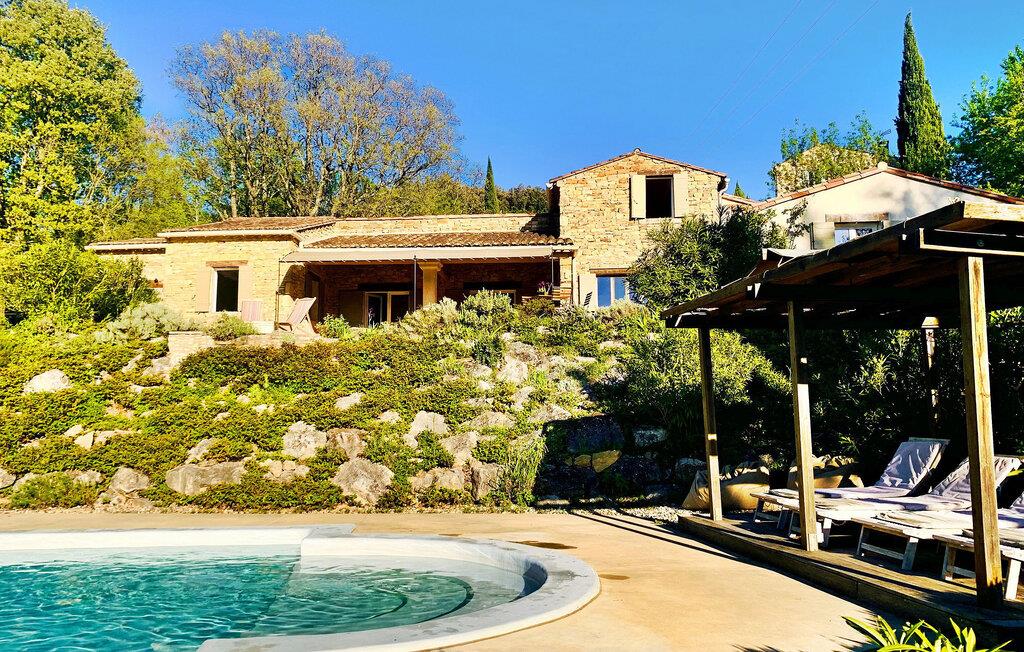 Ferievillaen i Gard Provence har en naturskøn beliggenhed i St. André d'Olérargues med en rummelig terrasse og en opvarmet pool med en fængslende udsigt over dalen. I ejendommens stueetage er der fuldt udstyret køkken med direkte udgang til terrasse og rummelig stue med franske vinduespartier ud til terrassen samt to soveværelser og et badeværelse. På første sal er der et ensuite soveværelse. I venstre fløj af ejendommen finder du soveværelse og tv-stue med sovesofa. Over tv-stuen er der en åben mezzanin med to enkeltsenge. På grund af rummets lave højde er mezzaninen mere velegnet til børn/teenagere. Dog bør meget små børn være under opsyn her (åbne trapper). Udenfor er en privat opvarmet swimmingpool (12m x 6m) med terrasser, liggestole og en stor delvist overdækket terrasse med siddepladser. Grunden er ikke indhegnet og er udformet i forskellige niveauer. Huset er roligt beliggende, i rolige og meget naturlige, men ikke isolerede omgivelser, lige under en lille landsby. Bageri og købmand omkring 3 km væk, flere butikker og restauranter i Goudargues (10 min i bil, 7,5 km). I omgivelserne kan du besøge følgende turiststeder: La Roque sur Cèze (vandfald og svømning) 11 km, den meget smukke landsby Goudargues (restauranter og terrasser) 7,5 km. Og den meget smukke historiske landsby Montclus (17 km). Den meget smukke by Uzès (21 km). Barjac (ved 26 km), Pont St. Esprit og Gorges de l'Ardèche (canyoning, kanosejlads, ca. 45 min. kørsel).