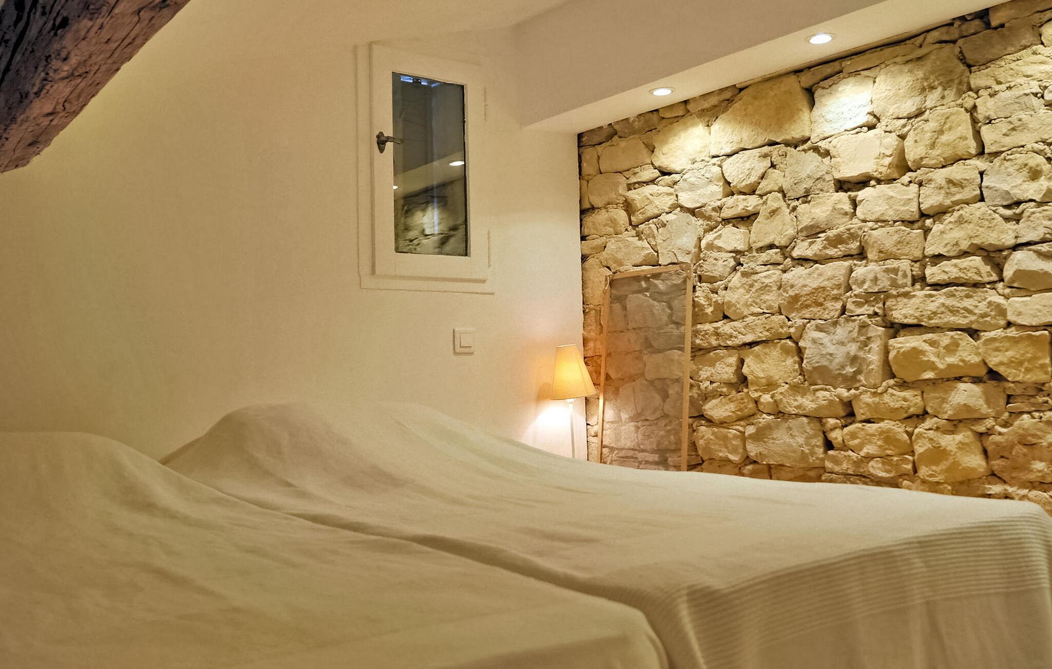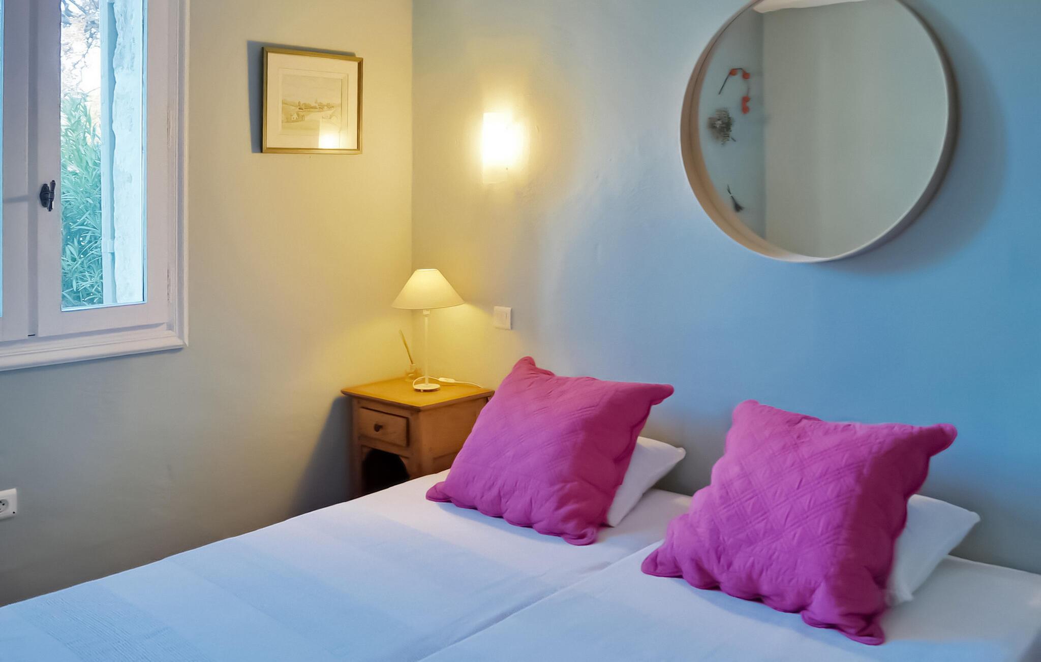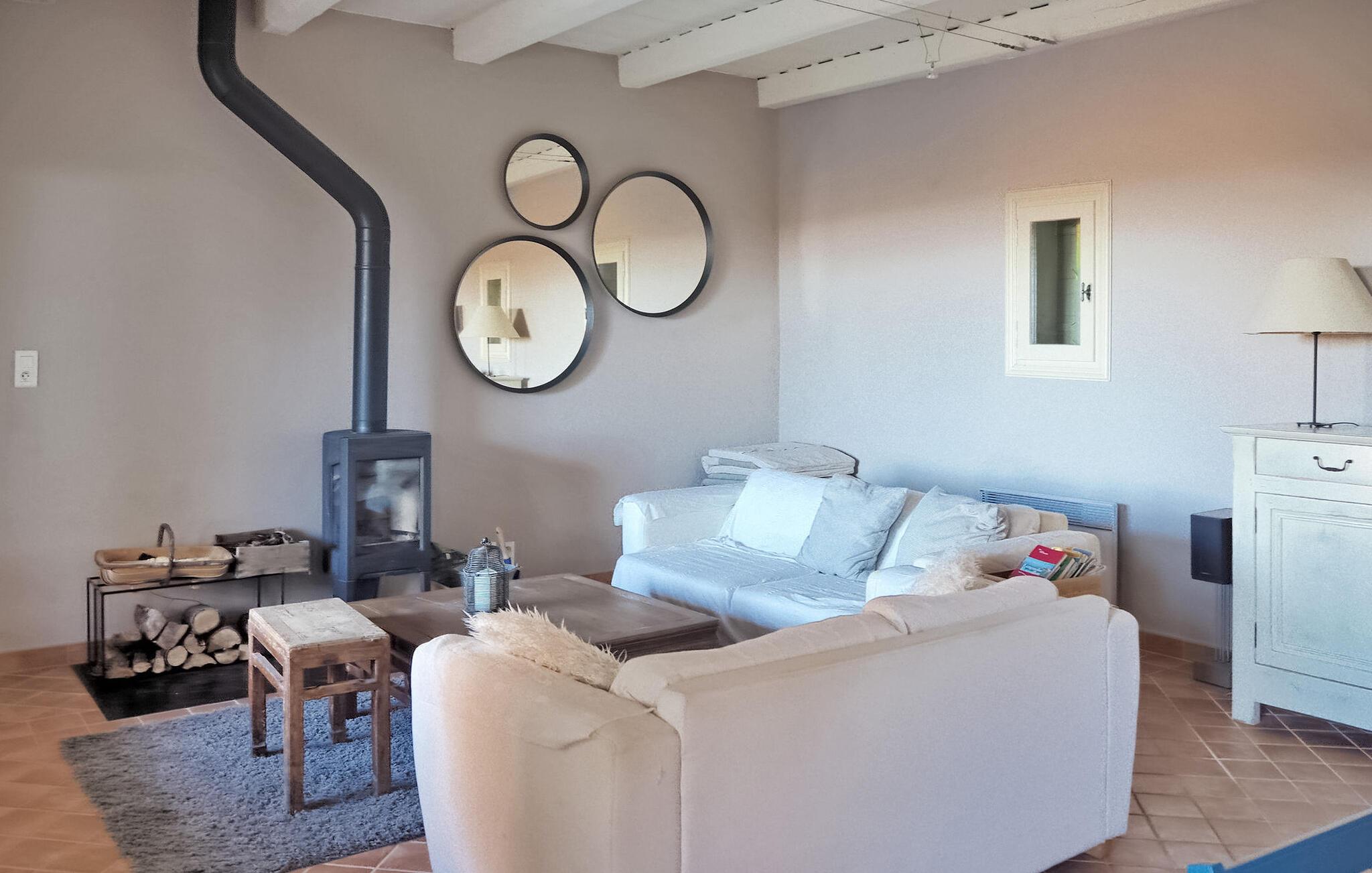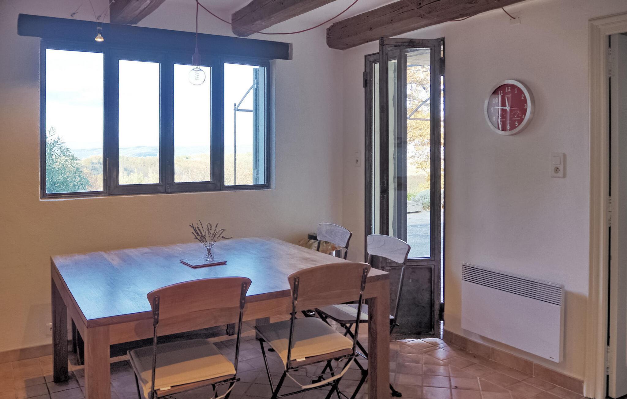 Ferievillaen i Gard Provence har en naturskøn beliggenhed i St. André d'Olérargues med en rummelig terrasse og en opvarmet pool med en fængslende udsigt over dalen. I ejendommens stueetage er der fuldt udstyret køkken med direkte udgang til terrasse og rummelig stue med franske vinduespartier ud til terrassen samt to soveværelser og et badeværelse. På første sal er der et ensuite soveværelse. I venstre fløj af ejendommen finder du soveværelse og tv-stue med sovesofa. Over tv-stuen er der en åben mezzanin med to enkeltsenge. På grund af rummets lave højde er mezzaninen mere velegnet til børn/teenagere. Dog bør meget små børn være under opsyn her (åbne trapper). Udenfor er en privat opvarmet swimmingpool (12m x 6m) med terrasser, liggestole og en stor delvist overdækket terrasse med siddepladser. Grunden er ikke indhegnet og er udformet i forskellige niveauer. Huset er roligt beliggende, i rolige og meget naturlige, men ikke isolerede omgivelser, lige under en lille landsby. Bageri og købmand omkring 3 km væk, flere butikker og restauranter i Goudargues (10 min i bil, 7,5 km). I omgivelserne kan du besøge følgende turiststeder: La Roque sur Cèze (vandfald og svømning) 11 km, den meget smukke landsby Goudargues (restauranter og terrasser) 7,5 km. Og den meget smukke historiske landsby Montclus (17 km). Den meget smukke by Uzès (21 km). Barjac (ved 26 km), Pont St. Esprit og Gorges de l'Ardèche (canyoning, kanosejlads, ca. 45 min. kørsel).