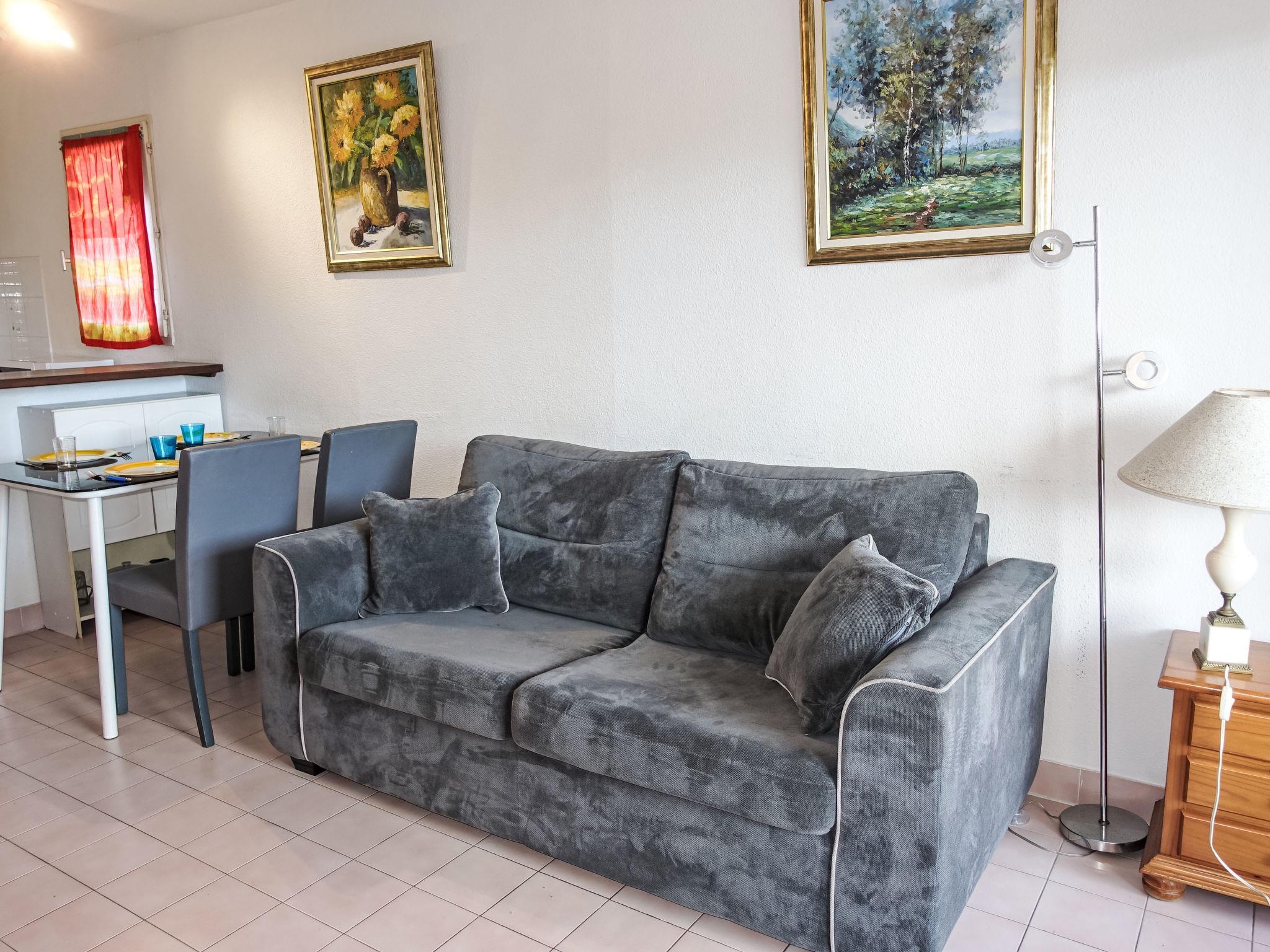 1-room apartment 27 m2 on 1st floor, south-east facing position. Simple furnishings: living/dining room with 1 double sofabed (1 x 140 cm, length 190 cm), TV (flat screen), fan. Exit to the terrace. Sleeping alcove with 1 x 2 bunk beds (80 cm), fan. Kitchenette (4 hot plates, oven, toaster, kettle, microwave, freezer, electric coffee machine). Bath/WC. Electric heating. Terrace 6 m2 partly roofed, south-east facing position. Terrace furniture, deck chairs (1). Facilities: hair dryer. Internet (WiFi, extra). Parking space n 4. Please note: not suitable for children under 6 years apartment street side. Non-smokers only. TV only FR. Smoke alarm. Instead of an enclosed bedroom, some sleeping areas are located in an open-plan area (gallery, alcove, etc.). OSLQAS