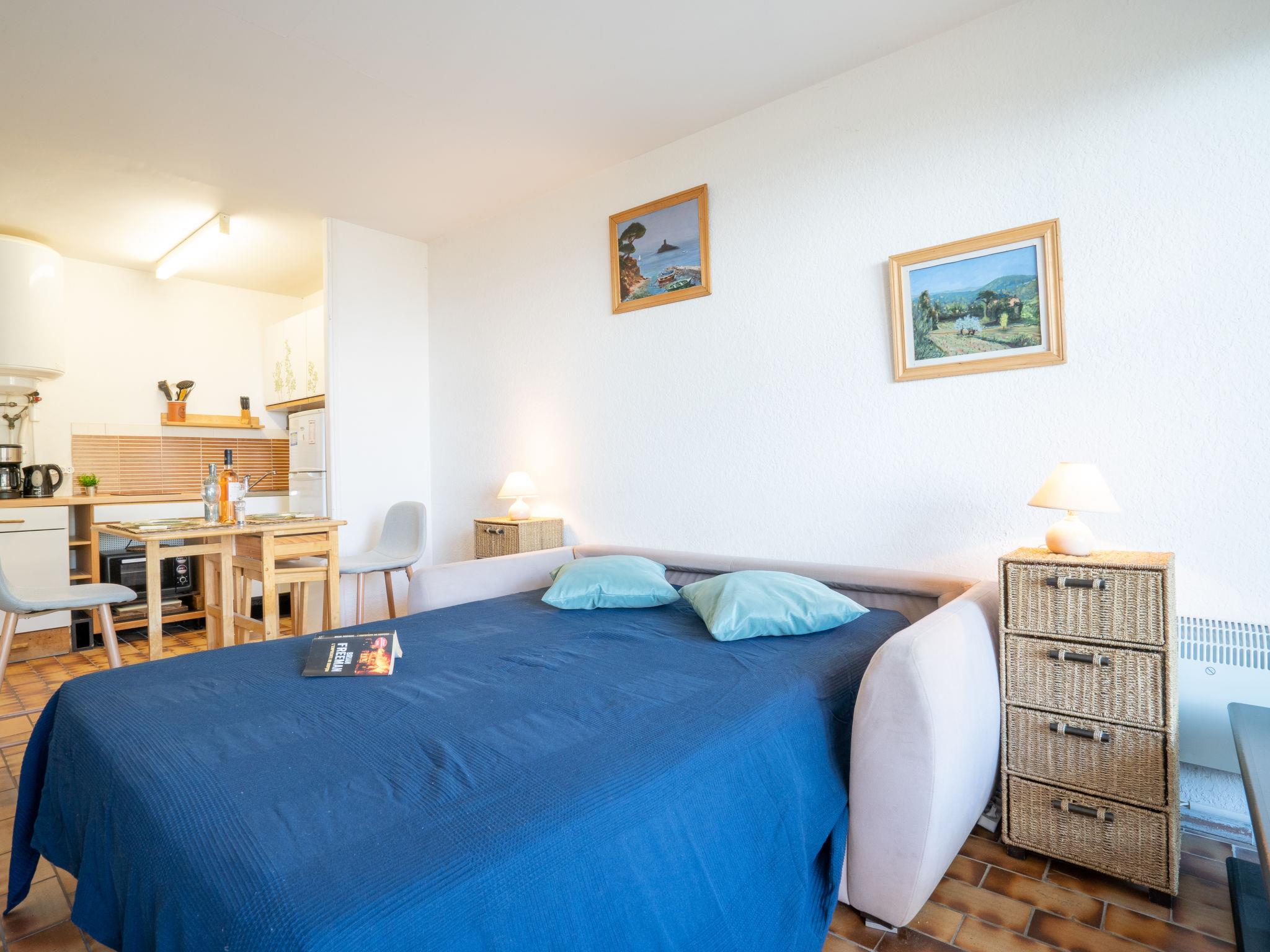 1-room studio 28 m2, on the ground floor, east facing position. Beautiful furnishings: living room with panoramic window with 1 double sofabed (160 cm, length 190 cm), TV and fan. Exit to the terrace. Kitchenette (oven, 2 ceramic glass hob hotplates, toaster, kettle, microwave, freezer, electric coffee machine). Shower/WC. Heating. Terrace 18 m2, east facing position. Terrace furniture, deck chairs (2). View of the sea. Facilities: iron. Internet (WiFi, extra). Parking space n B14. Please note: TV only FR. Smoke alarm. FJS830HT