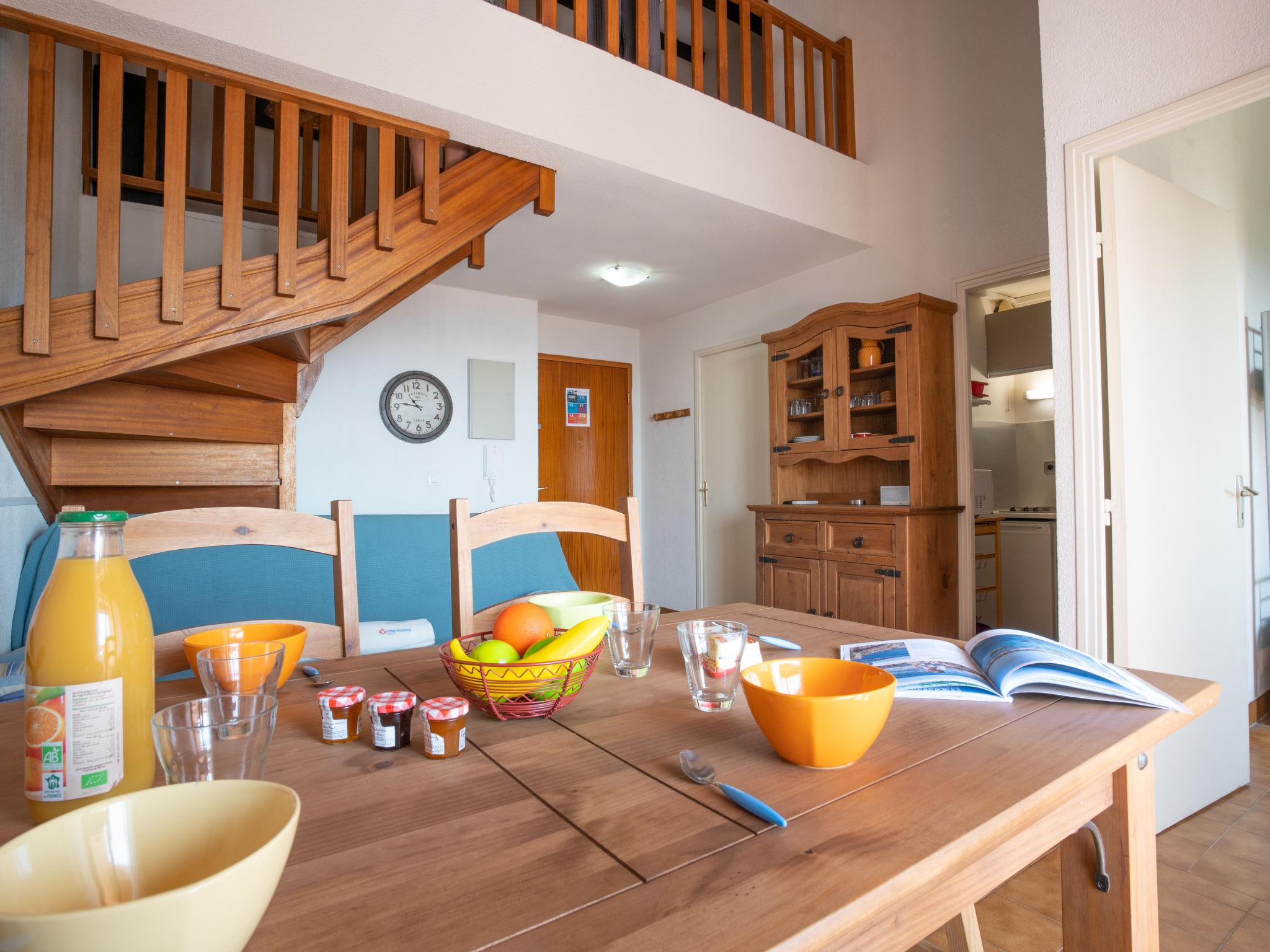 2-room apartment 41 m2 on 2 levels on 4th floor, south-east facing position. Simple furnishings: living/dining room with 1 sofabed, TV, radio and air conditioning. Exit to the terrace. 1 small room with 1 x 2 bunk beds (90 cm, length 190 cm), fan. Gallery with 1 french bed (1 x 140 cm, length 190 cm). Small kitchen (2 hot plates, toaster, kettle, electric coffee machine, combination microwave). Bath/WC. Heating. Terrace 5 m2. Terrace furniture. View of the sea. Facilities: iron, hair dryer. Internet (WiFi, extra). Please note: TV only FR. Smoke alarm. Instead of an enclosed bedroom, some sleeping areas are located in an open-plan area (gallery, alcove, etc.). FJS1139HT