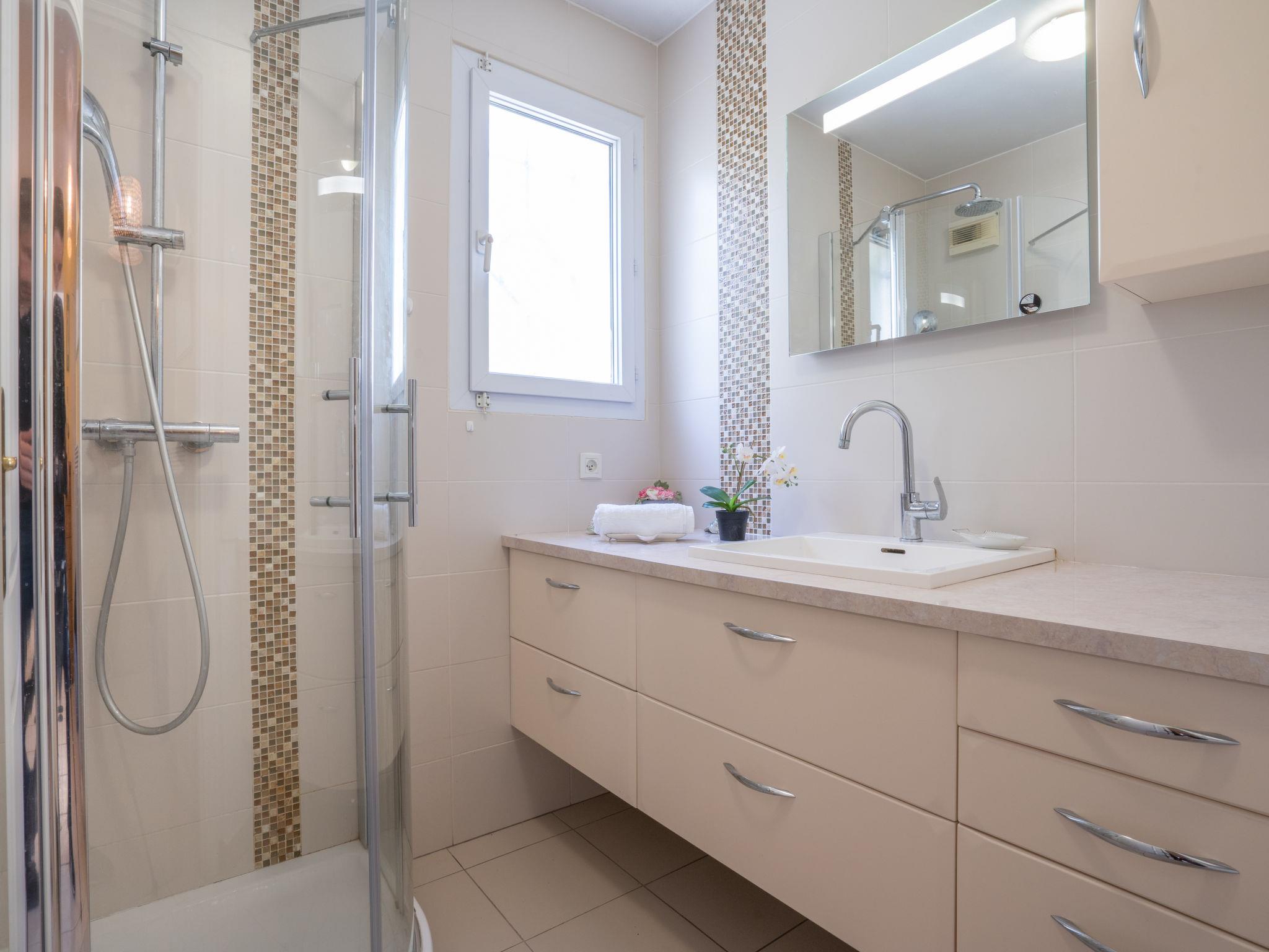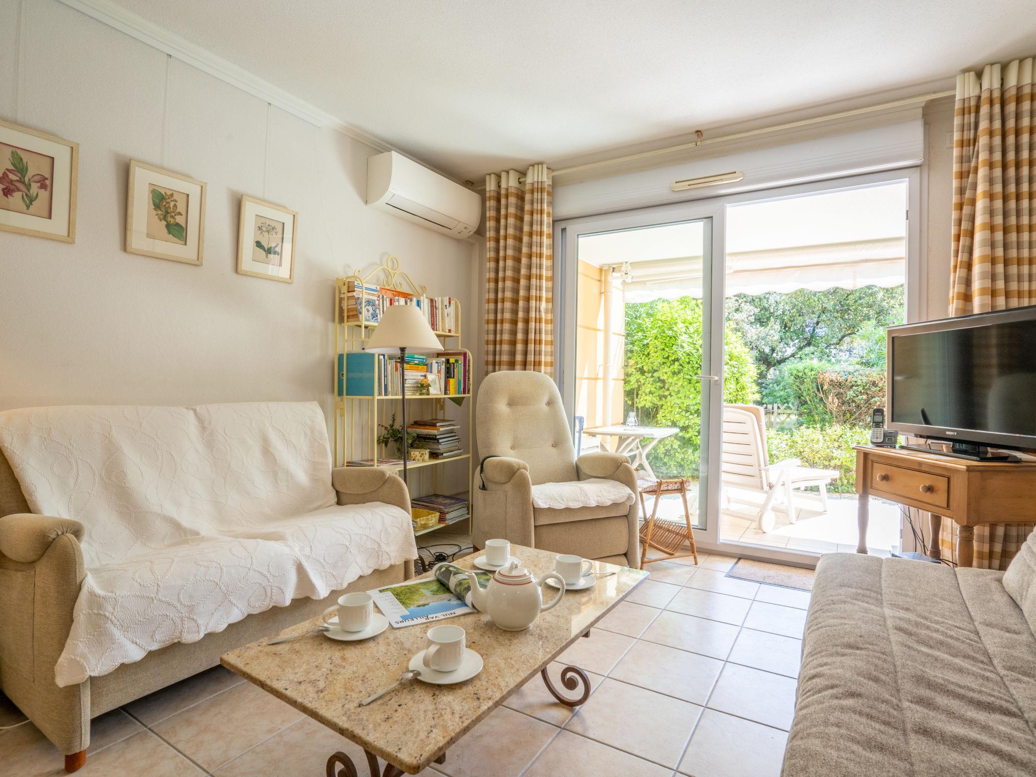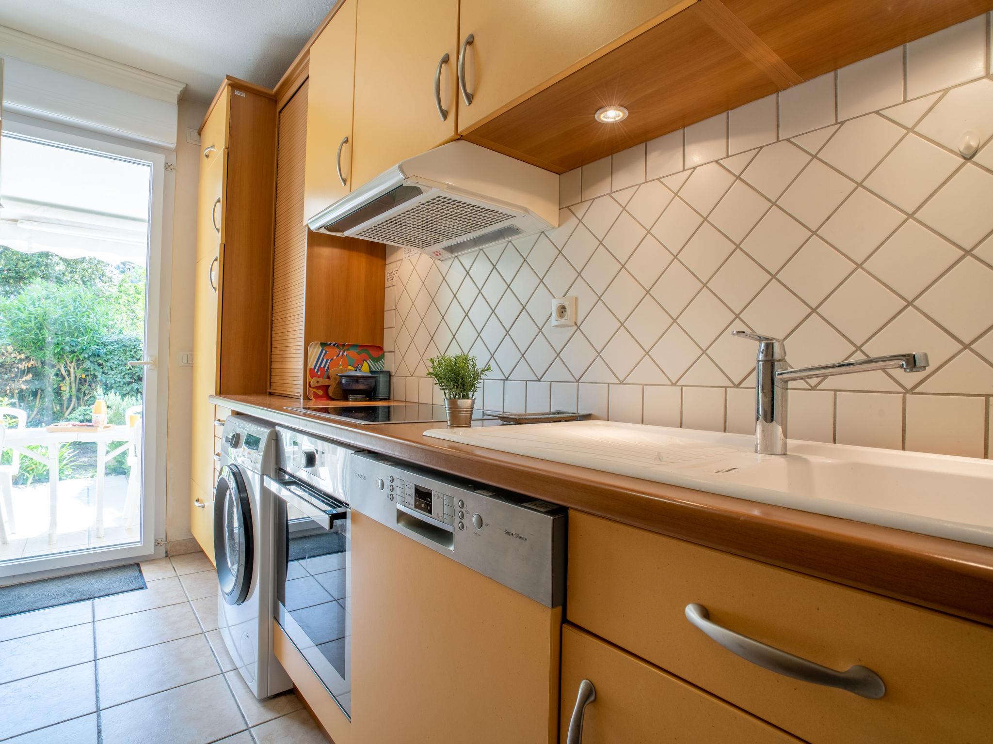 2-room apartment 52 m2, on the ground floor. Comfortable and beautiful furnishings: living/dining room with 1 double sofabed (1 x 140 cm, length 190 cm), TV (flat screen), DVD and air conditioning. Exit to the terrace, to the patio. 1 room with 1 french bed (1 x 140 cm, length 190 cm), fan. Kitchen (oven, dishwasher, 4 ceramic glass hob hotplates, toaster, kettle, microwave, freezer, electric coffee machine). Exit to the terrace, to the patio. Shower, sep. WC. Heating. Terrace 30 m2, patio 40 m2. Terrace furniture, deck chairs (1). View of the garden. Facilities: washing machine, iron, hair dryer. Internet (WiFi, free). Parking space n 50 (roofed, 1 car), width 245 cm. Please note: smoke alarm. FJS1159HT