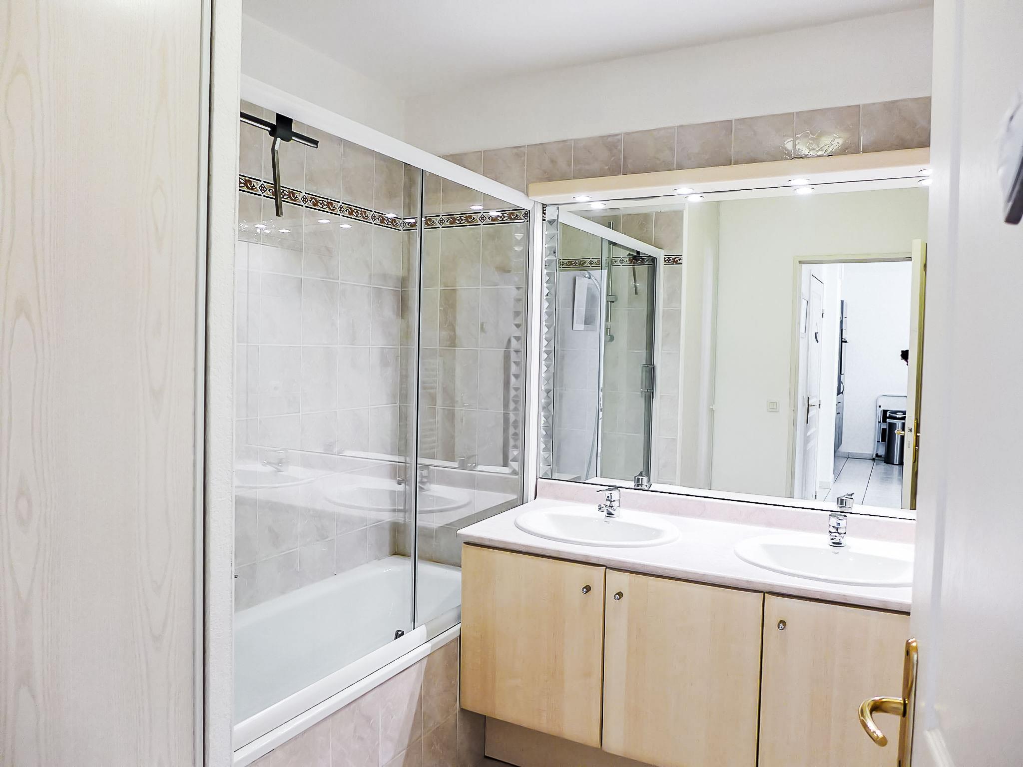 3-room apartment 48 m2 on 2nd floor. Beautiful and modern furnishings: living/dining room with TV (flat screen), fan. Exit to the terrace. 1 room with 1 french bed (180 cm, length 200 cm), fan. Exit to the terrace. 1 small room with 2 beds (80 cm, length 180 cm). Open kitchen (oven, dishwasher, 2 ceramic glass hob hotplates, toaster, kettle, microwave, freezer, electric coffee machine) with dining nook. Bathroom, sep. WC, double hand-basin. Heating. Large terrace 21 m2 partly roofed. Terrace furniture. Facilities: washing machine, dryer, iron, hair dryer. Internet (WiFi, free). Garage space n B26 (petite voiture) (1 car), height 200 cm, width 235 cm. Please note: TV only FR. Smoke alarm. Offer by a private individual according to Art. 155, IV of CGI. H2SUVY
