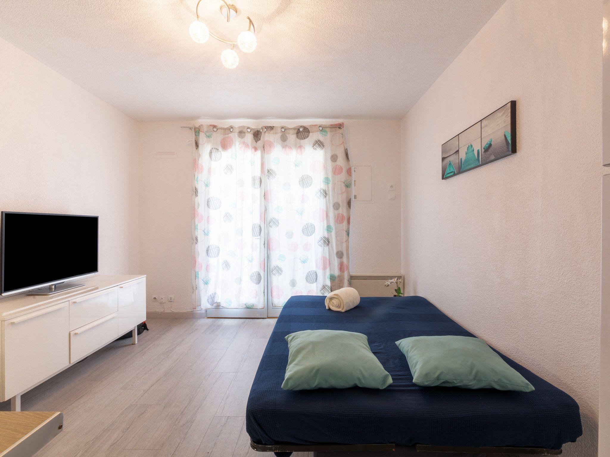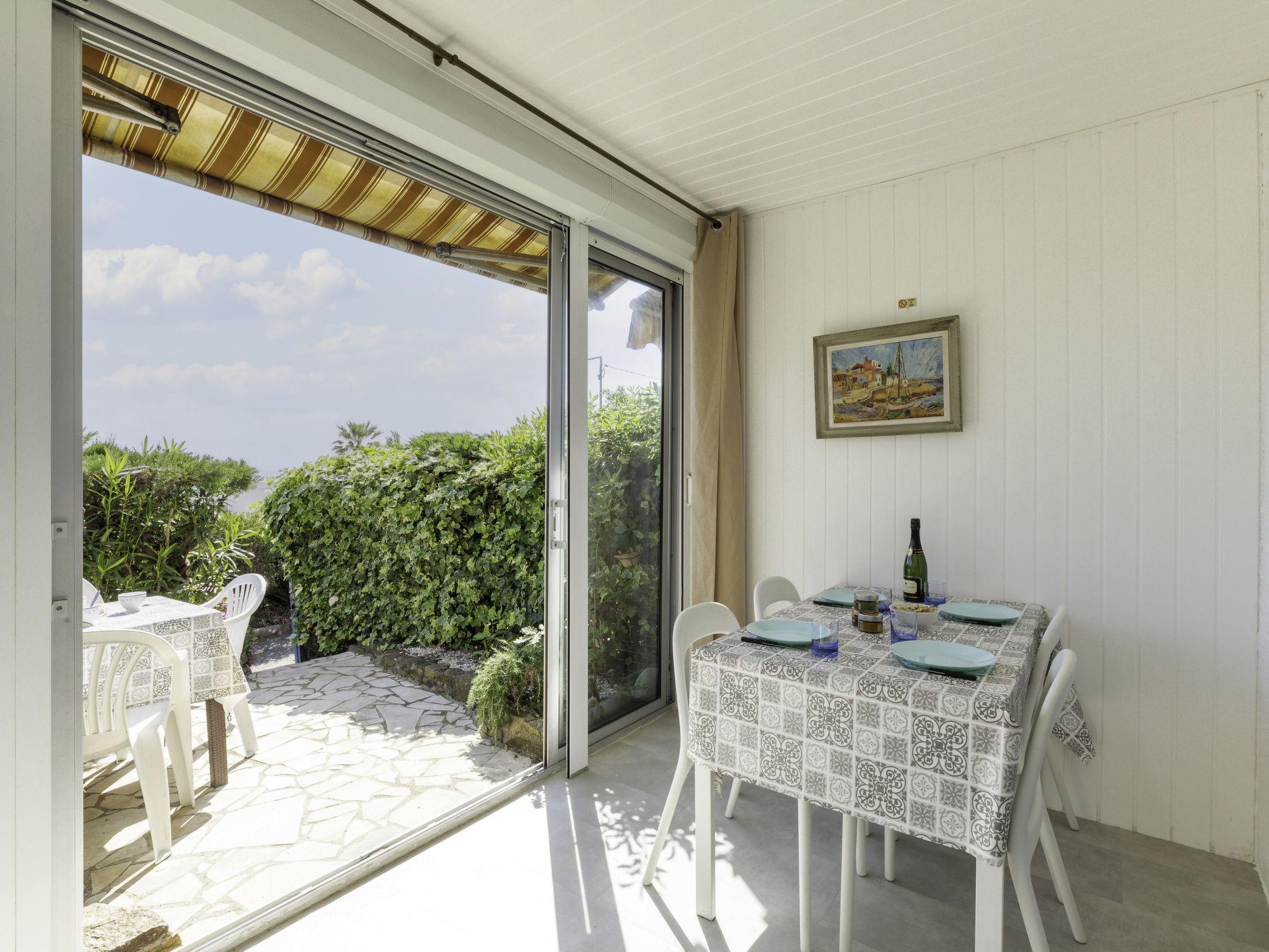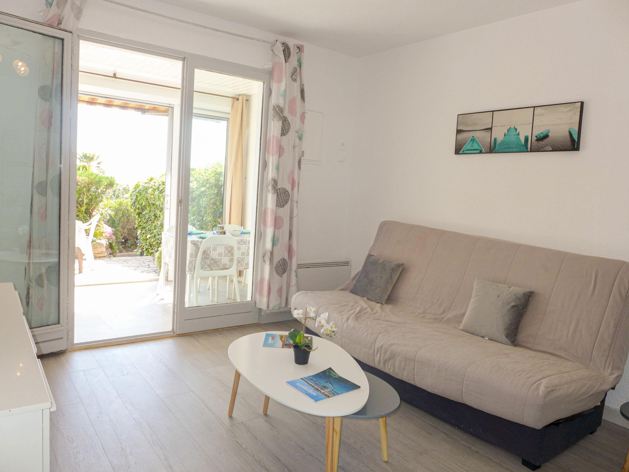 2-room apartment 26 m2, on the ground floor. Beautiful furnishings: living room with 1 double sofabed (1 x 140 cm, length 190 cm), TV (flat screen). Exit to the veranda. Dining room. Exit to the terrace. 1 room with 1 double fold-away bed (1 x 140 cm, length 190 cm), fan. Kitchenette (mini-oven, 2 ceramic glass hob hotplates, toaster, kettle, microwave, freezer, electric coffee machine, Capsules for coffee machine (SENSEO) extra). Shower, sep. WC. Electric heating. Small patio 5 m2, south facing position. Terrace furniture. Very beautiful view of the sea. Facilities: iron, hair dryer. Internet (WiFi, extra). Parking space n 53. Please note: suitable for families. 1 small pet/ dog allowed. TV only FR. Smoke alarm. 7N8WGM
