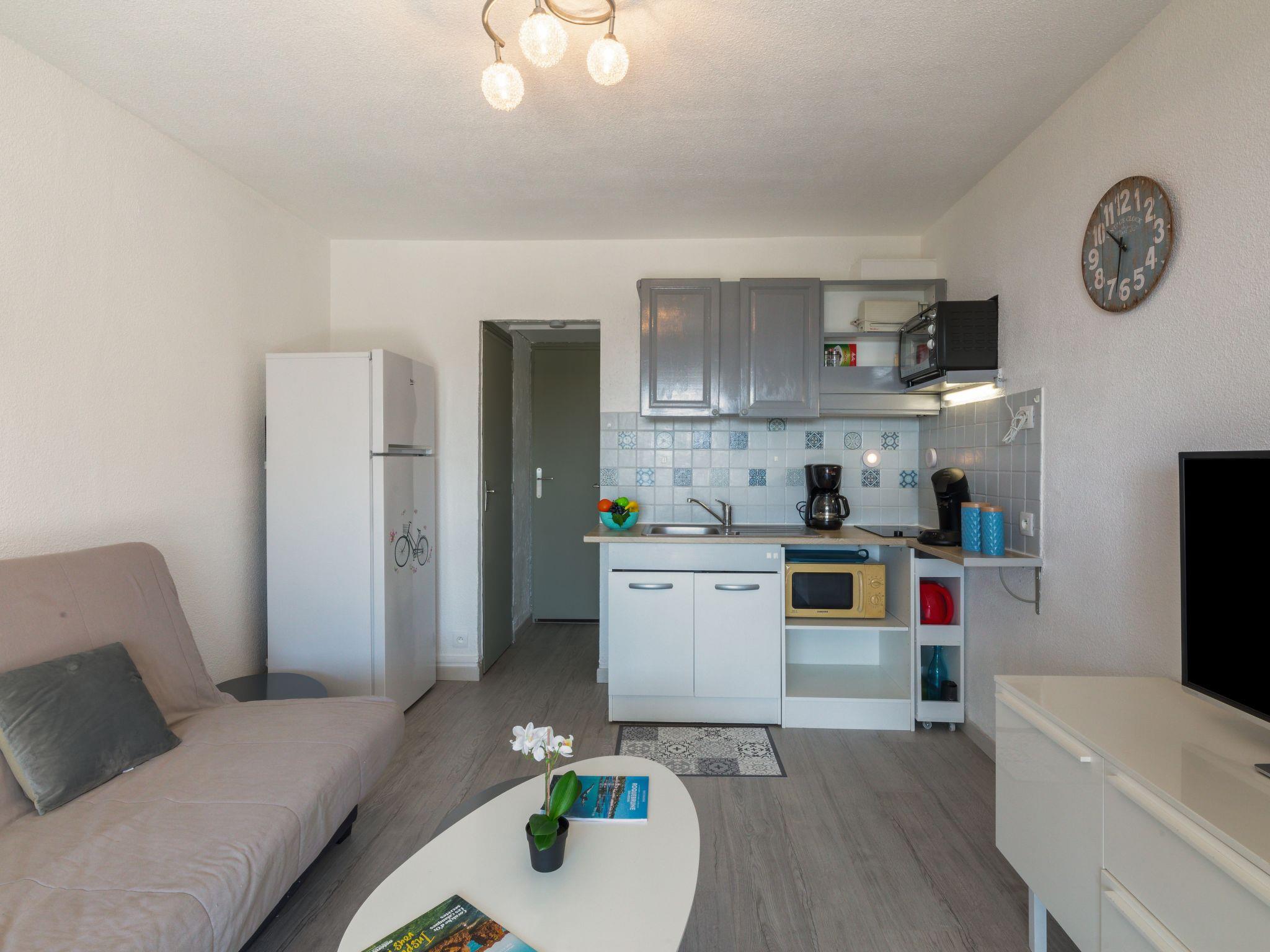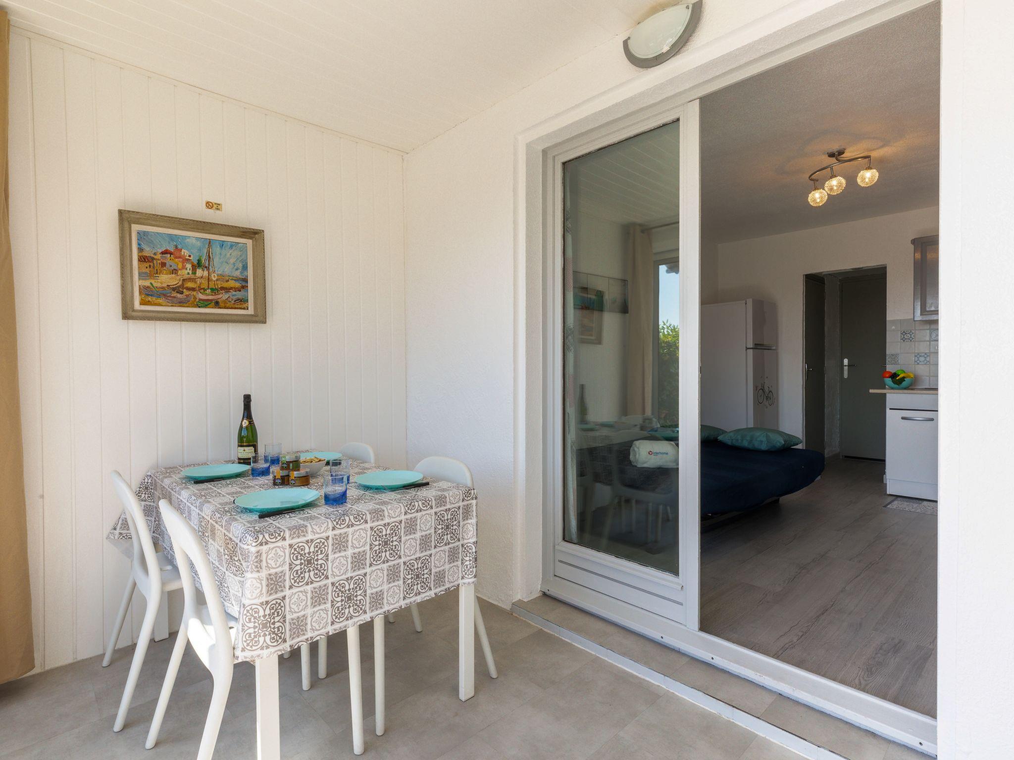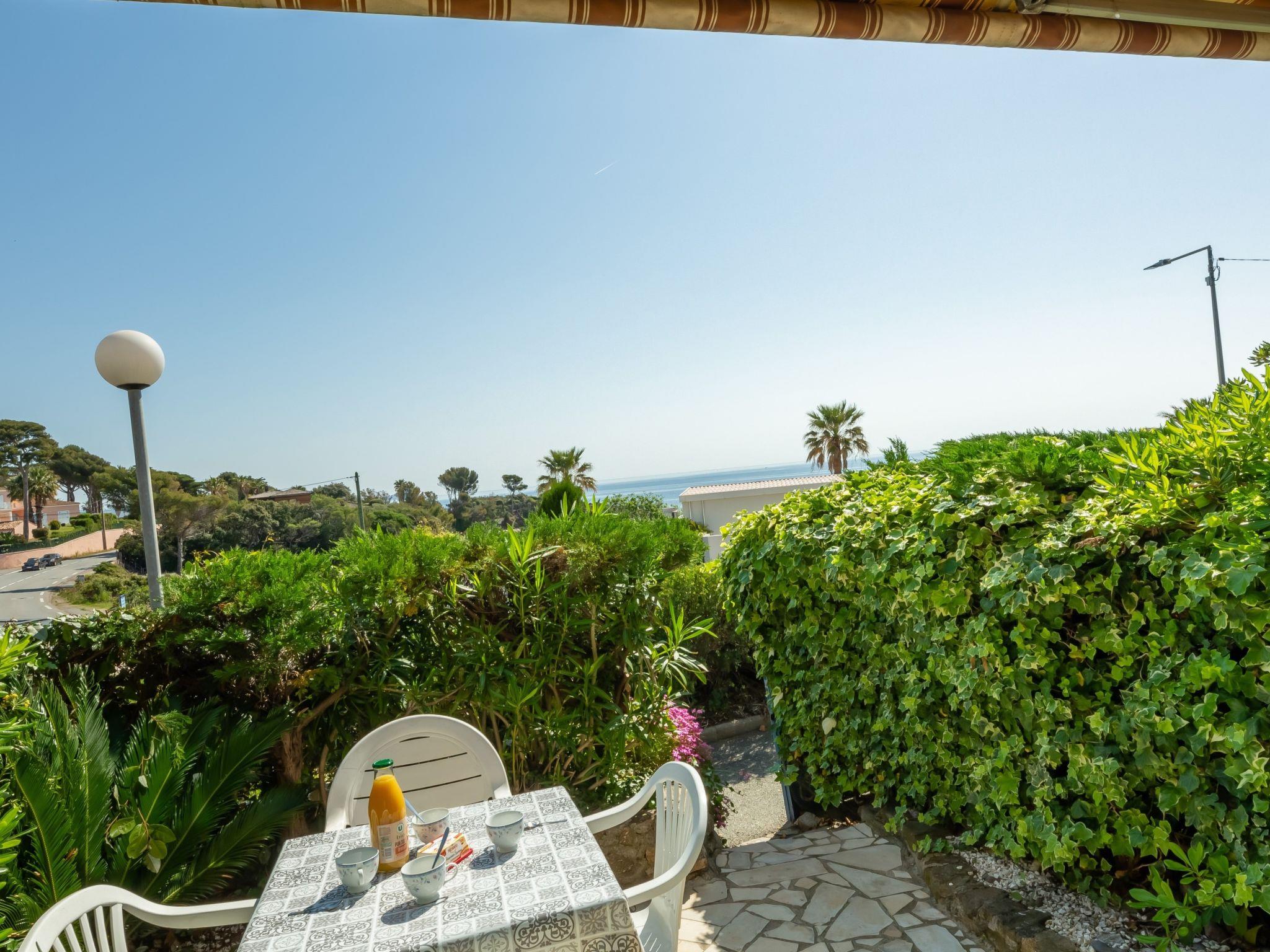2-room apartment 26 m2, on the ground floor. Beautiful furnishings: living room with 1 double sofabed (1 x 140 cm, length 190 cm), TV (flat screen). Exit to the veranda. Dining room. Exit to the terrace. 1 room with 1 double fold-away bed (1 x 140 cm, length 190 cm), fan. Kitchenette (mini-oven, 2 ceramic glass hob hotplates, toaster, kettle, microwave, freezer, electric coffee machine, Capsules for coffee machine (SENSEO) extra). Shower, sep. WC. Electric heating. Small patio 5 m2, south facing position. Terrace furniture. Very beautiful view of the sea. Facilities: iron, hair dryer. Internet (WiFi, extra). Parking space n 53. Please note: suitable for families. 1 small pet/ dog allowed. TV only FR. Smoke alarm. 7N8WGM