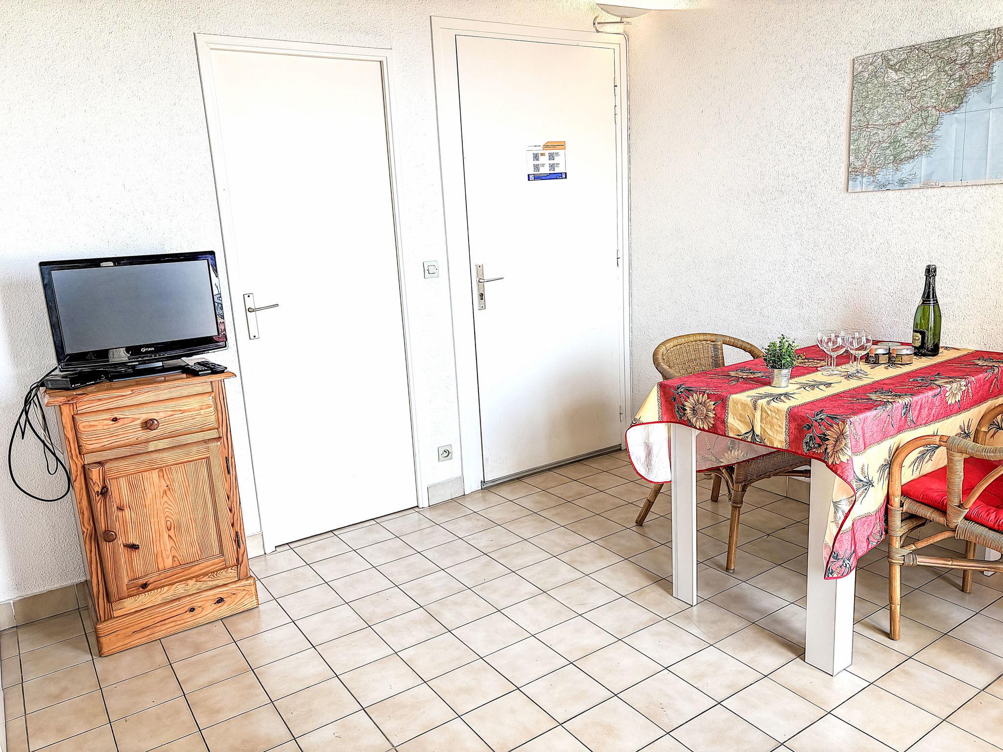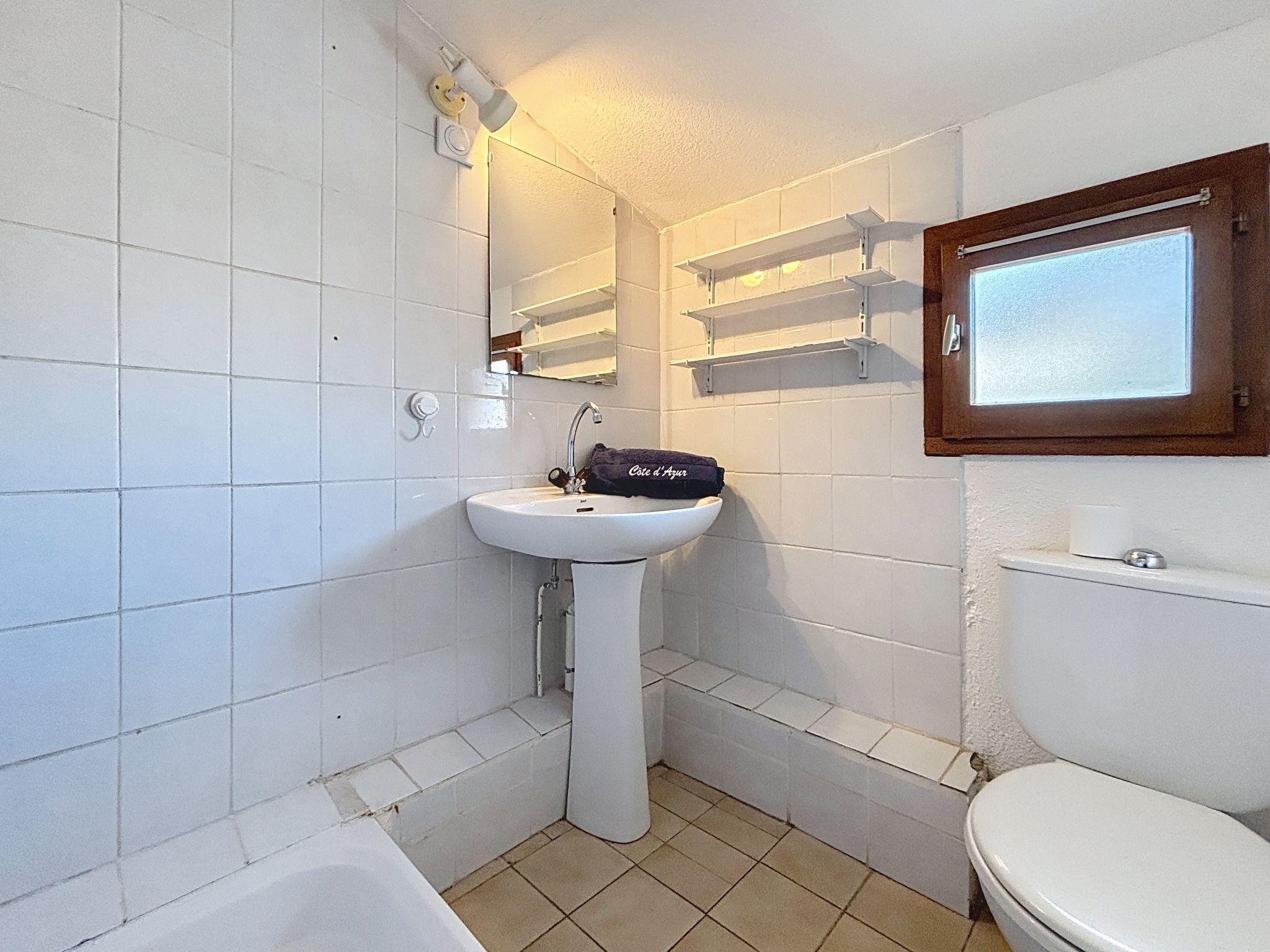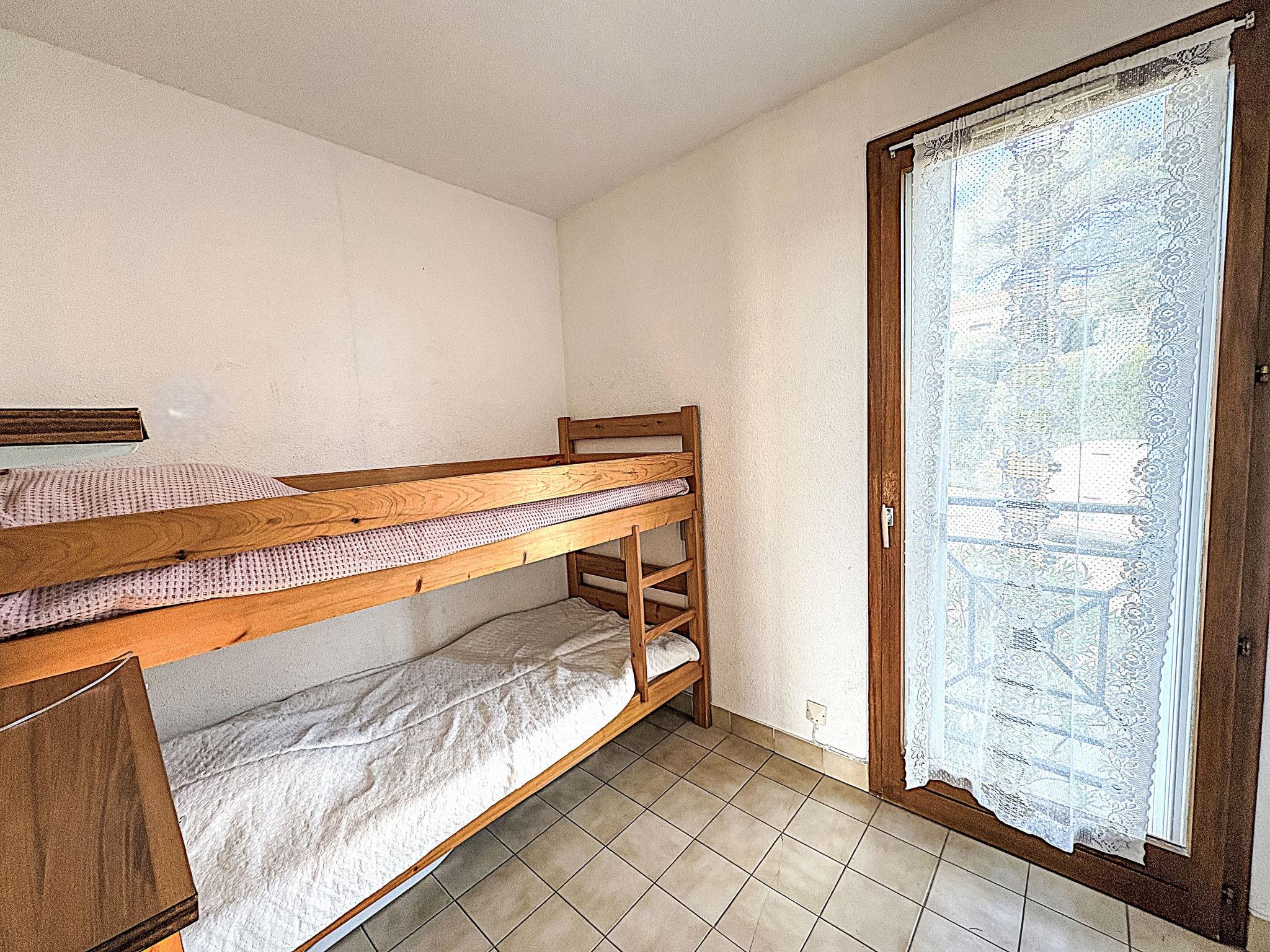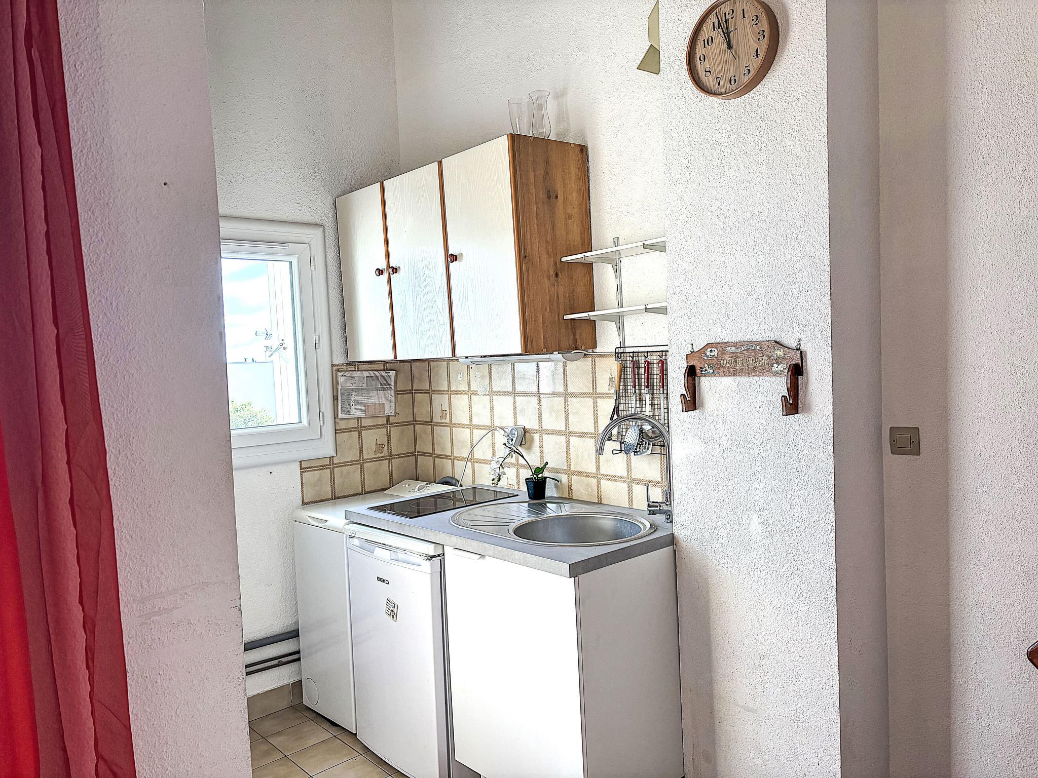 2-room apartment 32 m2 on 1st floor. Simple furnishings: living/dining room with TV (flat screen). Exit to the terrace. 1 small room with 1 x 1 bunk beds (80 cm, length 190 cm). Gallery with 1 french bed (1 x 140 cm, length 190 cm), fan. Kitchenette (4 hot plates, oven, toaster, kettle, electric coffee machine). Exit to the terrace. Shower/WC. Electric heating. Terrace 8 m2. Terrace furniture. View of the sea. Facilities: washing machine, iron. Internet (WiFi, extra). Parking (1 car). Please note: TV only FR. Smoke alarm. Offer by a private individual according to Art. 155, IV of CGI.