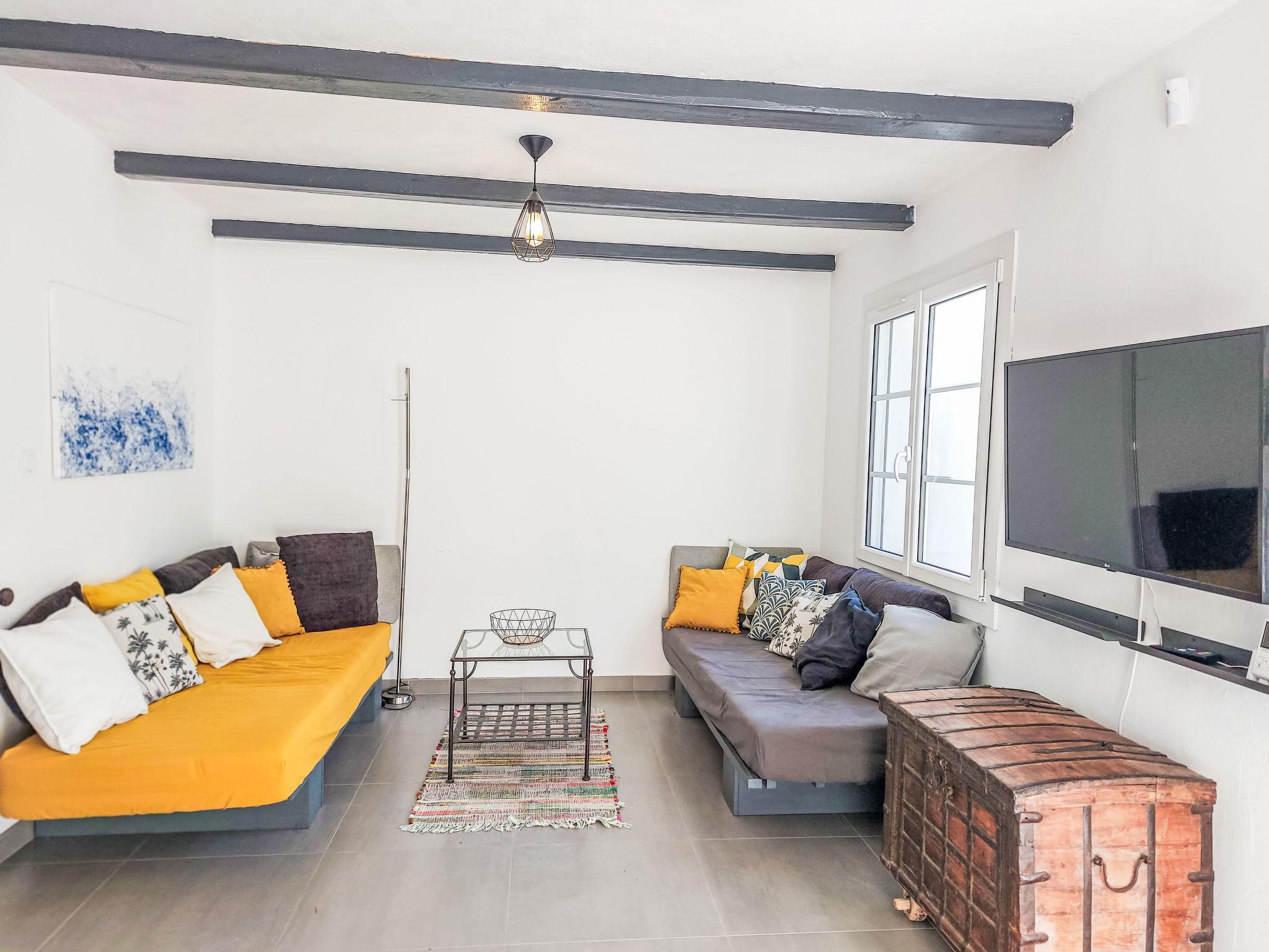 3-room house 60 m2. Living/dining room with open-hearth fireplace (only for decoration), TV, flat screen and air conditioning. Exit to the terrace. 1 room with 1 french bed (1 x 140 cm, length 190 cm), air conditioning. 1 children's room with 1 pull-out bed (2 pers. 2 x 80 cm, length 190 cm). Open kitchen (mini-oven, dishwasher, 4 induction hot plates, toaster, kettle, freezer, electric coffee machine). Shower/WC, sep. WC. Electric heating. Large terrace. Terrace furniture. Facilities: washing machine, iron, hair dryer. Internet (WiFi, free). Parking. Please note: smoke alarm. Offer by a private individual according to Art. 155, IV of CGI. 9TTRMJ