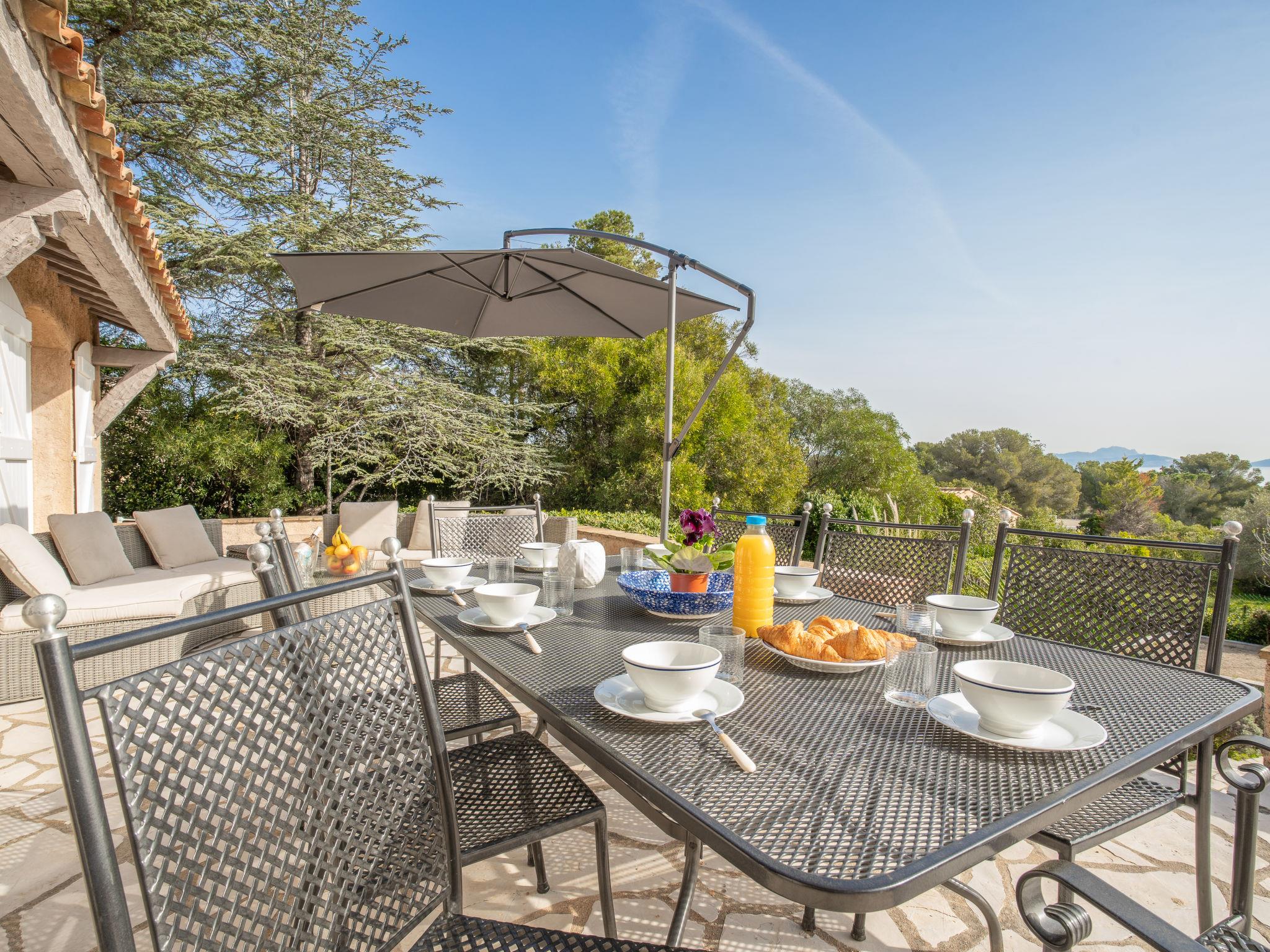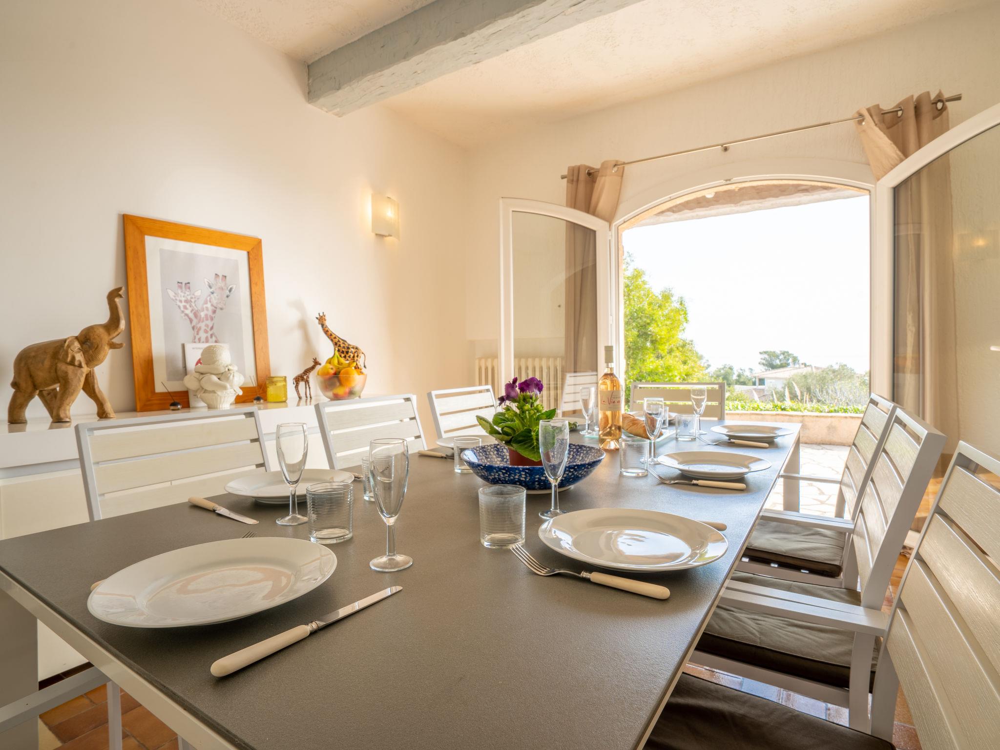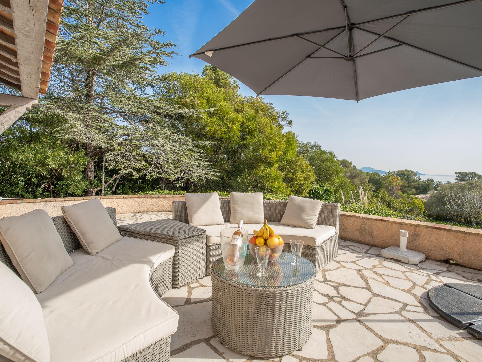 "L'Escarpe des Arbousiers", 6-room house 170 m2 on 2 levels. Bright, comfortable and tasteful furnishings: living room with dining table and satellite TV. Exit to the terrace. Open dining room with dining table. Exit to the terrace. 1 room with 2 beds (90 cm, length 190 cm). Exit to the terrace. Mezzanine. 1 room with 1 french bed (140 cm, length 190 cm), bath/WC. Exit to the balcony. 1 room with 1 french bed (160 cm, length 200 cm), shower/WC. Kitchen (oven, dishwasher, 4 ceramic glass hob hotplates, microwave, electric coffee machine). Shower/WC. Upper floor: 1 room with 1 french bed (140 cm, length 190 cm). Electric heating. Large terrace 25 m2, south-east facing position. Terrace furniture, deck chairs. Very beautiful panoramic view of the sea and the bay. Facilities: washing machine, iron, baby cot. Internet (WiFi, free). Please note: smoke alarm.