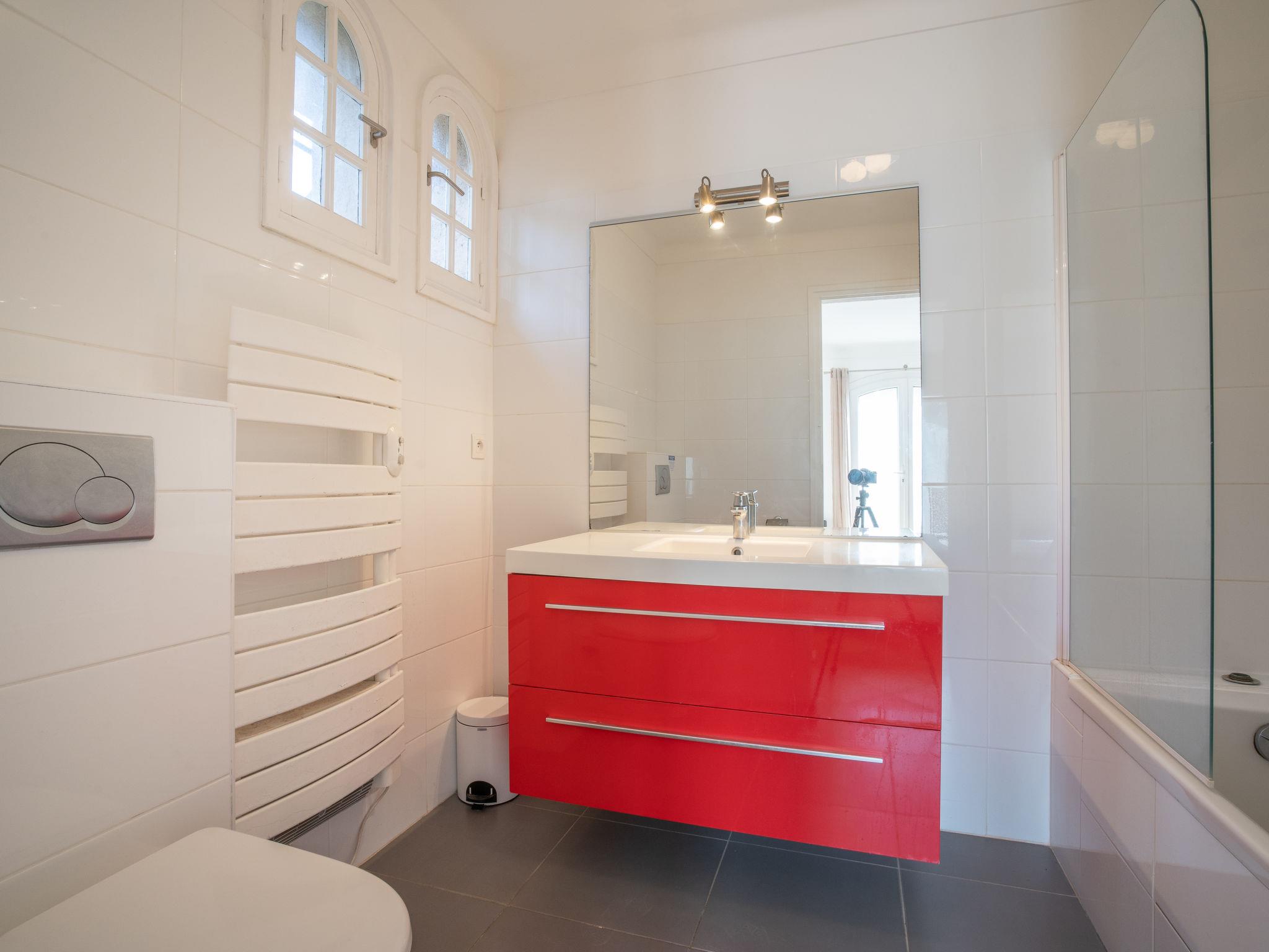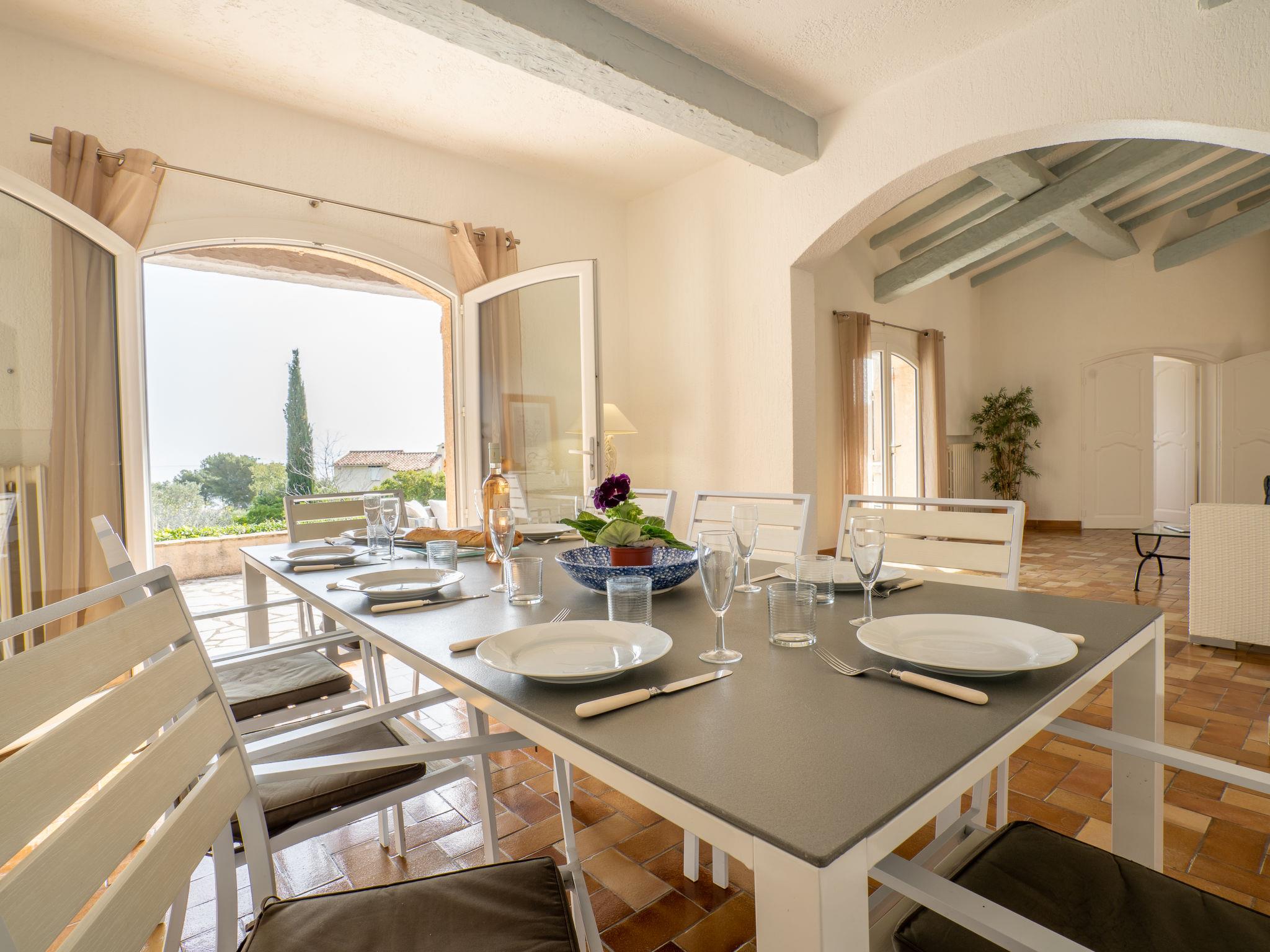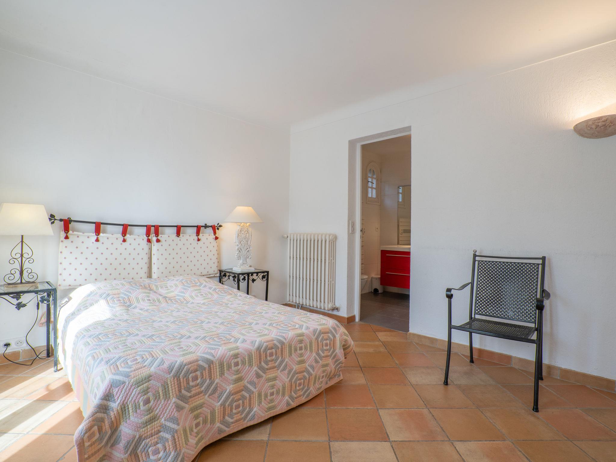 "L'Escarpe des Arbousiers", 6-room house 170 m2 on 2 levels. Bright, comfortable and tasteful furnishings: living room with dining table and satellite TV. Exit to the terrace. Open dining room with dining table. Exit to the terrace. 1 room with 2 beds (90 cm, length 190 cm). Exit to the terrace. Mezzanine. 1 room with 1 french bed (140 cm, length 190 cm), bath/WC. Exit to the balcony. 1 room with 1 french bed (160 cm, length 200 cm), shower/WC. Kitchen (oven, dishwasher, 4 ceramic glass hob hotplates, microwave, electric coffee machine). Shower/WC. Upper floor: 1 room with 1 french bed (140 cm, length 190 cm). Electric heating. Large terrace 25 m2, south-east facing position. Terrace furniture, deck chairs. Very beautiful panoramic view of the sea and the bay. Facilities: washing machine, iron, baby cot. Internet (WiFi, free). Please note: smoke alarm.