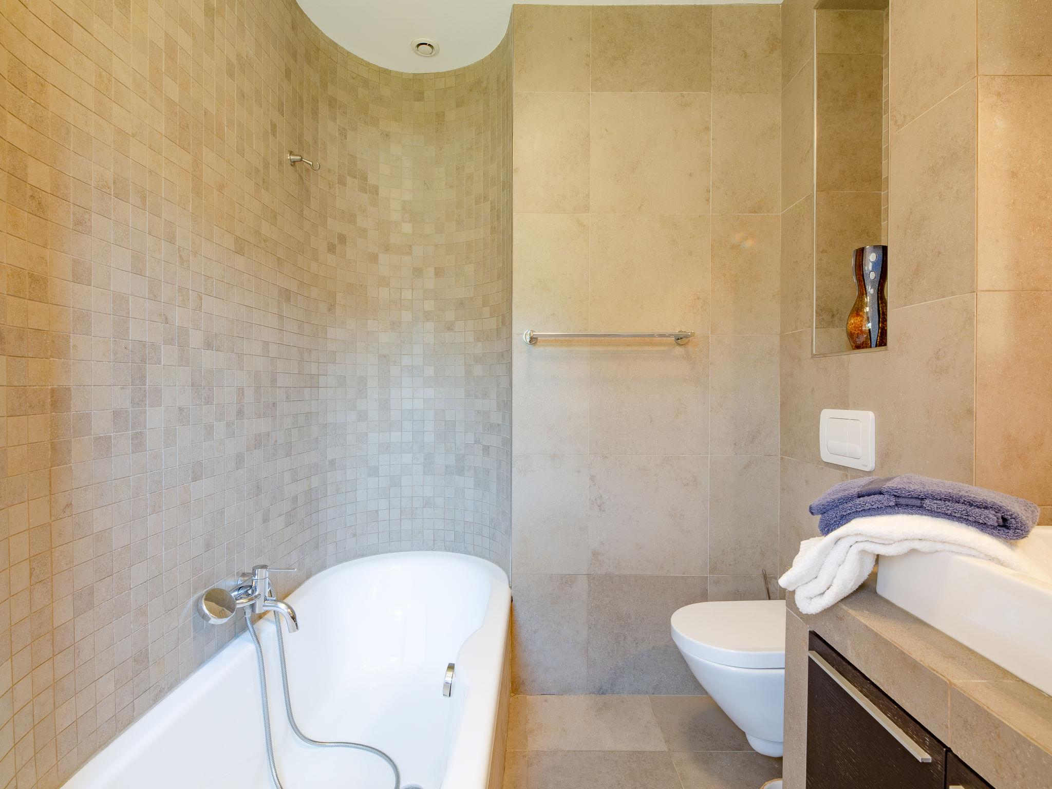 "Arbelle", 4-room house 170 m2. Bright, modern and tasteful furnishings: living/dining room with open-hearth fireplace, dining table, satellite TV and DVD. Exit to the terrace. 1 room with 2 beds (90 cm, length 200 cm). Exit to the terrace. 1 room with 1 french bed (160 cm, length 200 cm), bath/WC and double hand-basin. Exit to the terrace. 1 room with 1 french bed (160 cm, length 200 cm). Exit to the terrace. Open kitchen (oven, dishwasher, 3 ceramic glass hob hotplates, toaster, kettle, microwave, freezer, electric coffee machine). Shower, sep. WC, double hand-basin. Underfloor heating. Large terrace. Terrace furniture, barbecue (portable), deck chairs. Facilities: washing machine. Internet (WiFi, free). Please note: non-smoking house. Maximum 1 pet/ dog allowed. When there are less than the maximum number of guests staying at the property, not all of the bedrooms will be available for use. Offer by a commercial proprietor according to Art. 155, IV, CGI