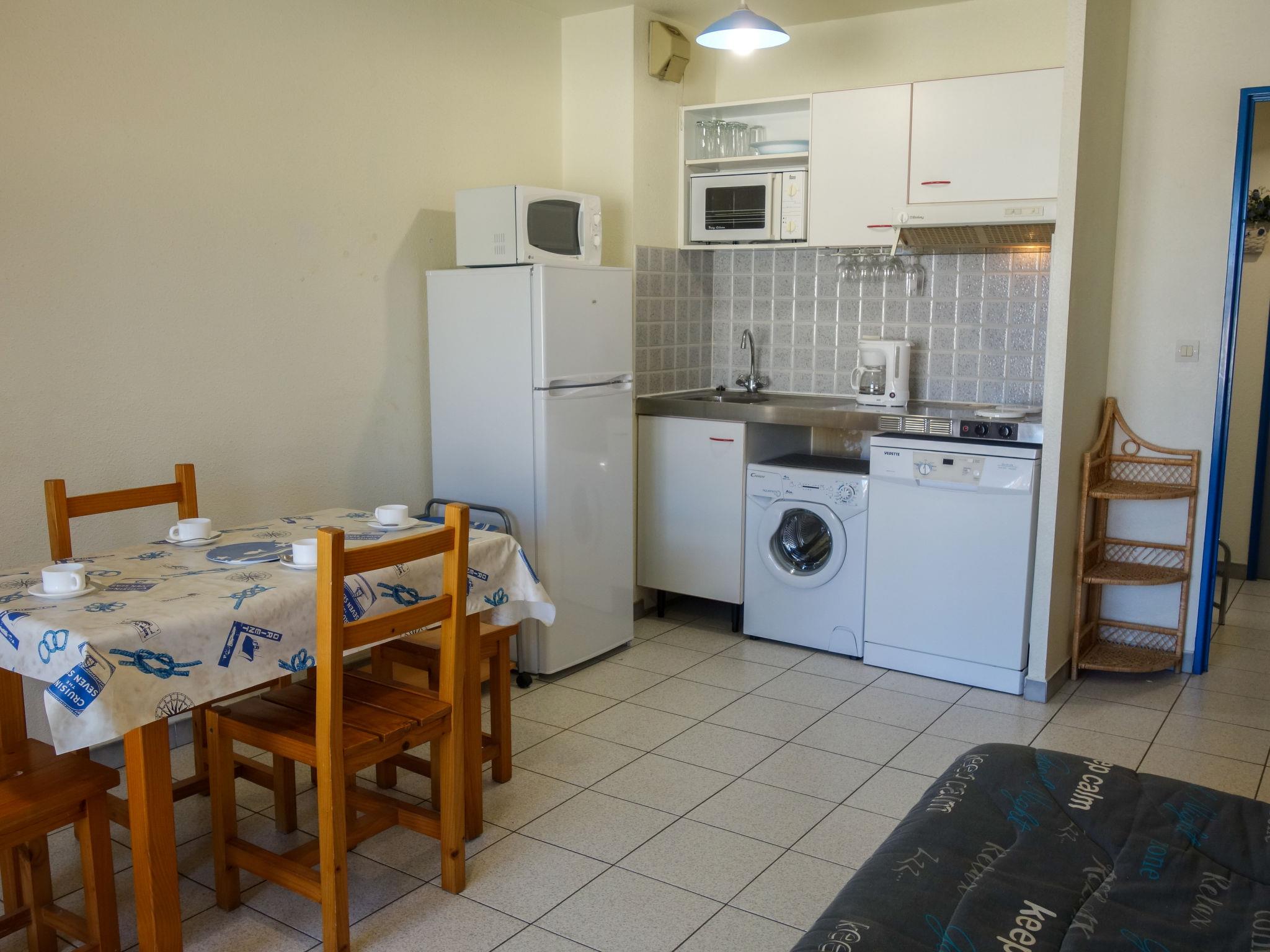2-room apartment 35 m2 on 1st floor. Living/dining room with 1 double sofabed and TV (flat screen), air conditioning. Exit to the terrace. 1 room with 1 french bed (140 cm, length 190 cm). Kitchenette (2 hot plates, mini-oven, dishwasher, microwave, freezer, electric coffee machine). Bath/WC. Terrace 10 m2, roofed, east facing position. Terrace furniture. View of the swimming pool. Facilities: washing machine, baby cot. Internet (WiFi, extra). Parking space n 103 intérieur. Please note: maximum 1 pet/ dog allowed. Smoke alarm.