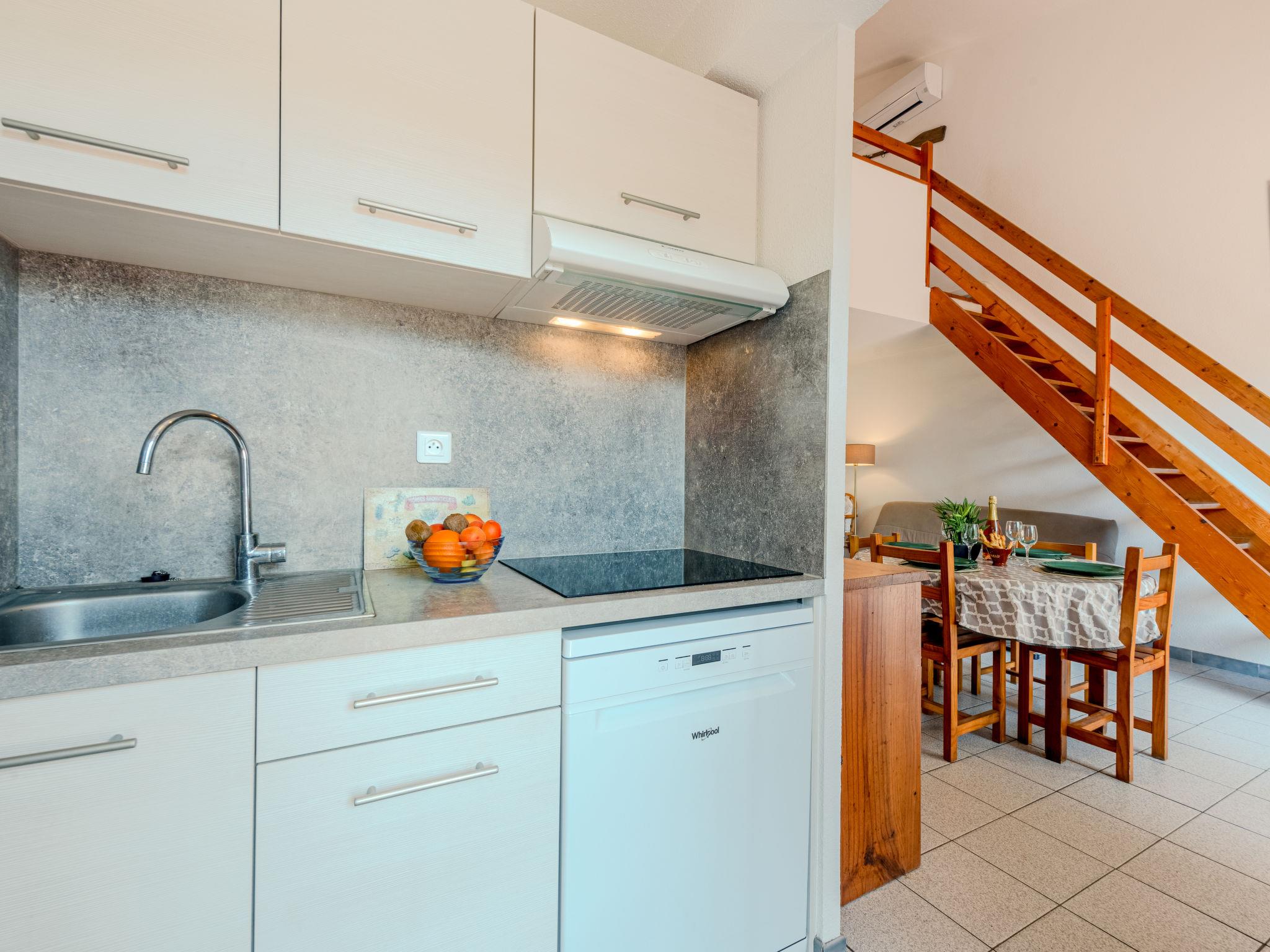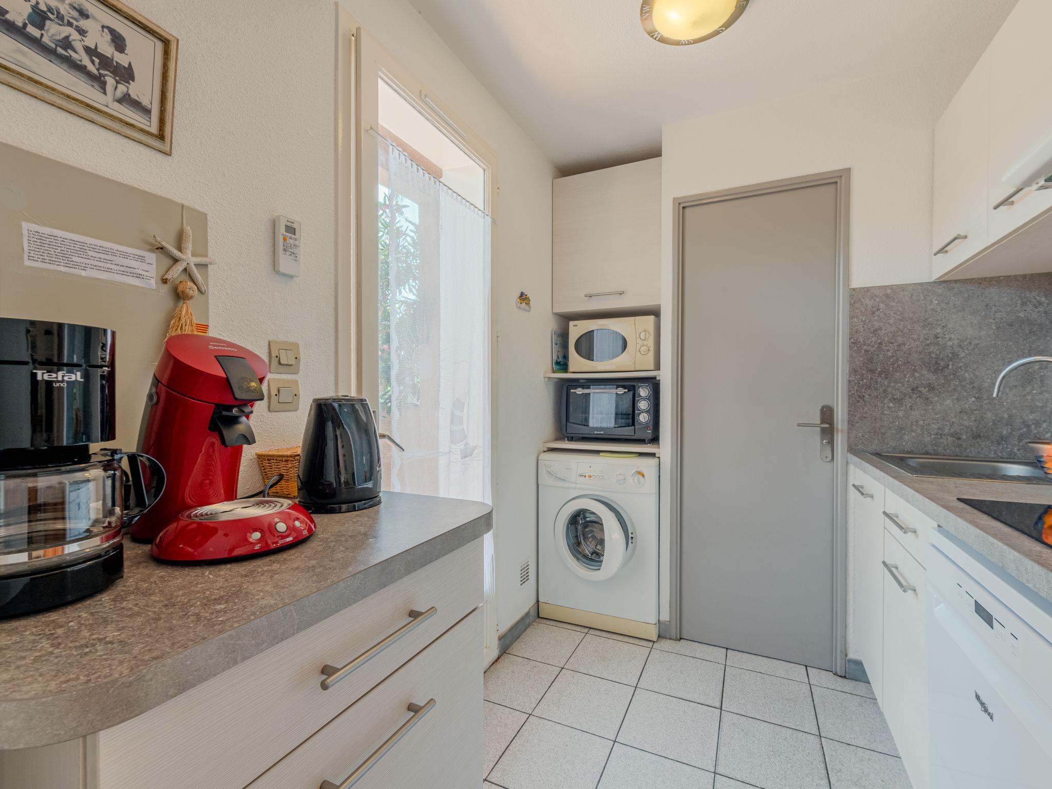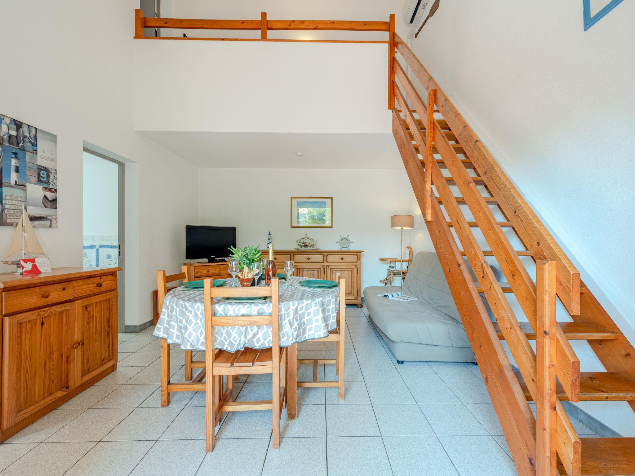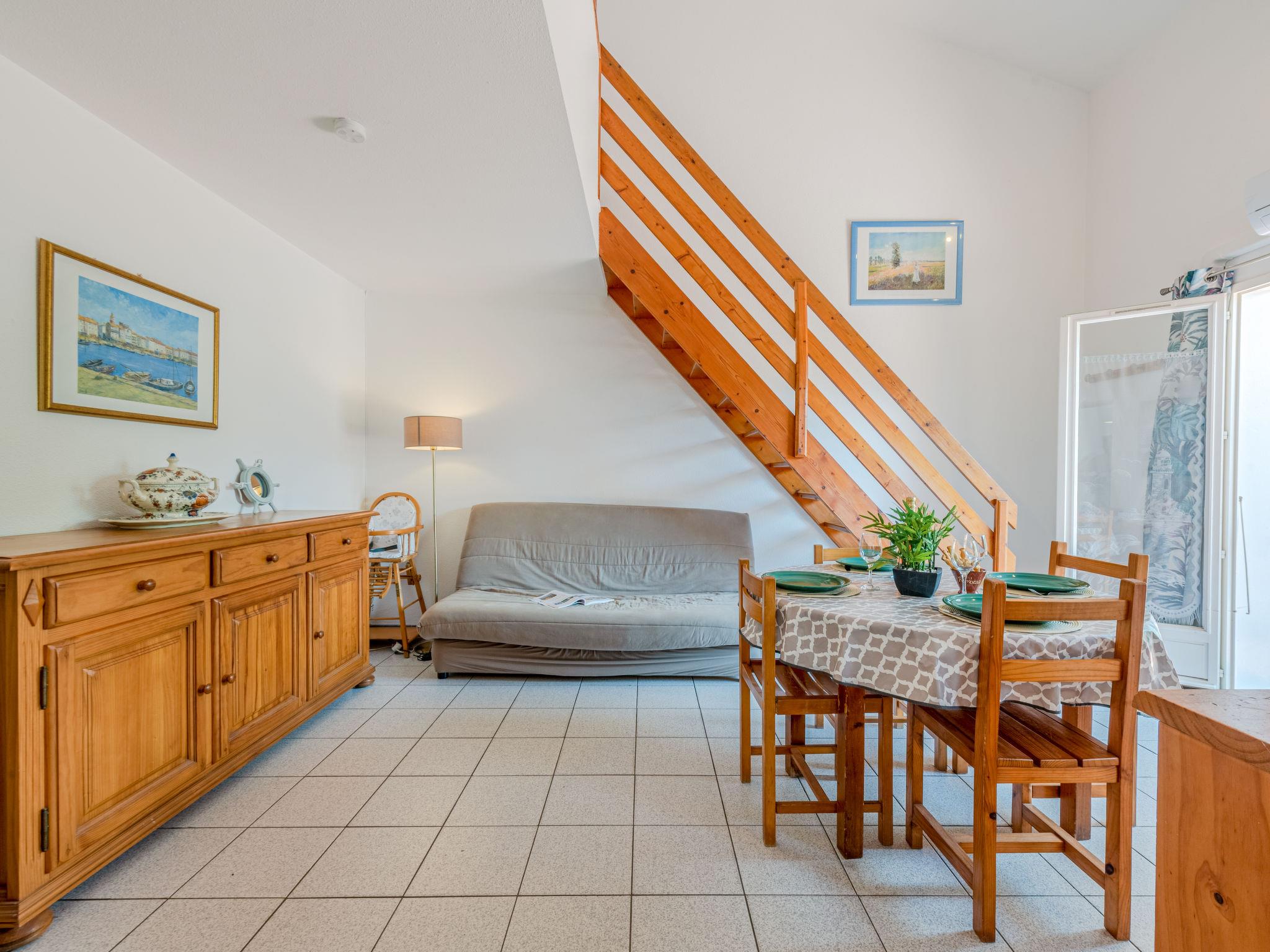 3-room terraced house 50 m2 on 2 levels. Living/dining room with 1 double sofabed. Exit to the garden, to the terrace. 1 room with 1 french bed (140 cm, length 190 cm), fan. Kitchenette (3 hot plates, oven, dishwasher, microwave, freezer). Shower/WC. Air-conditioning. Upper floor: 1 room with 1 french bed (140 cm, length 190 cm), fan. Terrace 12 m2, patio 15 m2. Barbecue. Facilities: washing machine. Internet (WiFi, extra). Parking space n 83 extérieur. Please note: smoke alarm.