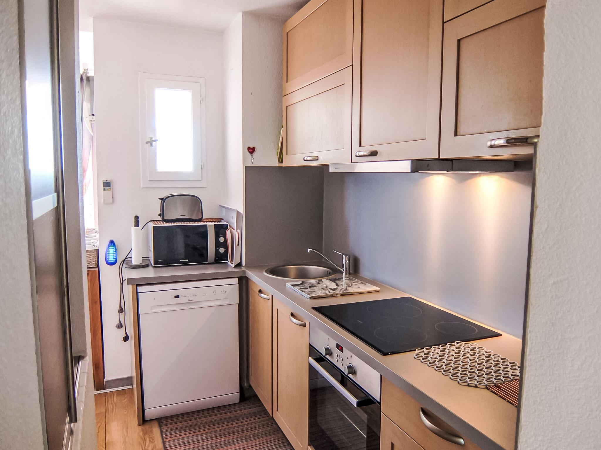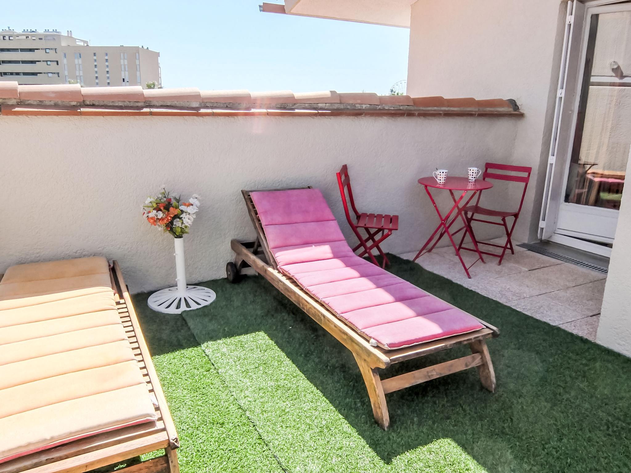 3-room apartment 50 m2 on 3rd floor. Comfortable furnishings: living/dining room with TV, DVD and air conditioning. Exit to the terrace. 1 room with 1 french bed (140 cm, length 190 cm), air conditioning. 1 room with 2 beds (90 cm, length 190 cm). Open kitchen (4 hot plates, oven, dishwasher, microwave, freezer, grill). Shower, sep. WC. Air-conditioning. Terrace 12 m2, east facing position terrace 12 m2, south facing position. Terrace furniture. Facilities: washing machine. Internet (WiFi, free). Parking space n 25 extérieur. Please note: smoke alarm, no lift.