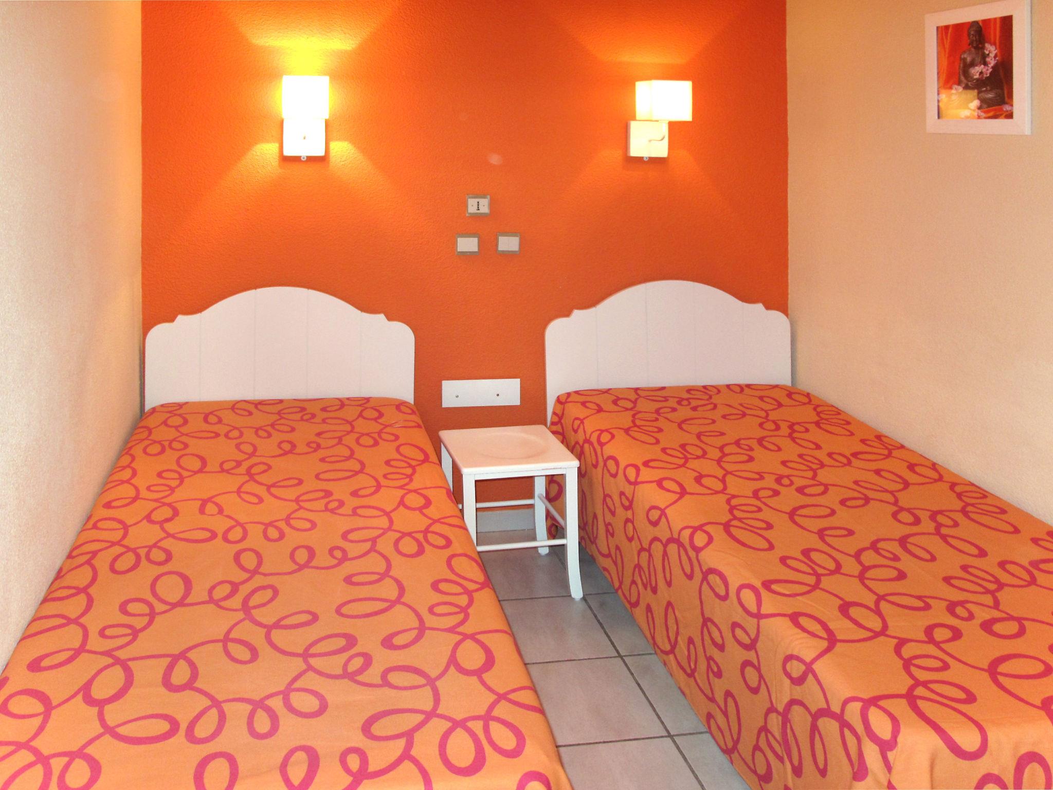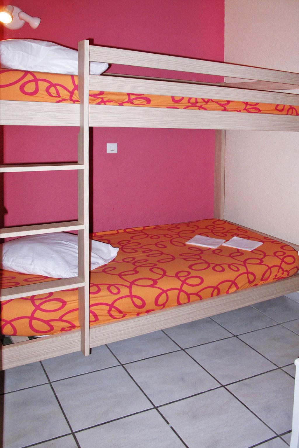 "Les Jardins de Neptune", 3-room terraced house 33 m2. Beautiful furnishings: living/dining room with dining table, TV and air conditioning. 1 room with 2 beds (80 cm). 1 room with 1 x 2 bunk beds. Kitchenette (dishwasher, 4 ceramic glass hob hotplates, microwave, freezer). Bathroom, sep. WC. Electric heating. Terrace. Terrace furniture. Facilities: safe, children's high chair, baby cot (extra). Internet (WiFi, extra). Please note: non-smokers only. Maximum 2 pets/ dogs allowed. Smoke alarm, fire extinguisher.
