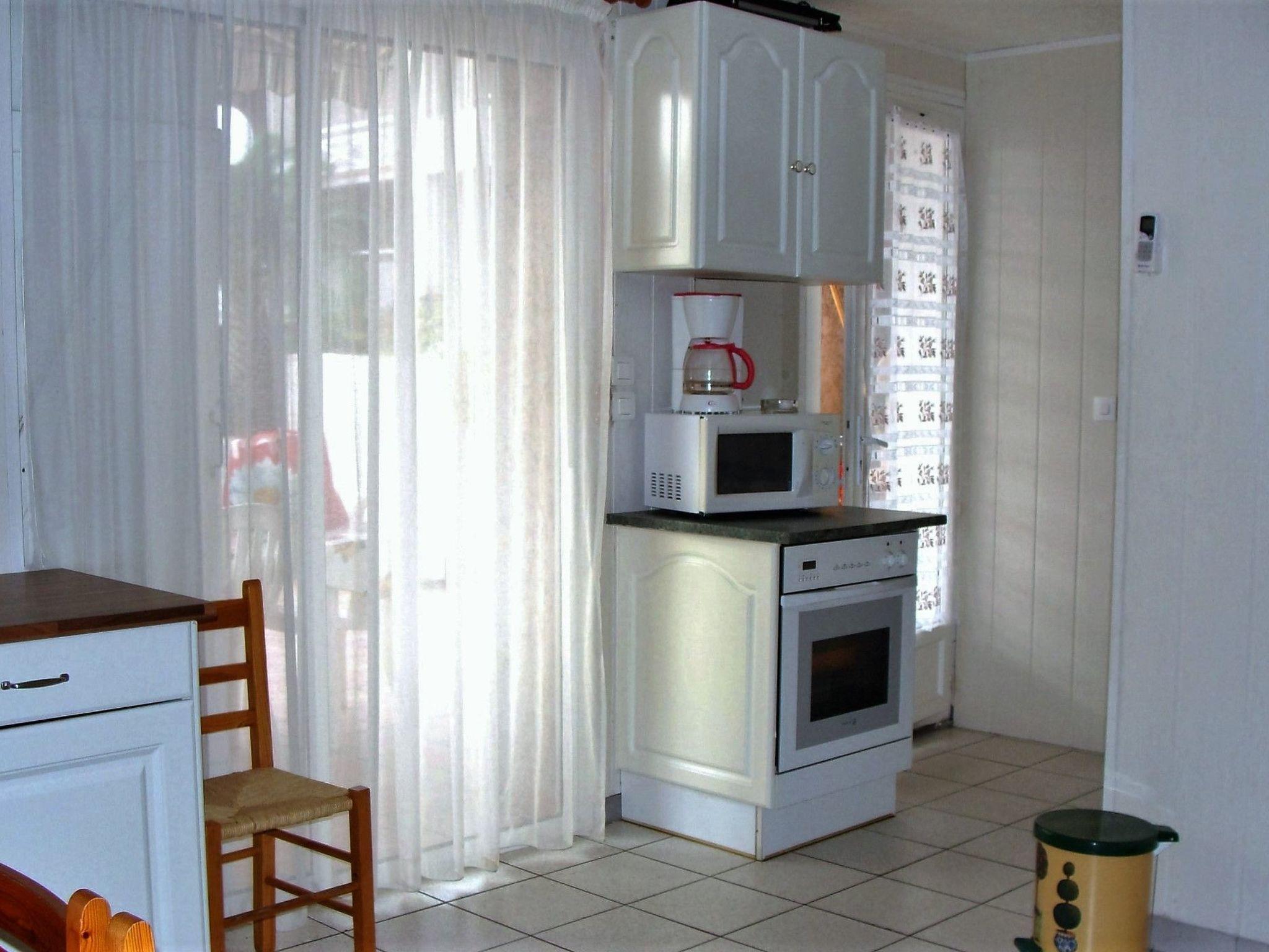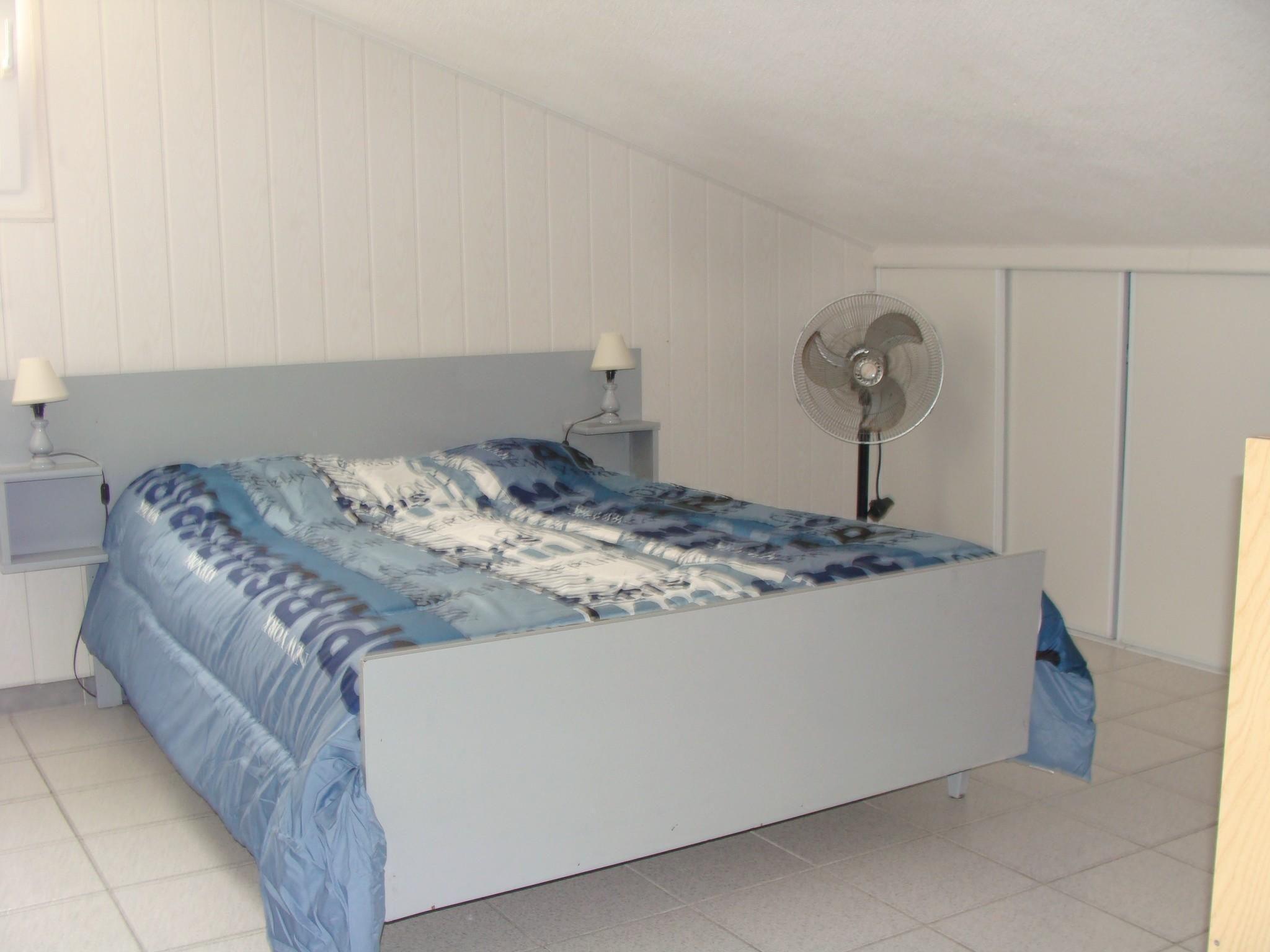 The living room on the ground floor also has a fold-out sofa bed (140cm wide when folded out) for two people. The ground floor of the holiday house also has a bedroom with a double bed (140cm wide) and a bathroom with a shower cubicle with massage jets. The toilet is in a separate room. The kitchen is equipped with a washing machine, a dishwasher, a fridge with a freezer compartment, an oven, a microwave, a ceramic hob with two rings, a toaster and an electric Plancha grill. All the rooms have electric radiators. There are ceiling fans in the bedrooms.