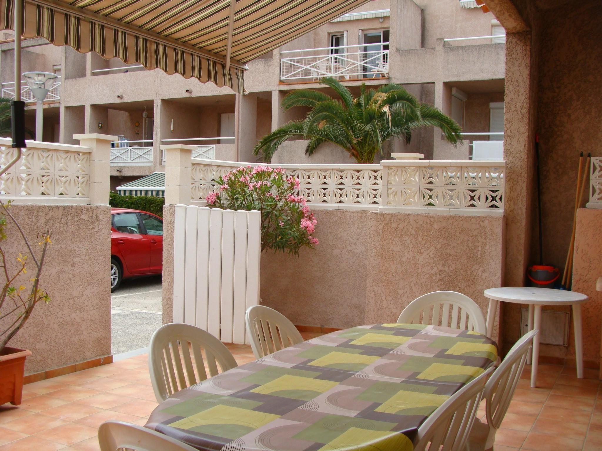 The tiled interior courtyard borders the path to the pool. Here you can find seating furniture and a traditional grill.