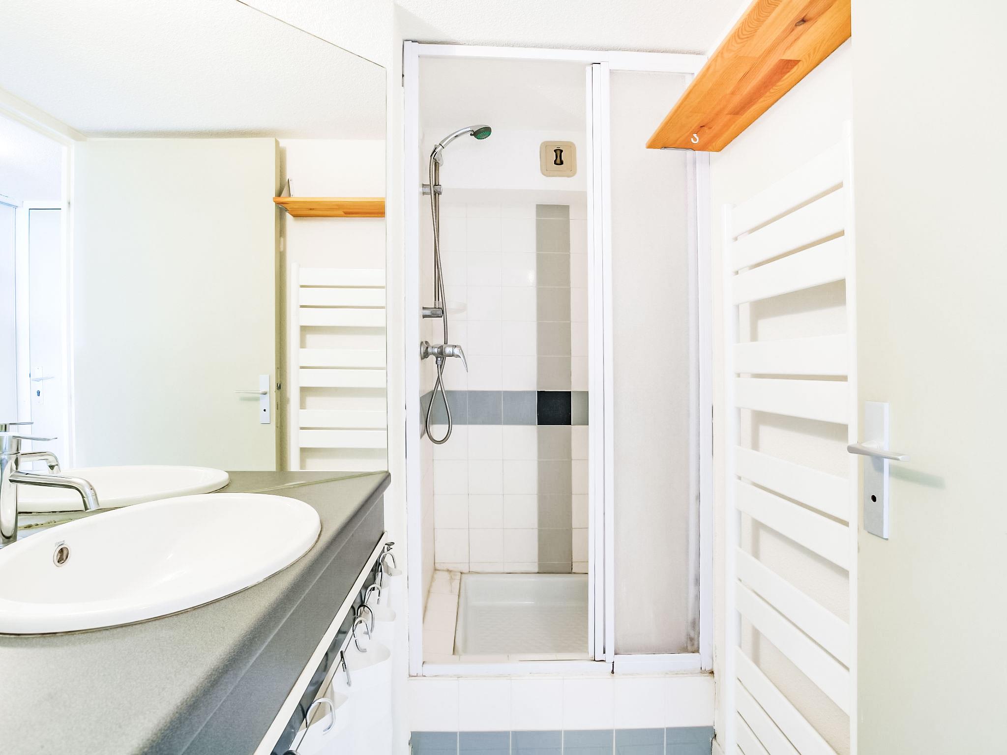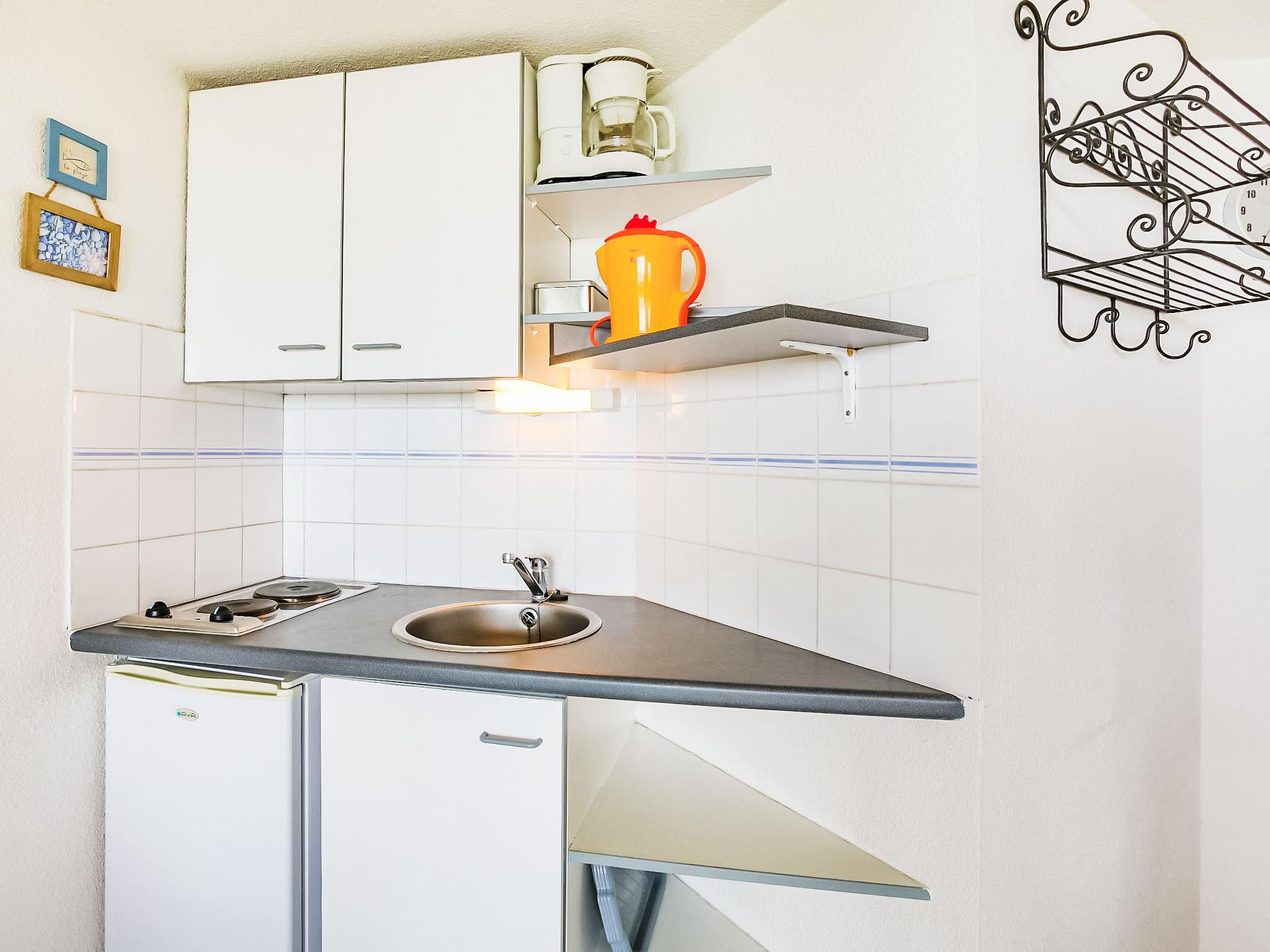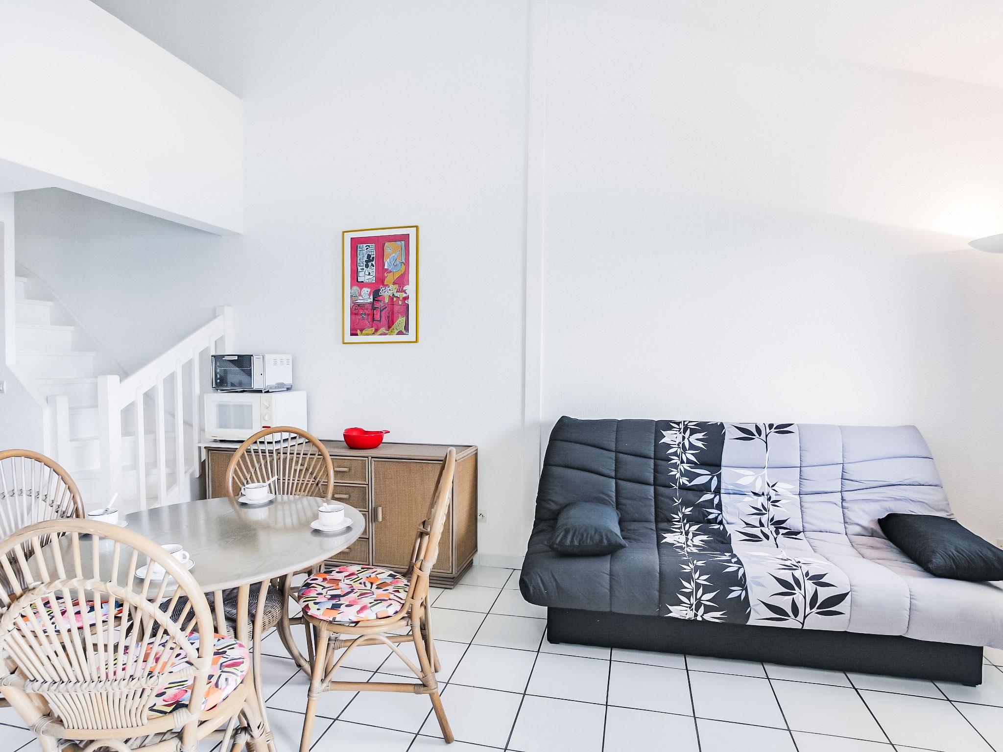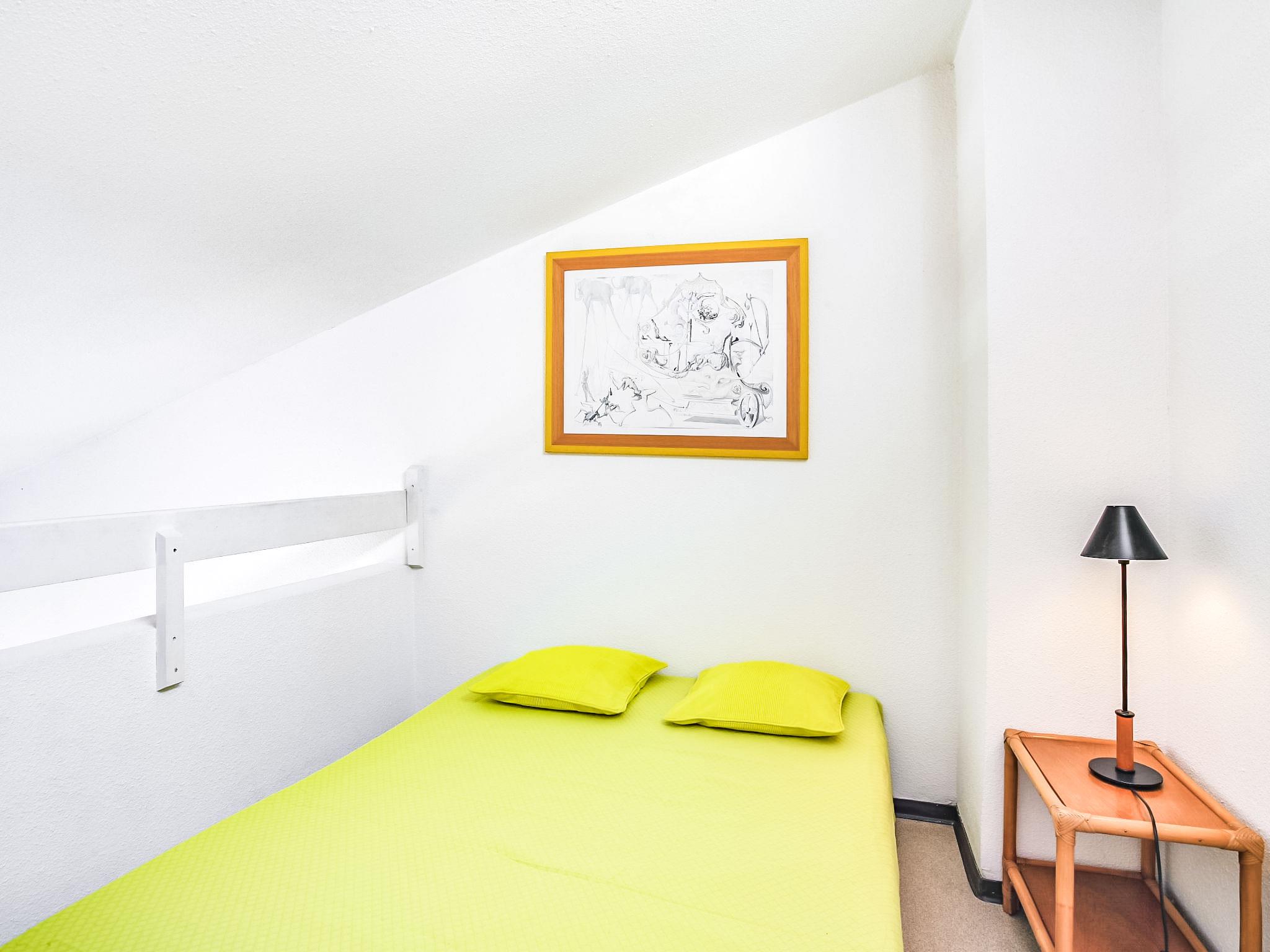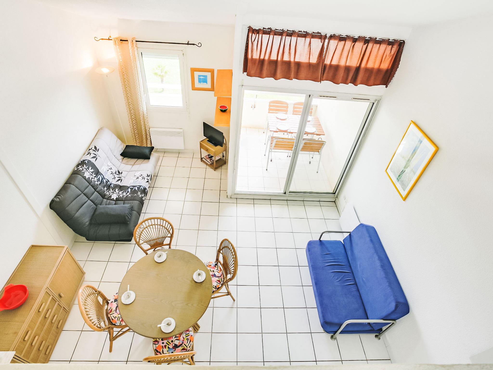 1-room studio 37 m2 on 2 levels on 3rd floor. Living/dining room with 1 double sofabed (120 cm, length 190 cm), TV (flat screen). Exit to the terrace. Kitchenette (2 hot plates, mini-oven, microwave). Shower, sep. WC. Electric heating. Upper floor: gallery, ceiling height 180 - 280 cm with 1 double sofabed (130 cm, length 190 cm). Terrace 6 m2, east facing position. Terrace furniture. Beautiful view of the sea and the swimming pool. Facilities: Internet (WiFi, extra). Parking. Please note: smoke alarm. Instead of an enclosed bedroom, some sleeping areas are located in an open-plan area (gallery, alcove, etc.).