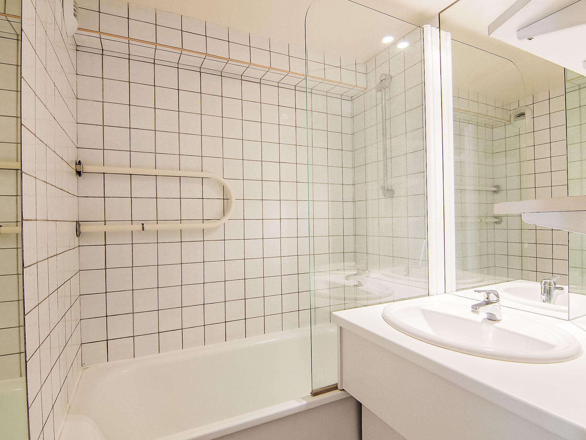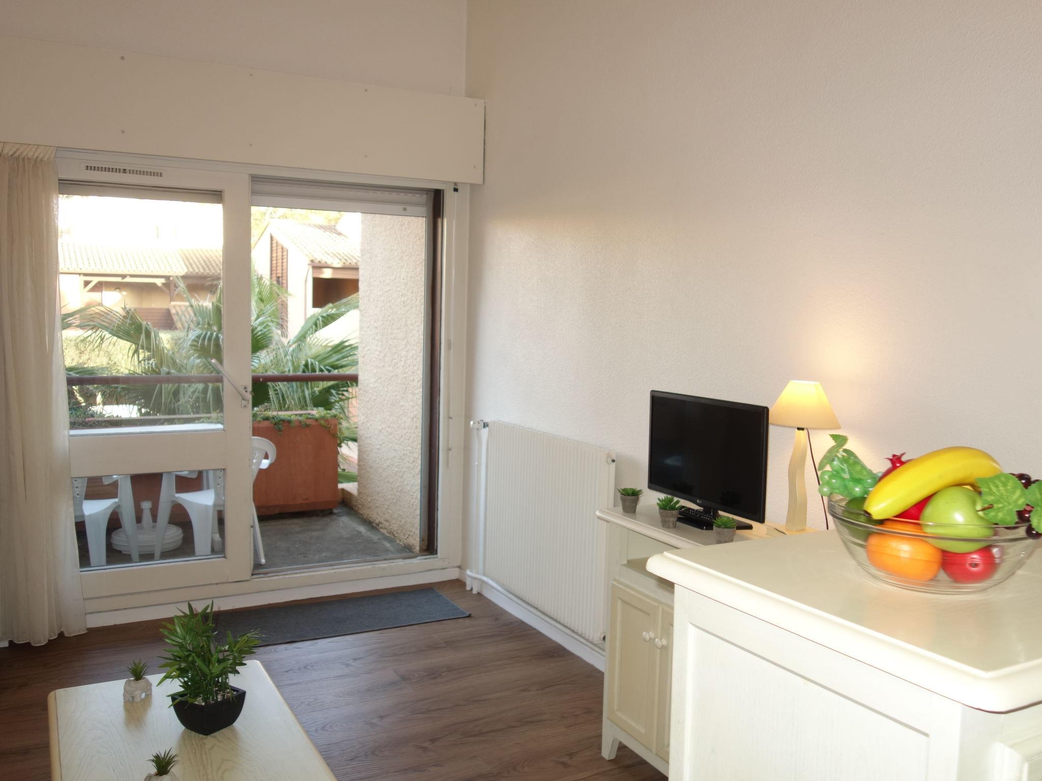 1-room studio 28 m2 on 1st floor. Entrance hall with 1 bed (70 cm, length 180 cm). Living/dining room with 1 pull-out bed (2 pers. 2 x 80 cm, length 195 cm), TV (flat screen). Exit to the terrace. Kitchenette (dishwasher, 3 ceramic glass hob hotplates, toaster, kettle, microwave, freezer, electric coffee machine). Bathroom, sep. WC. Heating. Terrace 10 m2, east facing position. Terrace furniture. View of the swimming pool. Facilities: Internet (WiFi, extra). Please note: smoke alarm.